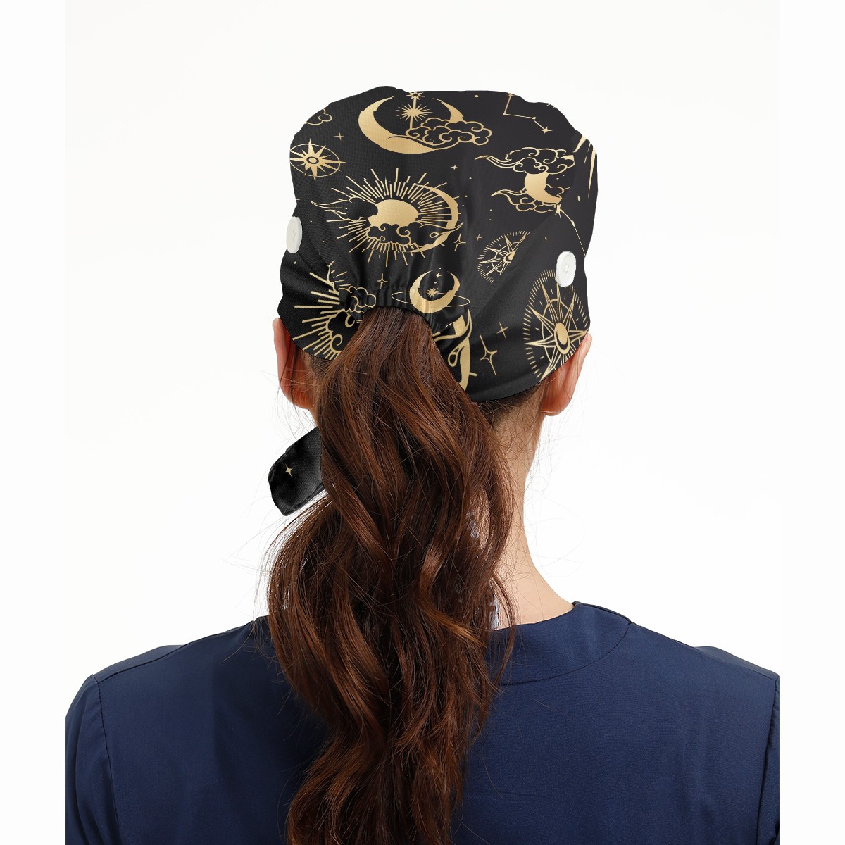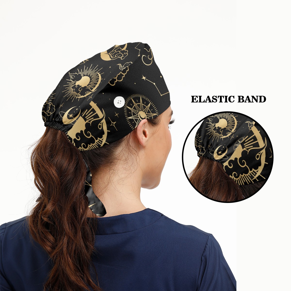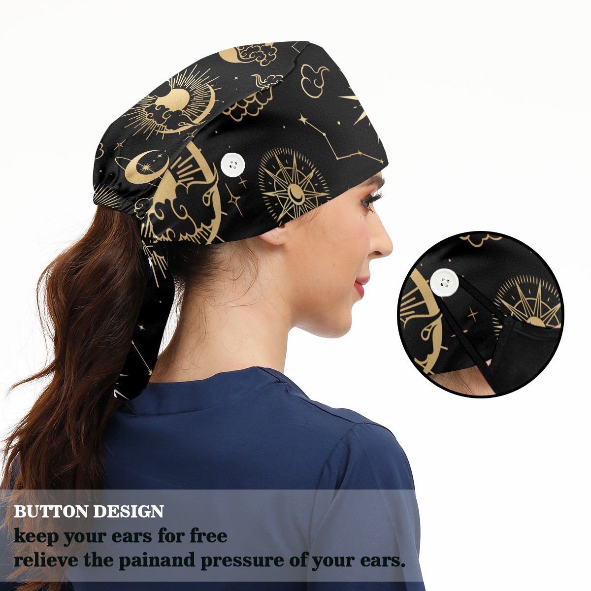 Working Caps with Button & Sweatband Satin Lined Cotton Adjustable Nurse Hats Elastic Band Scrub Cap Surgeon Hat Retro Moon Sun Stars Clouds