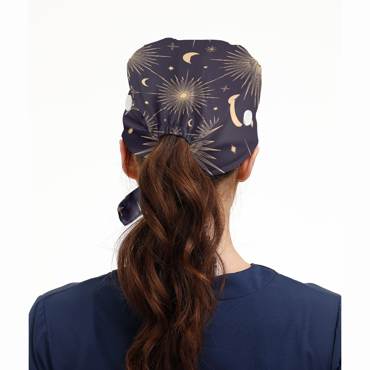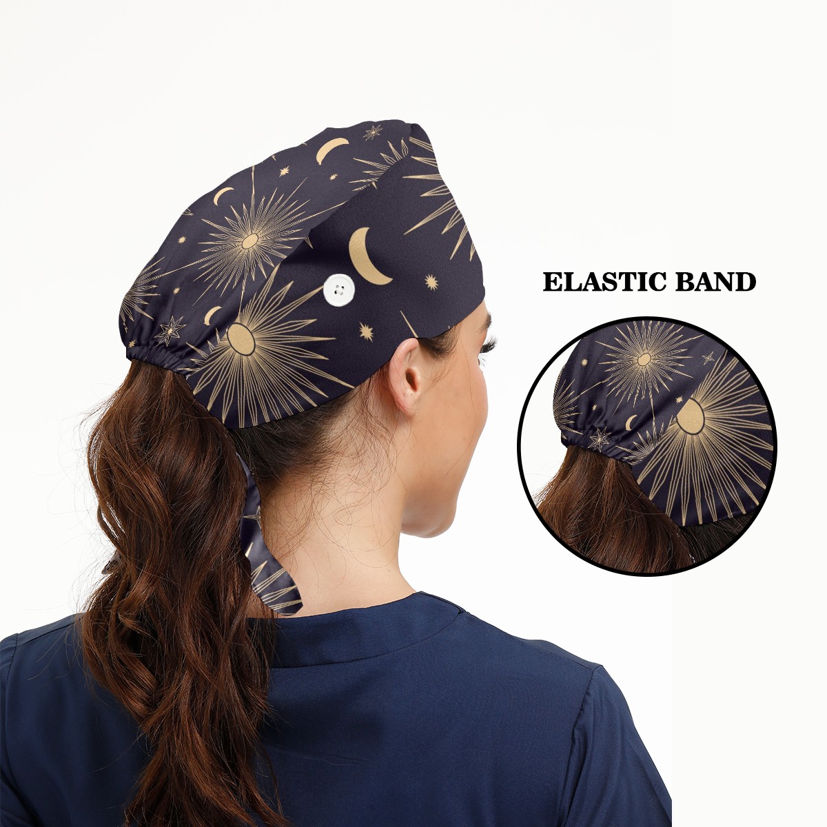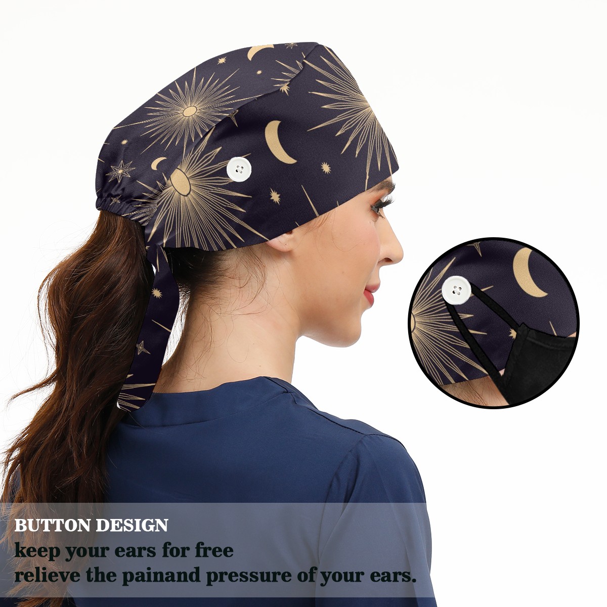 Working Caps with Button & Sweatband Satin Lined Cotton Adjustable Nurse Hats Elastic Band Scrub Cap Surgeon Hat Magic Sun Moon Star Galaxy
