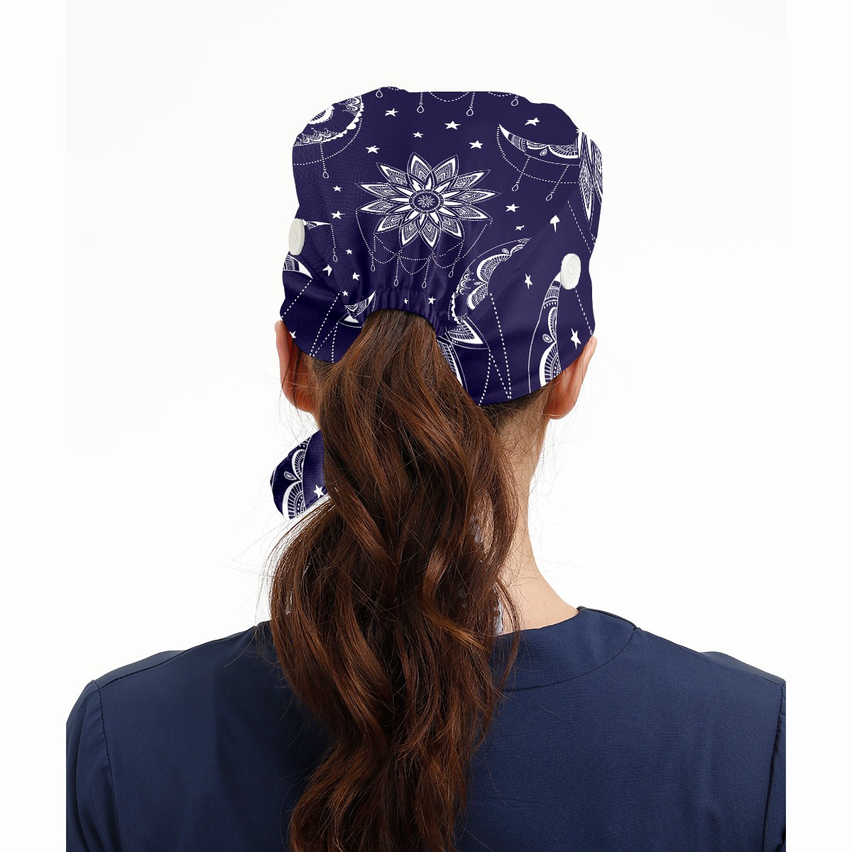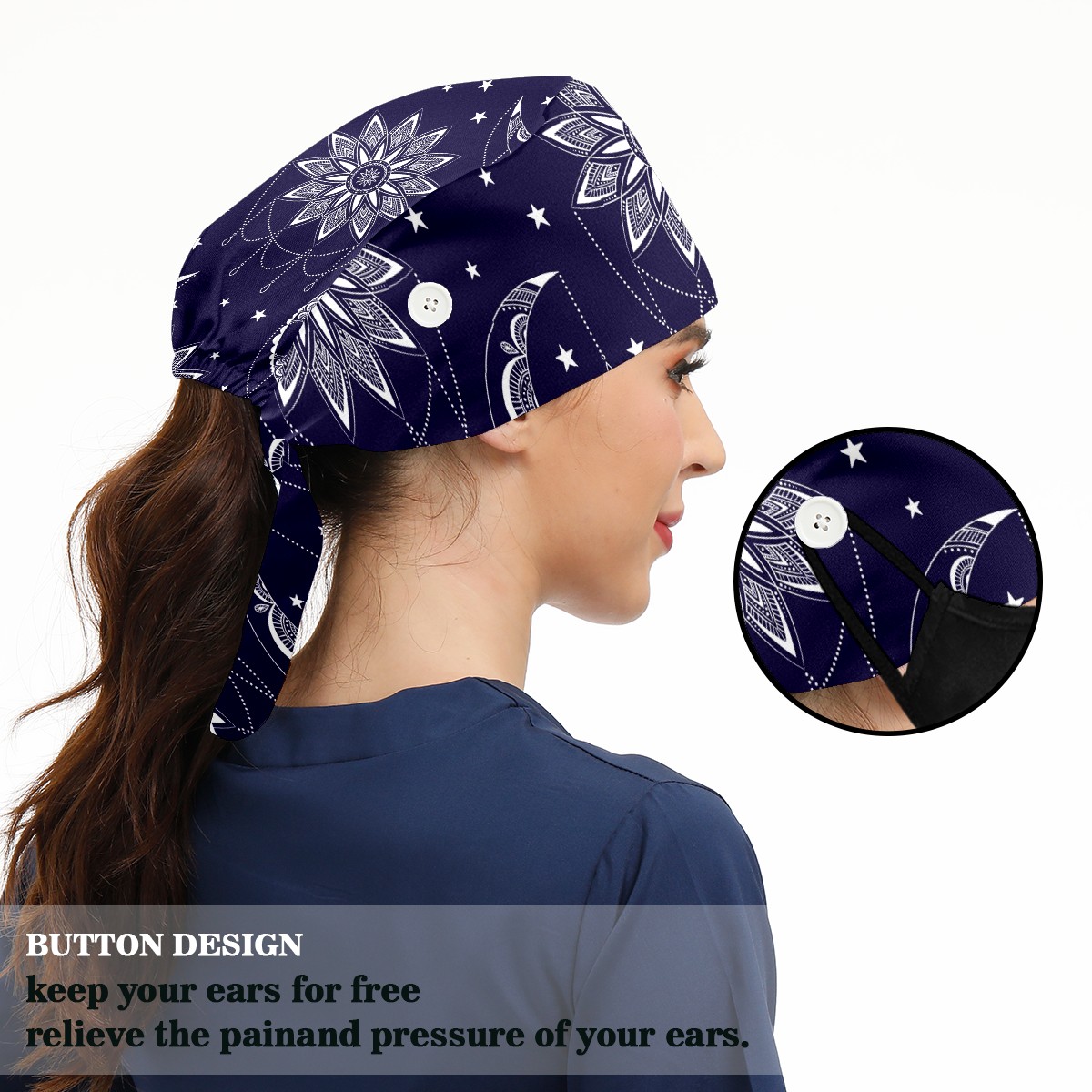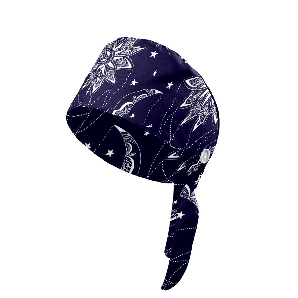 Working Caps with Button & Sweatband Satin Lined Cotton Adjustable Nurse Hats Elastic Band Scrub Cap Surgeon Hat Abstract Boho Moon Sun Stars
