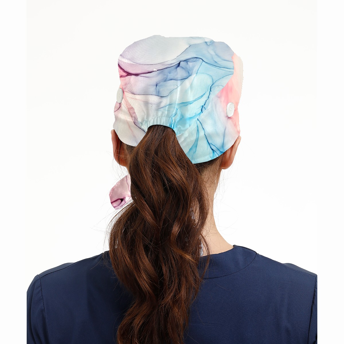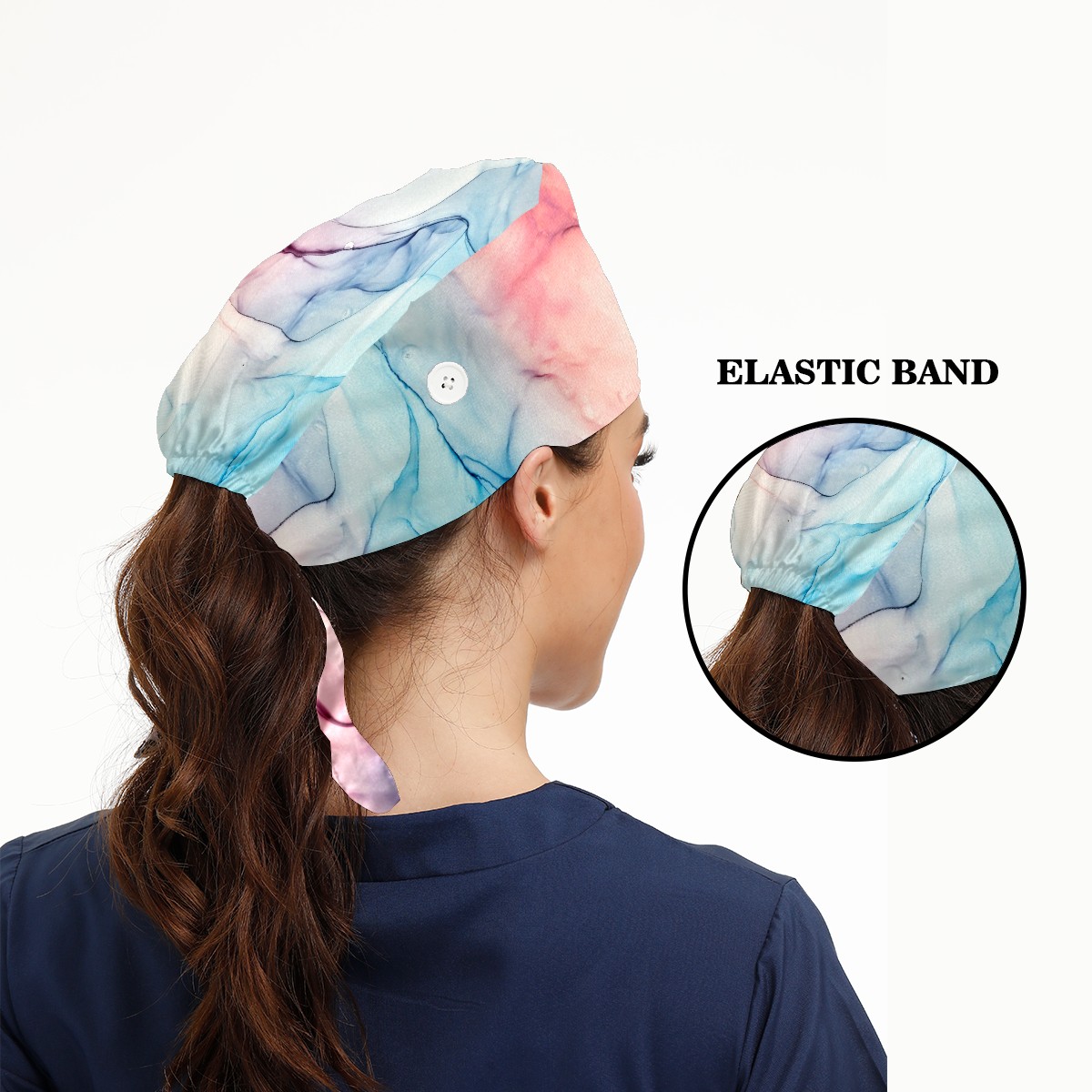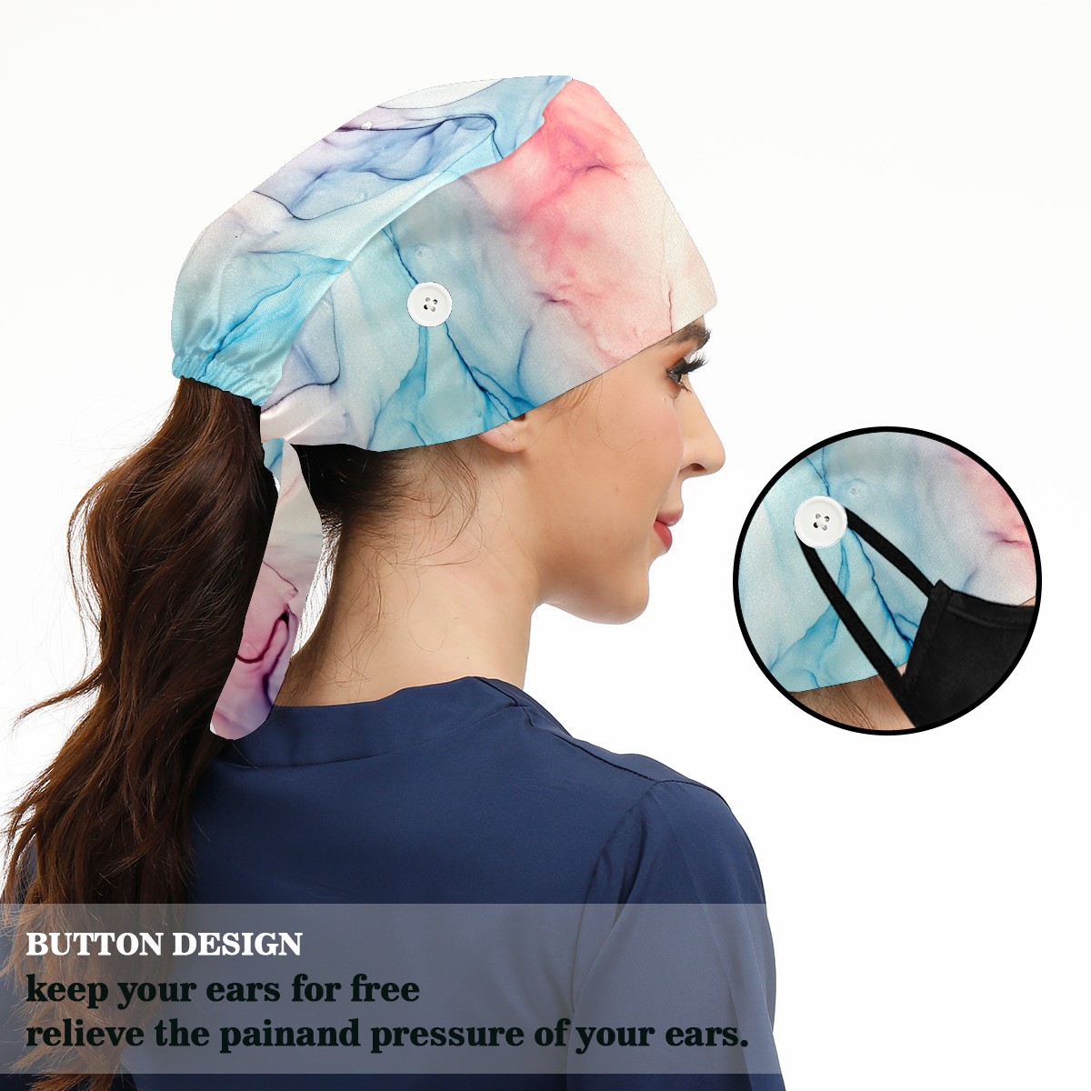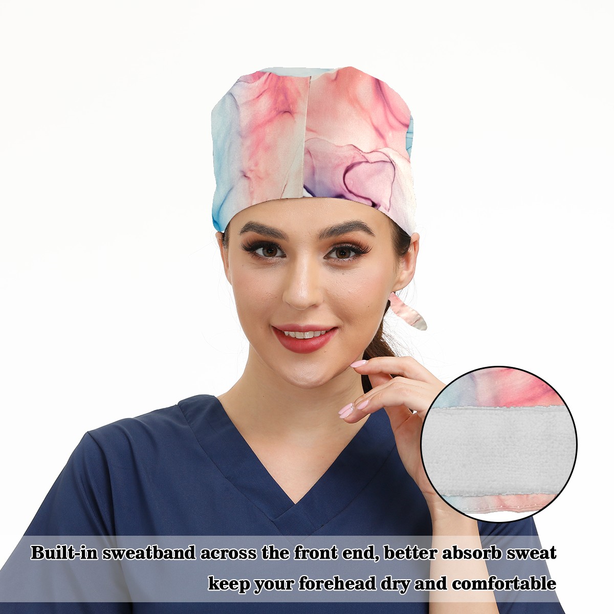 Working Caps with Button & Sweatband Satin Lined Cotton Adjustable Nurse Hats Elastic Band Scrub Cap Surgeon Hat Pink Blue Fluid Marble