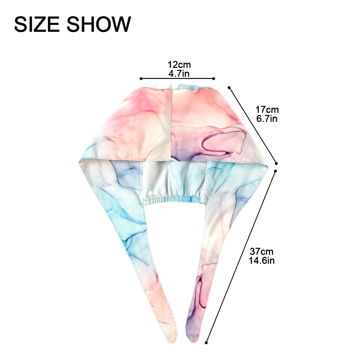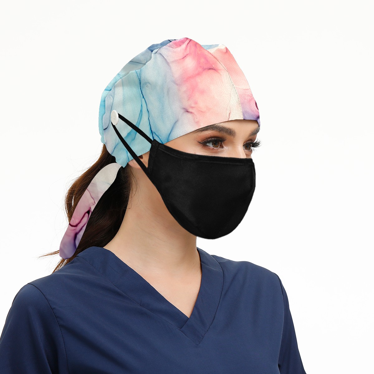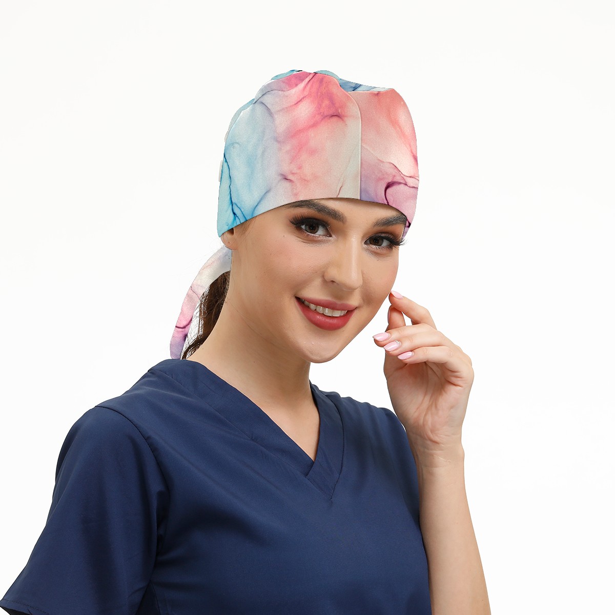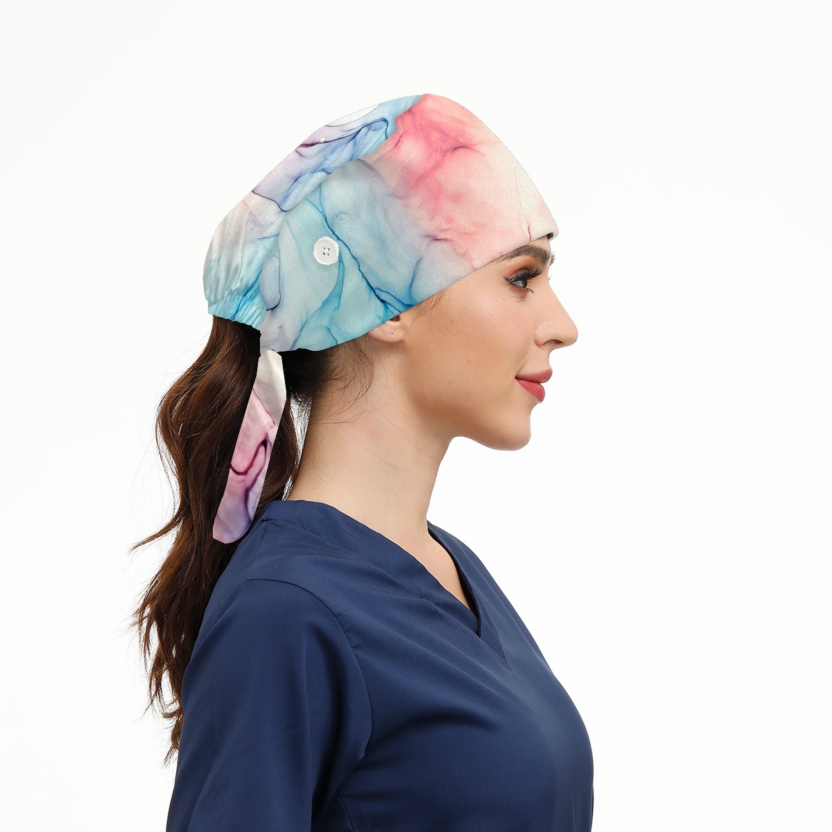 Working Caps with Button & Sweatband Satin Lined Cotton Adjustable Nurse Hats Elastic Band Scrub Cap Surgeon Hat Pink Blue Fluid Marble