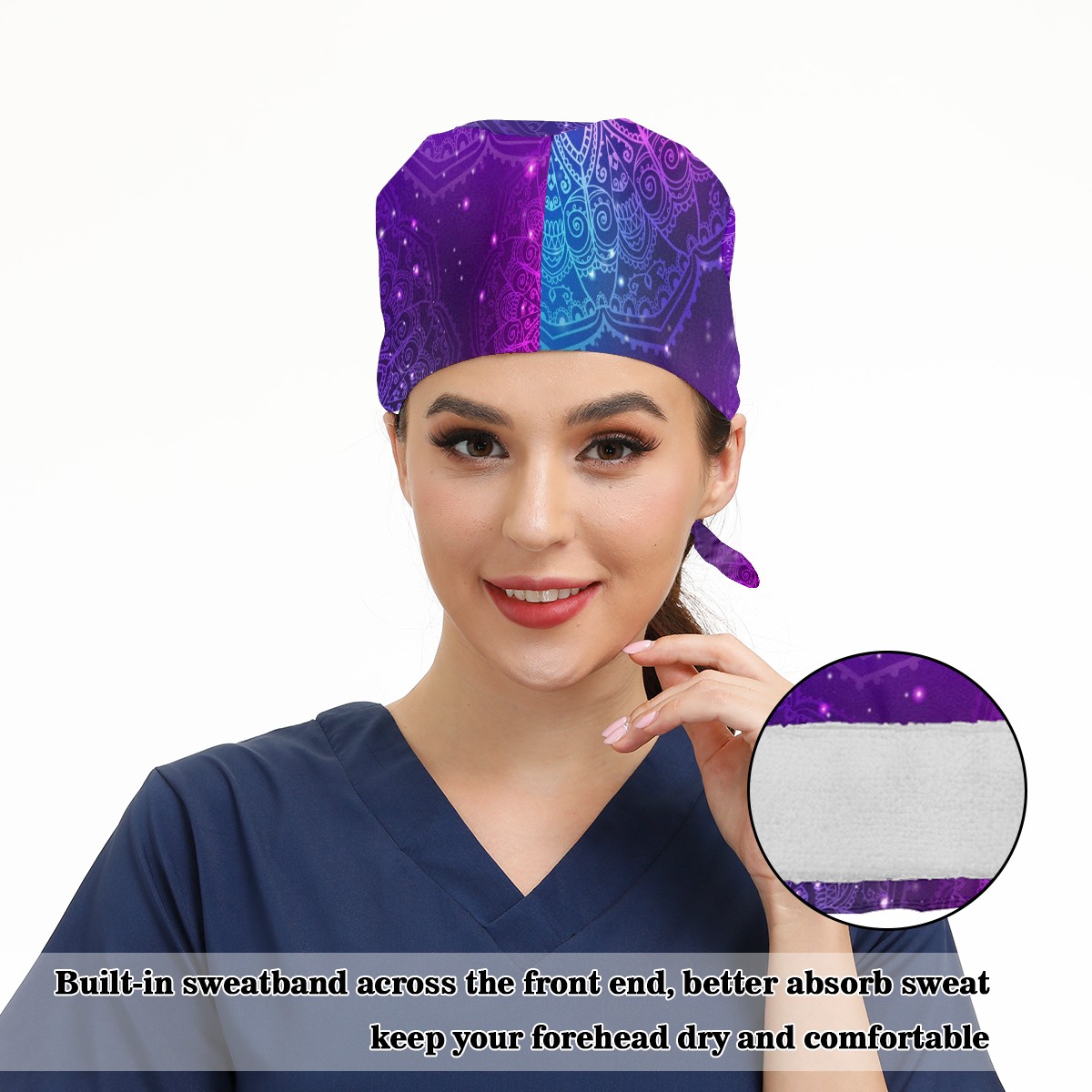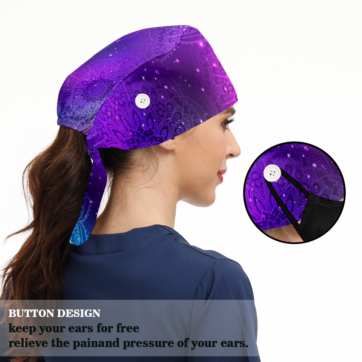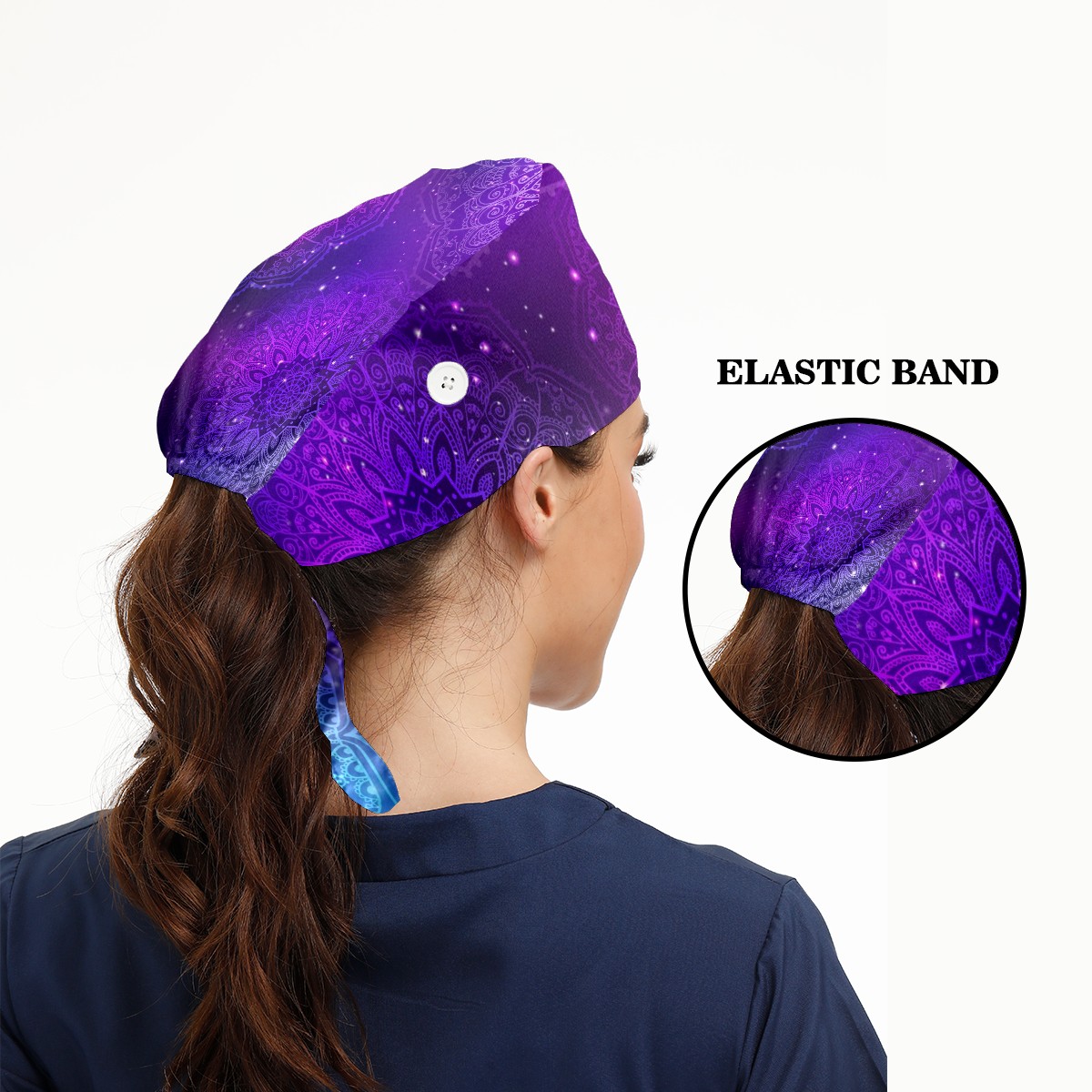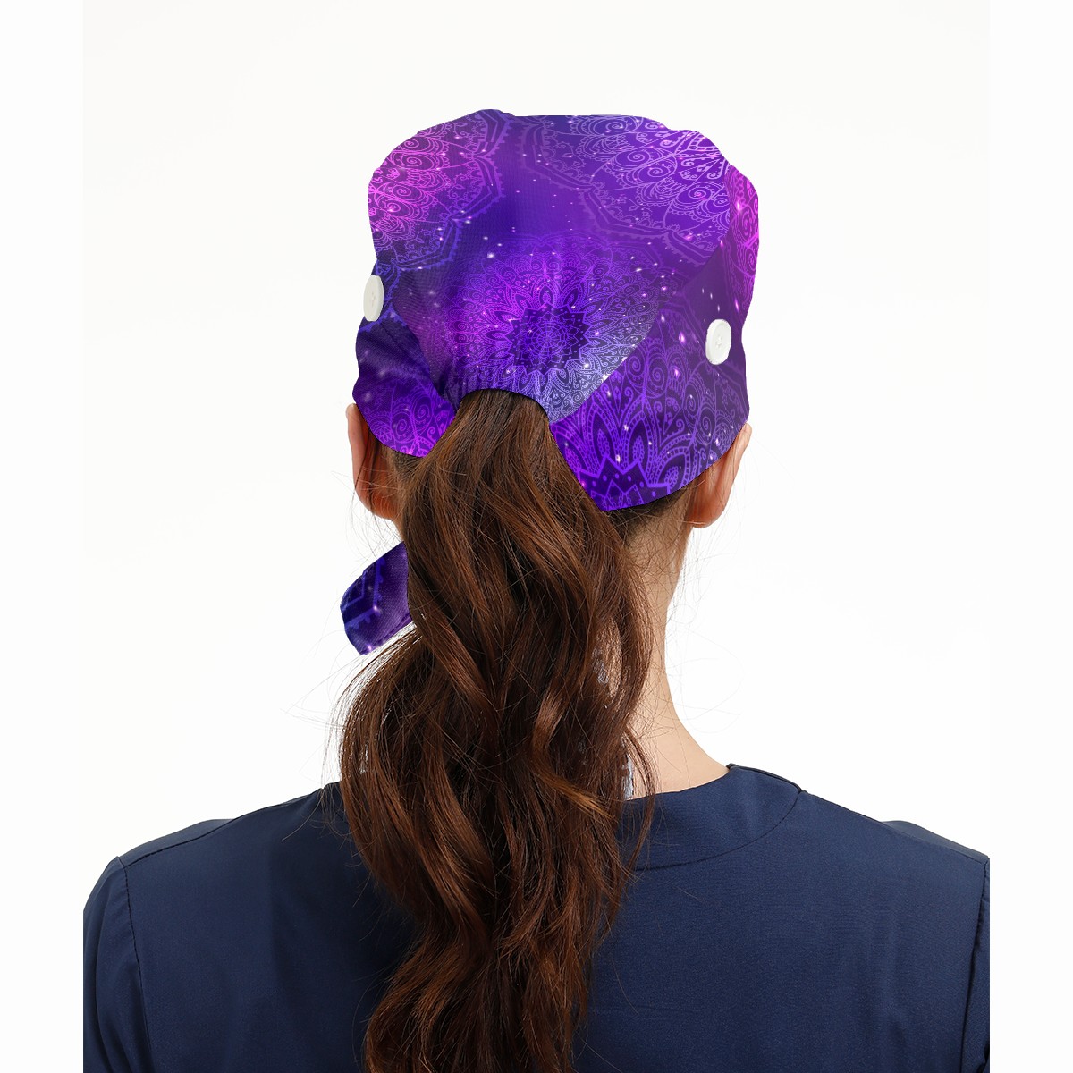 Working Caps with Button & Sweatband Satin Lined Cotton Adjustable Nurse Hats Elastic Band Scrub Cap Surgeon Hat Purple Boho Mandala Galaxy