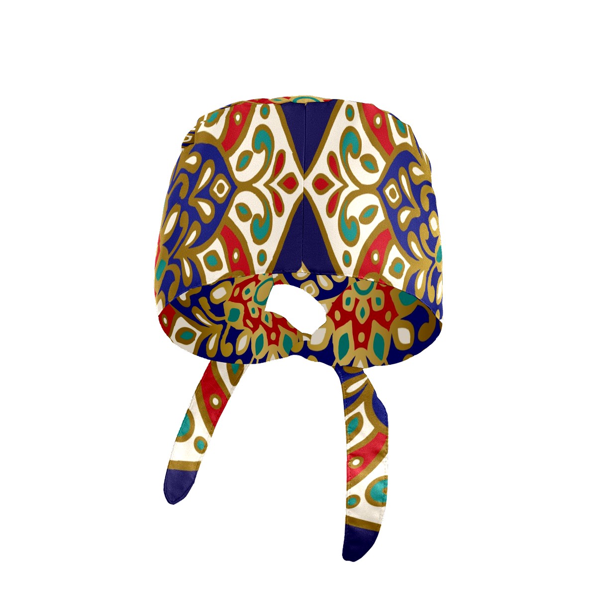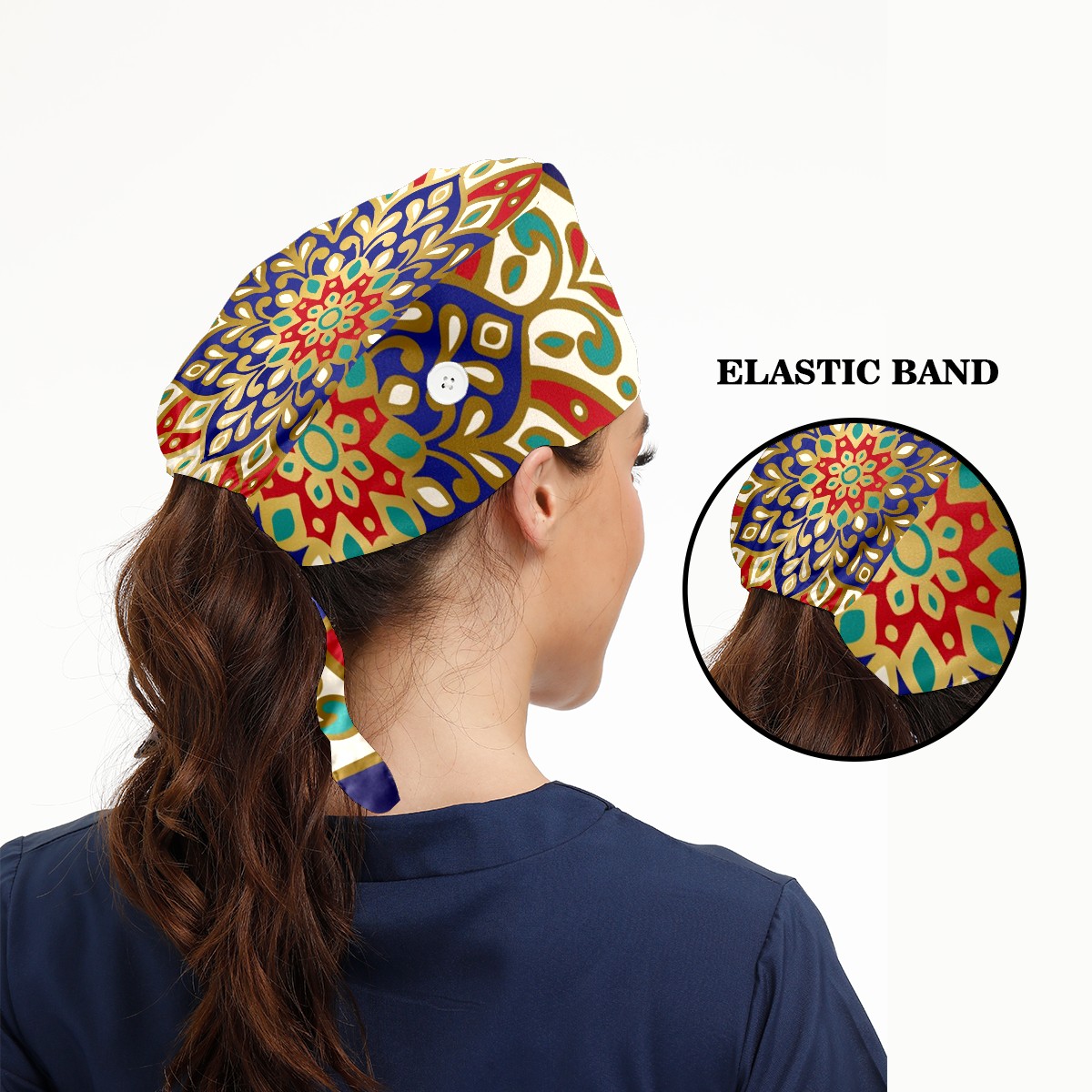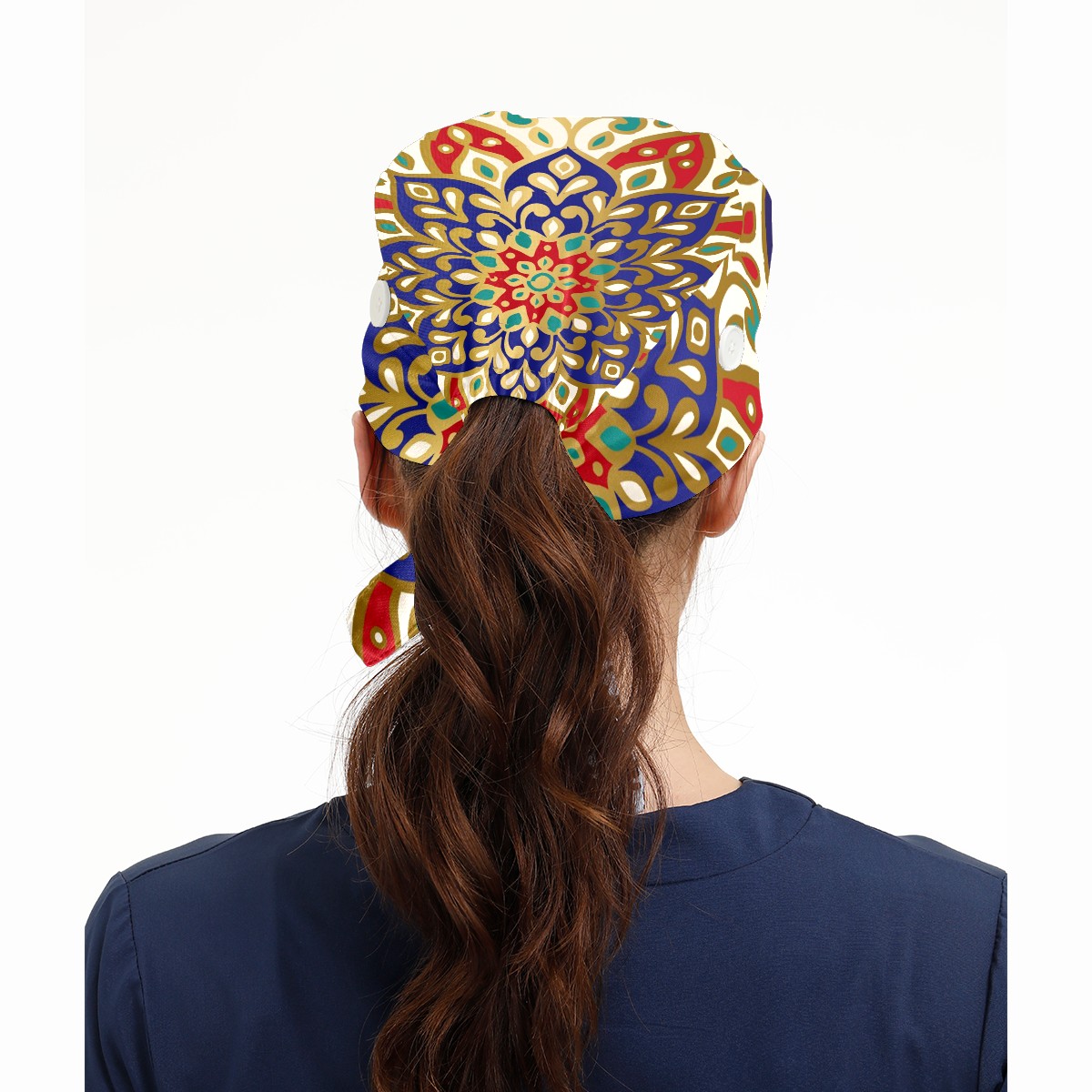 Working Caps with Button & Sweatband Satin Lined Cotton Adjustable Nurse Hats Elastic Band Scrub Cap Surgeon Hat Indian Boho Blue And Red Mandala Flower