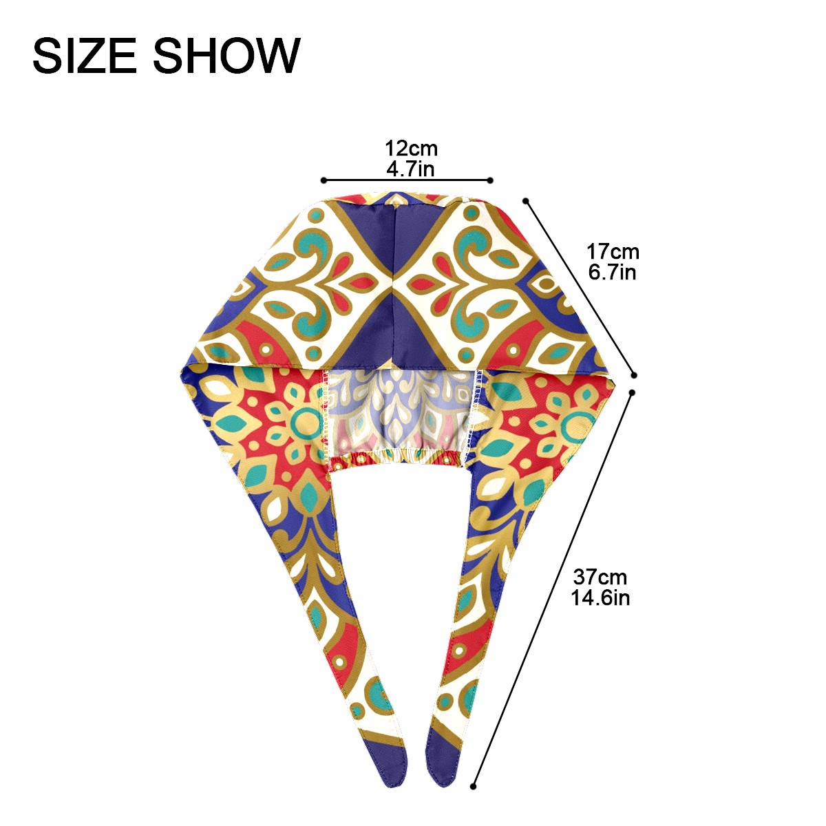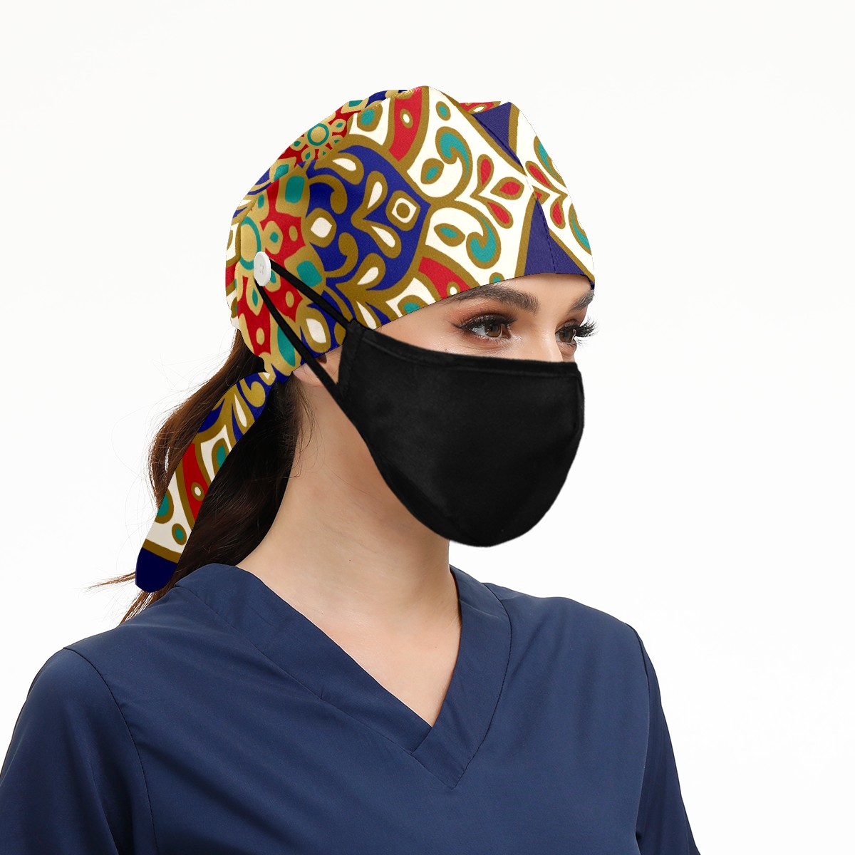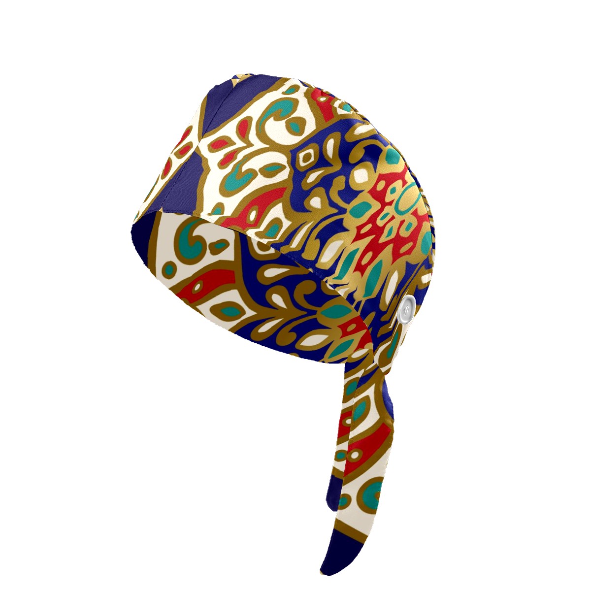 Working Caps with Button & Sweatband Satin Lined Cotton Adjustable Nurse Hats Elastic Band Scrub Cap Surgeon Hat Indian Boho Blue And Red Mandala Flower