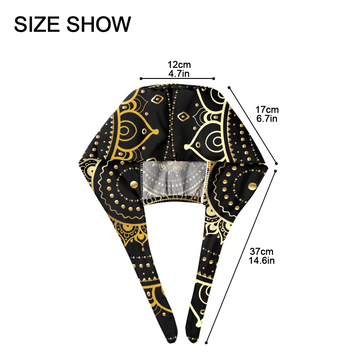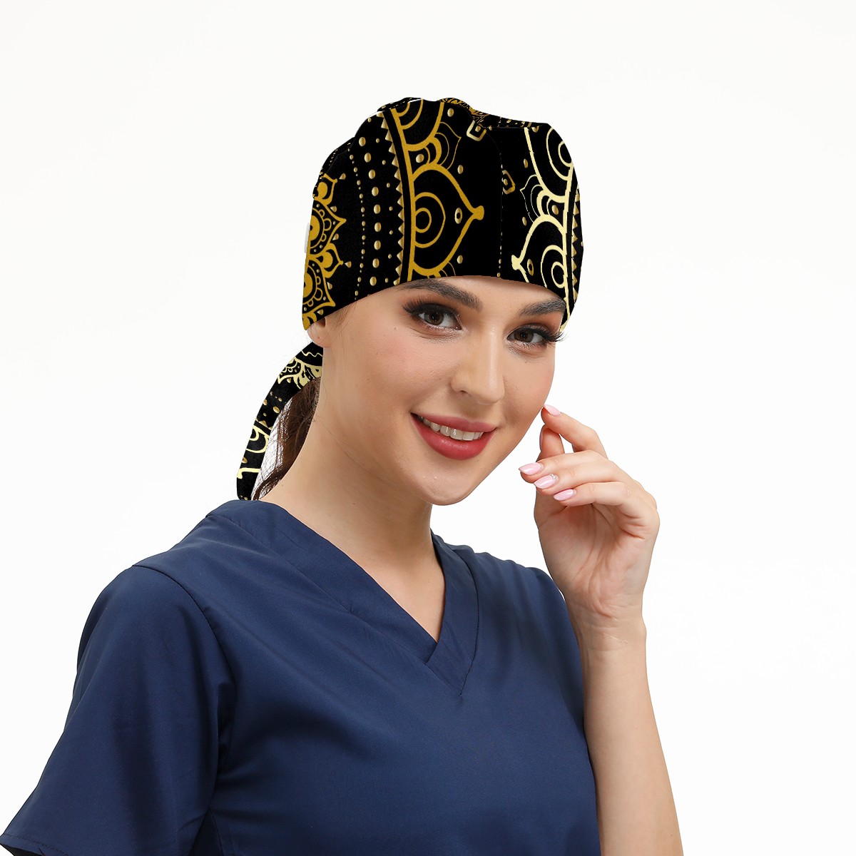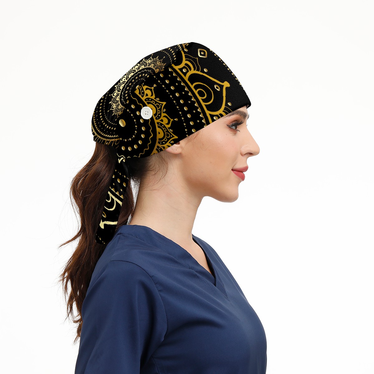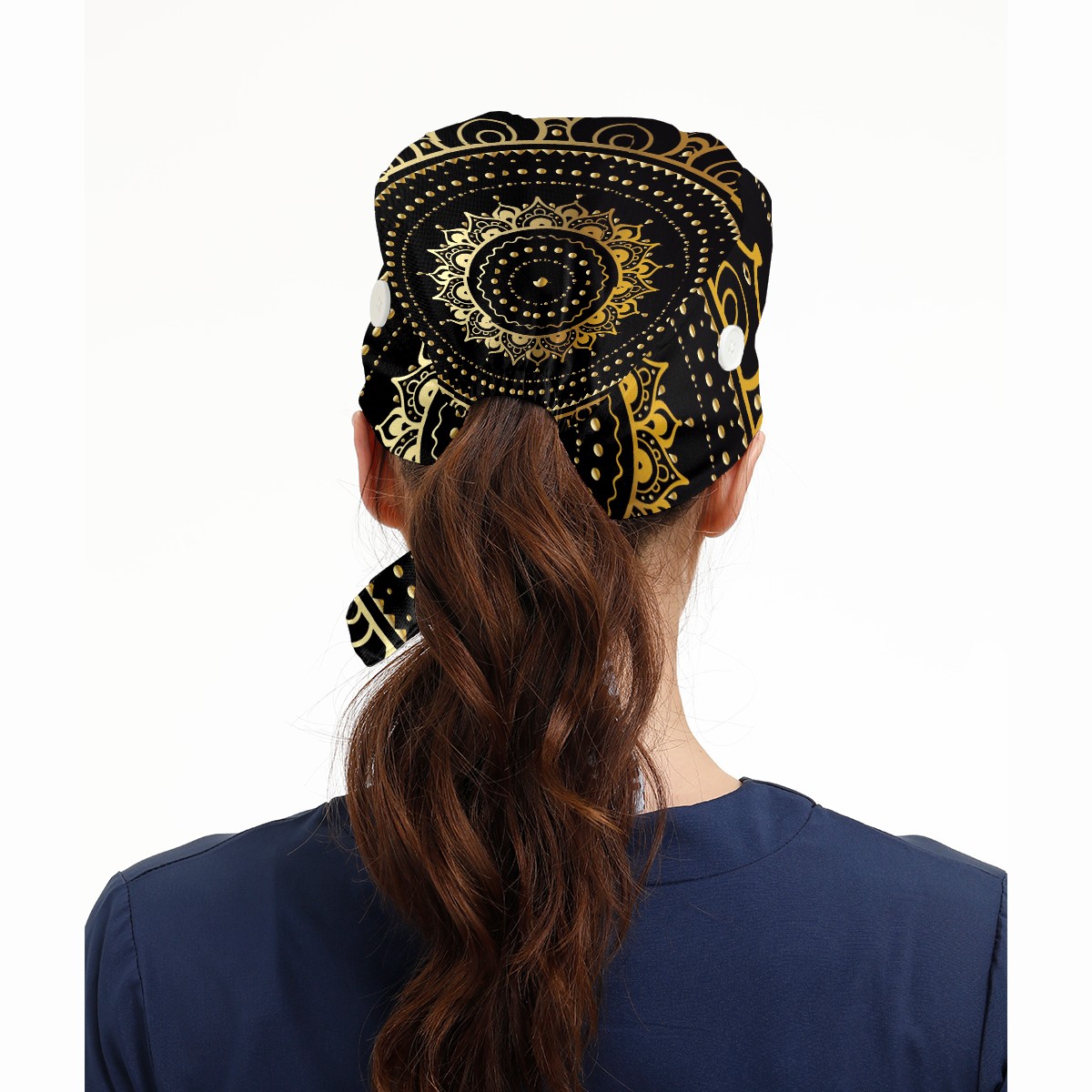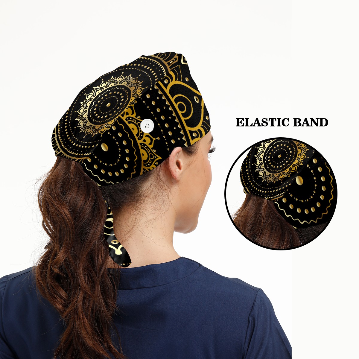 Working Caps with Button & Sweatband Satin Lined Cotton Adjustable Nurse Hats Elastic Band Scrub Cap Surgeon Hat Ethnic Vintage Gold Mandala