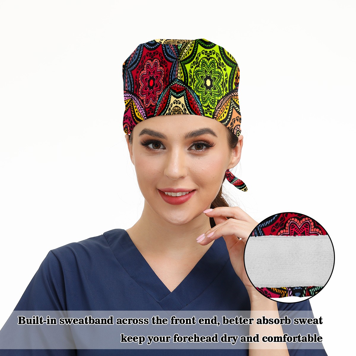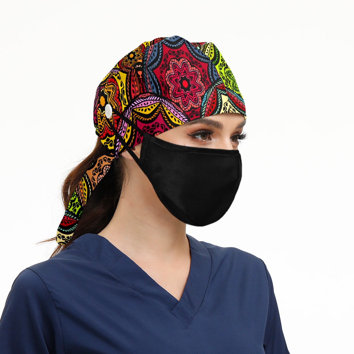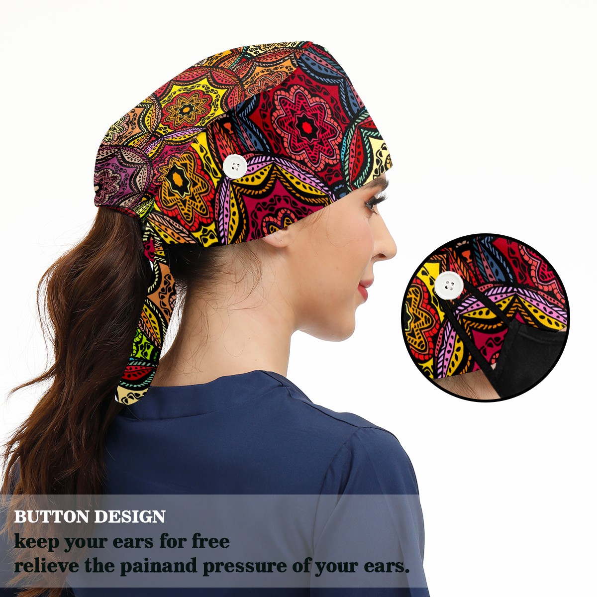 Working Caps with Button & Sweatband Satin Lined Cotton Adjustable Nurse Hats Elastic Band Scrub Cap Surgeon Hat Colorful Mandala Flowers