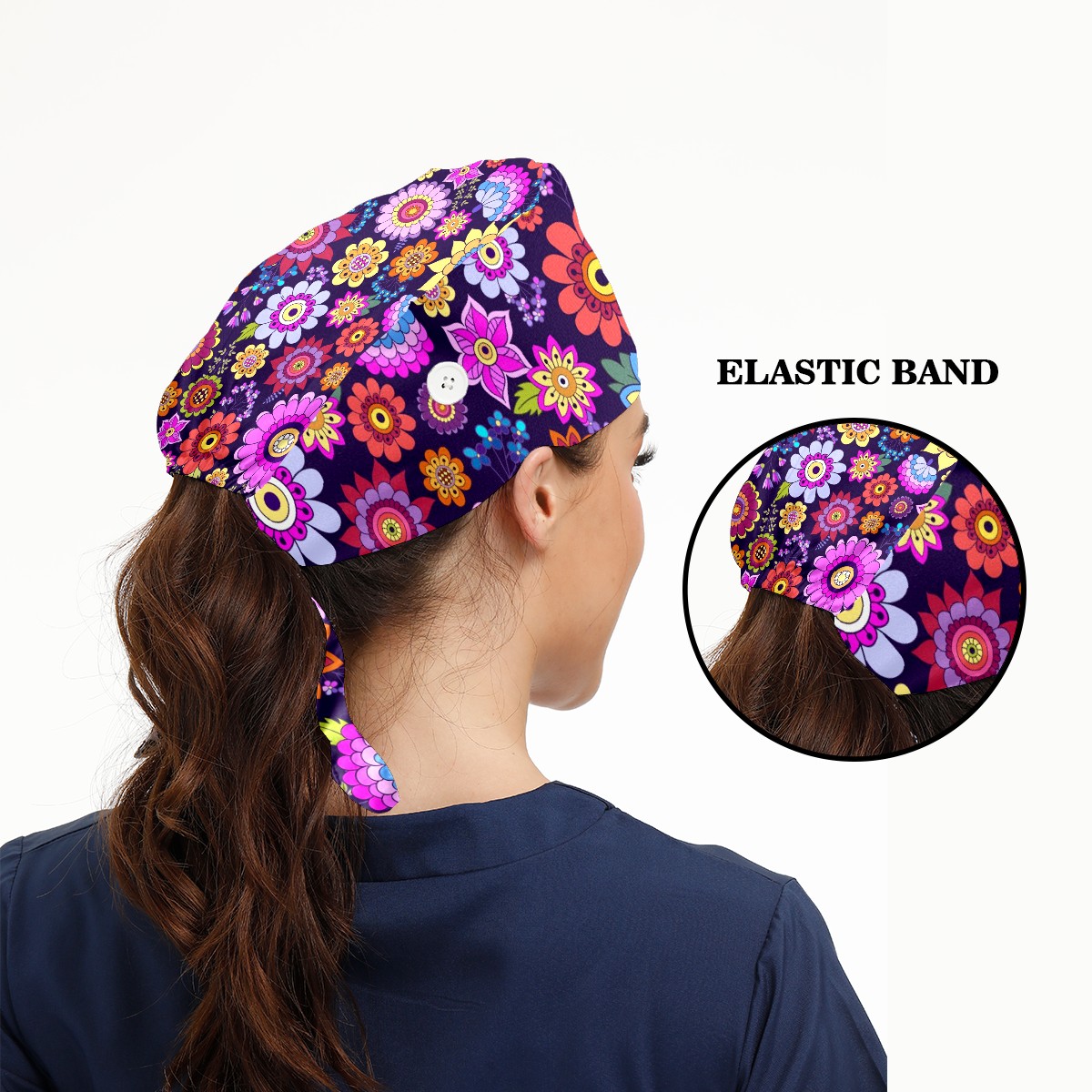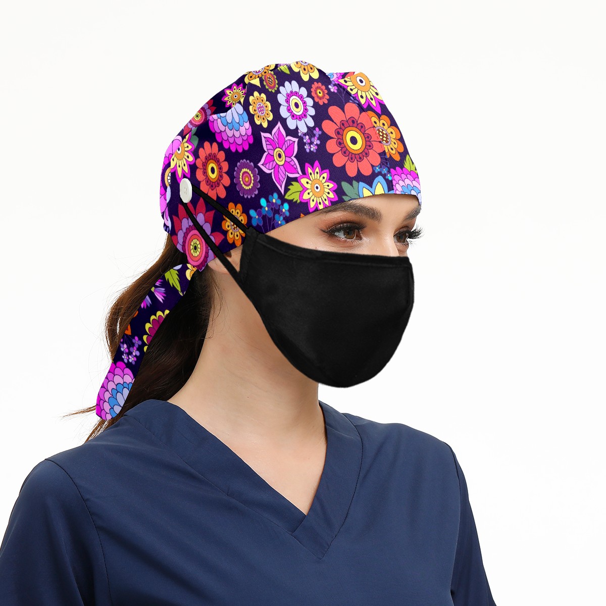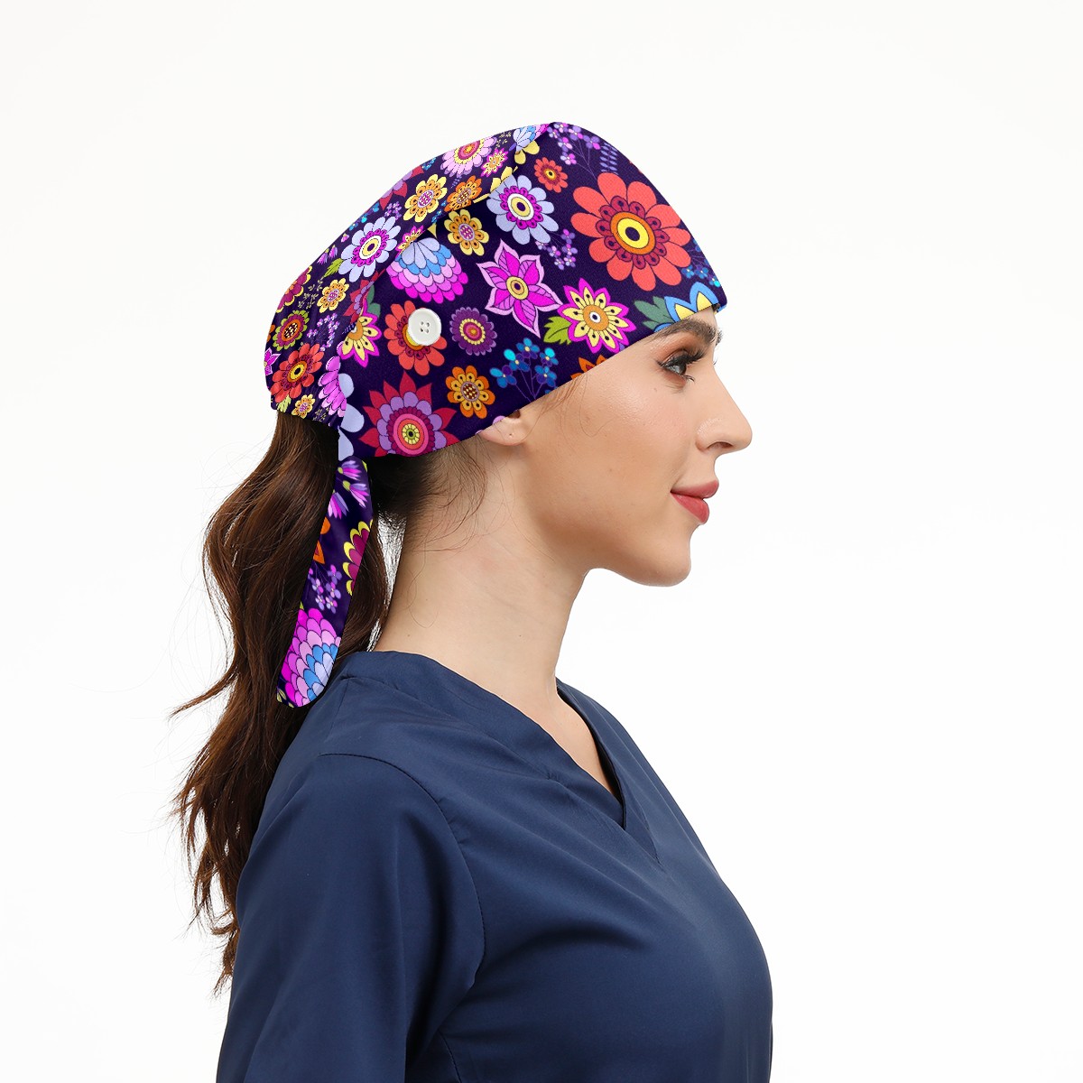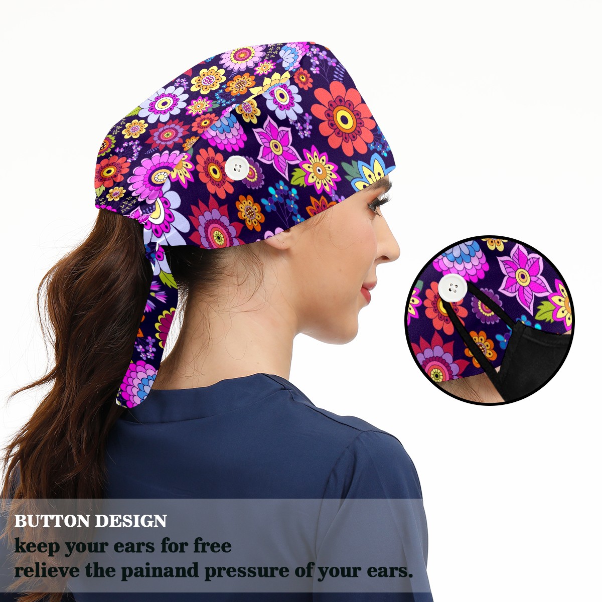Working Caps with Button & Sweatband Satin Lined Cotton Adjustable Nurse Hats Elastic Band Scrub Cap Surgeon Hat Colorful Mandala Flower Pattern