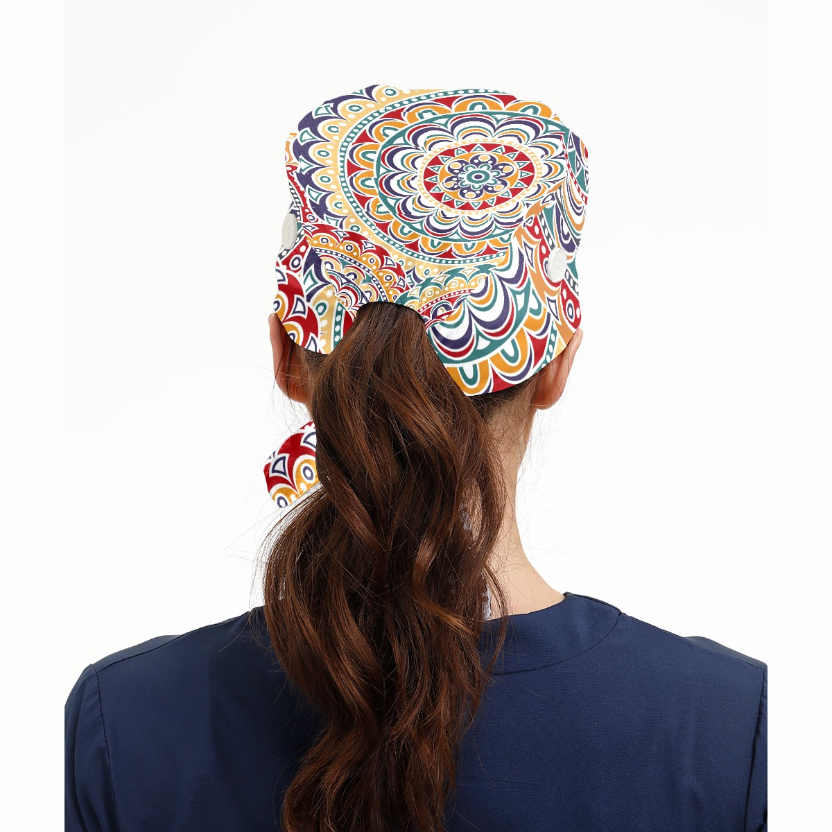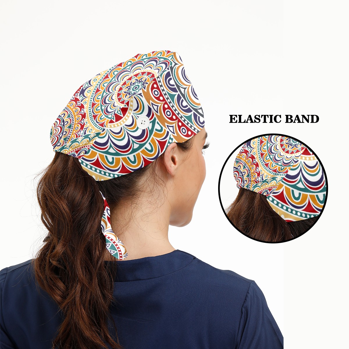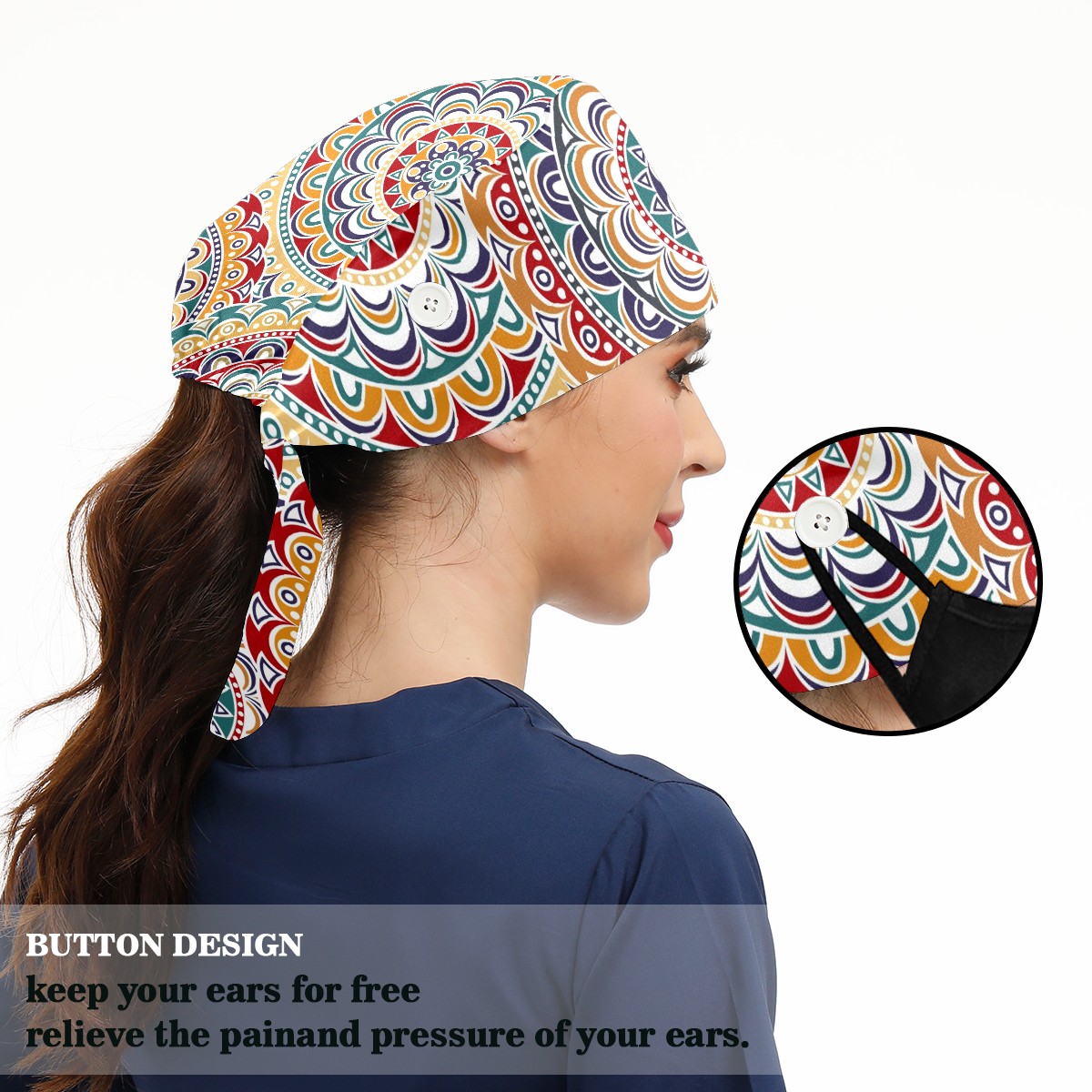 Working Caps with Button & Sweatband Satin Lined Cotton Adjustable Nurse Hats Elastic Band Scrub Cap Surgeon Hat Boho Ethnic Mandala Floral