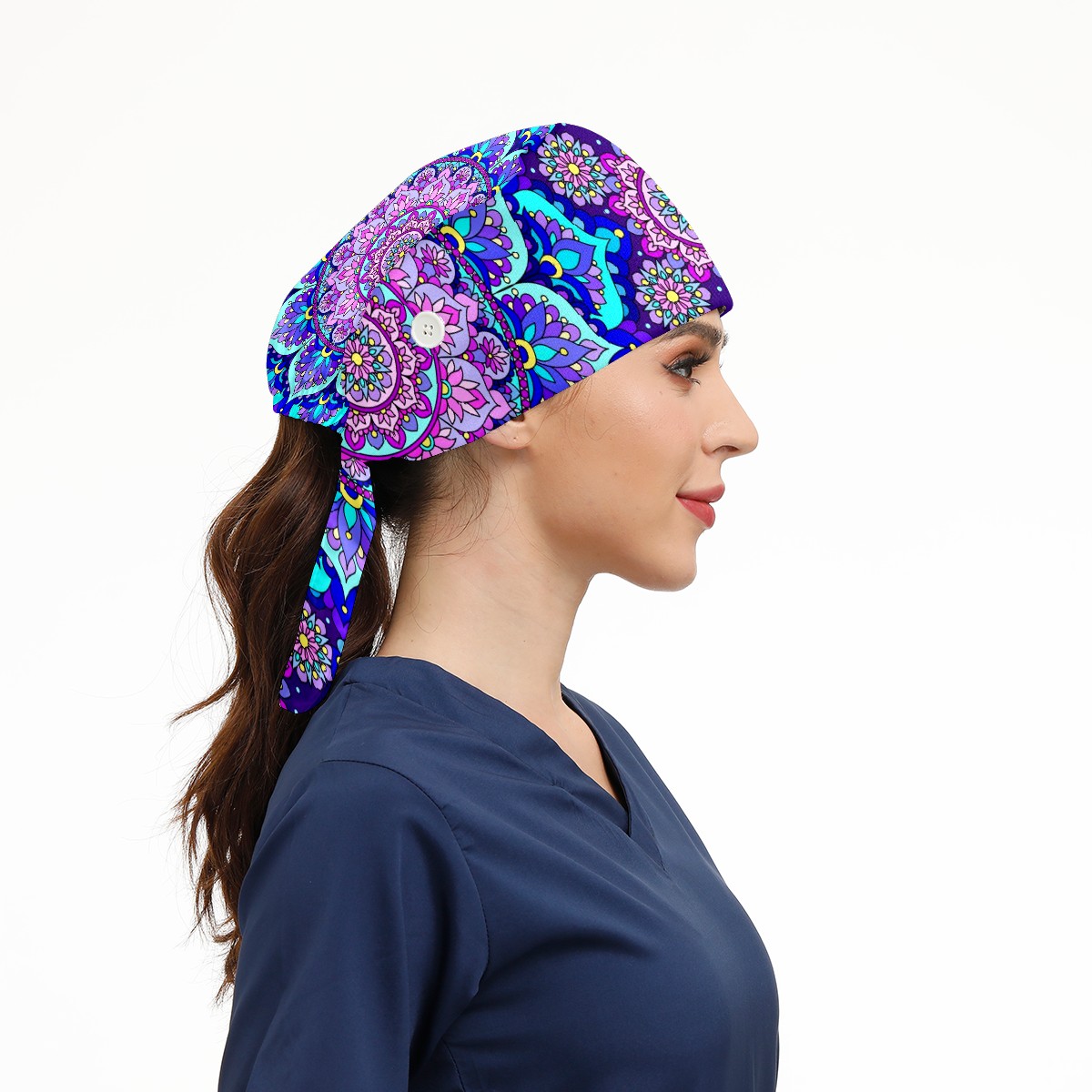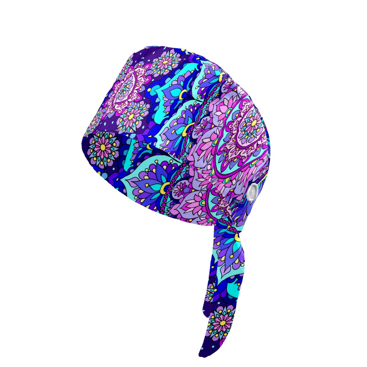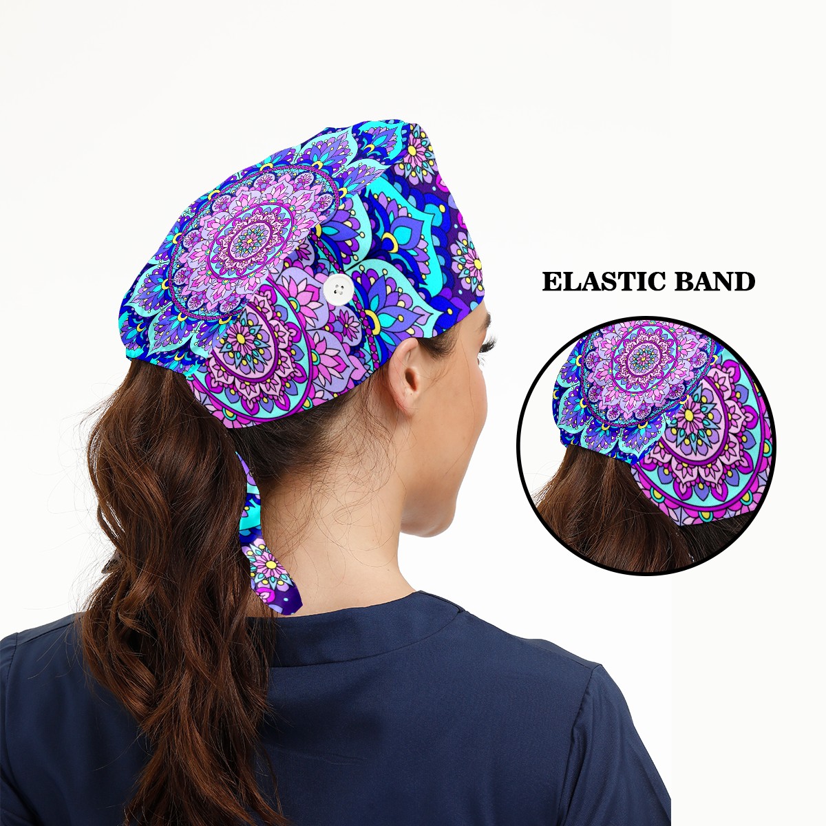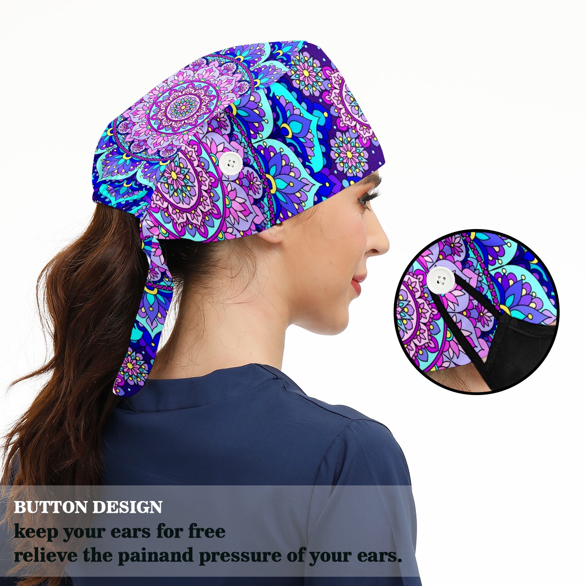 Working Caps with Button & Sweatband Satin Lined Cotton Adjustable Nurse Hats Elastic Band Scrub Cap Surgeon Hat Blue Purple Mandala