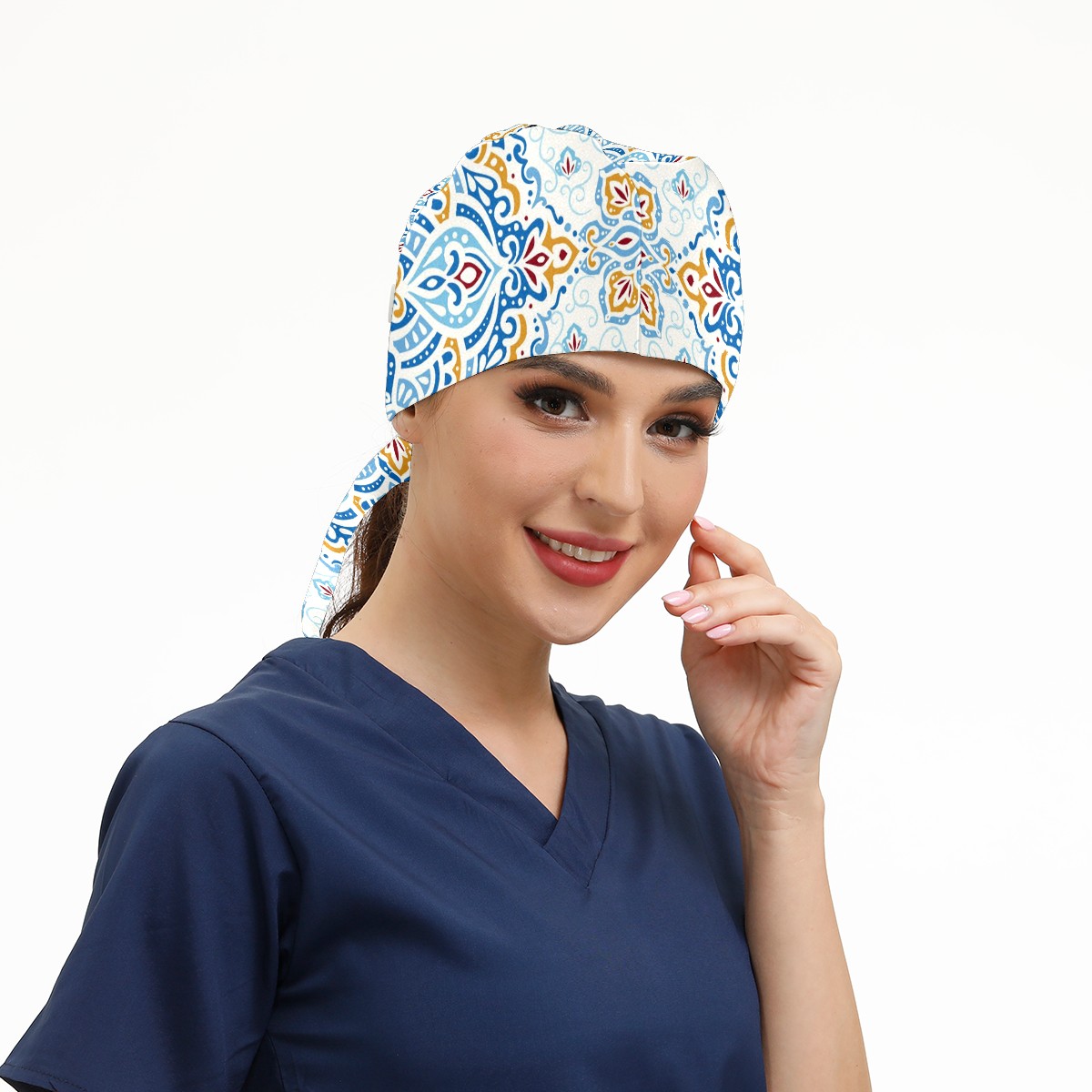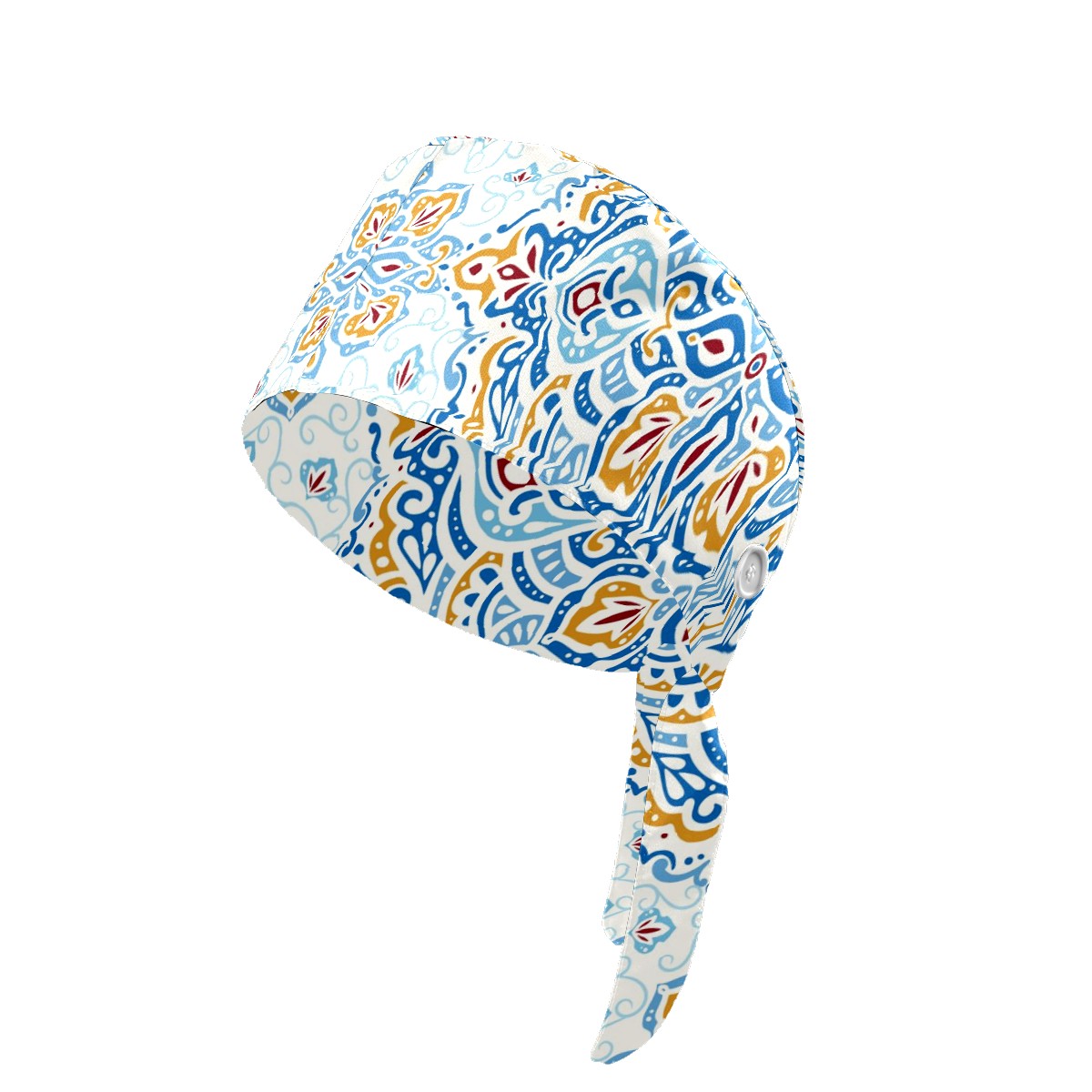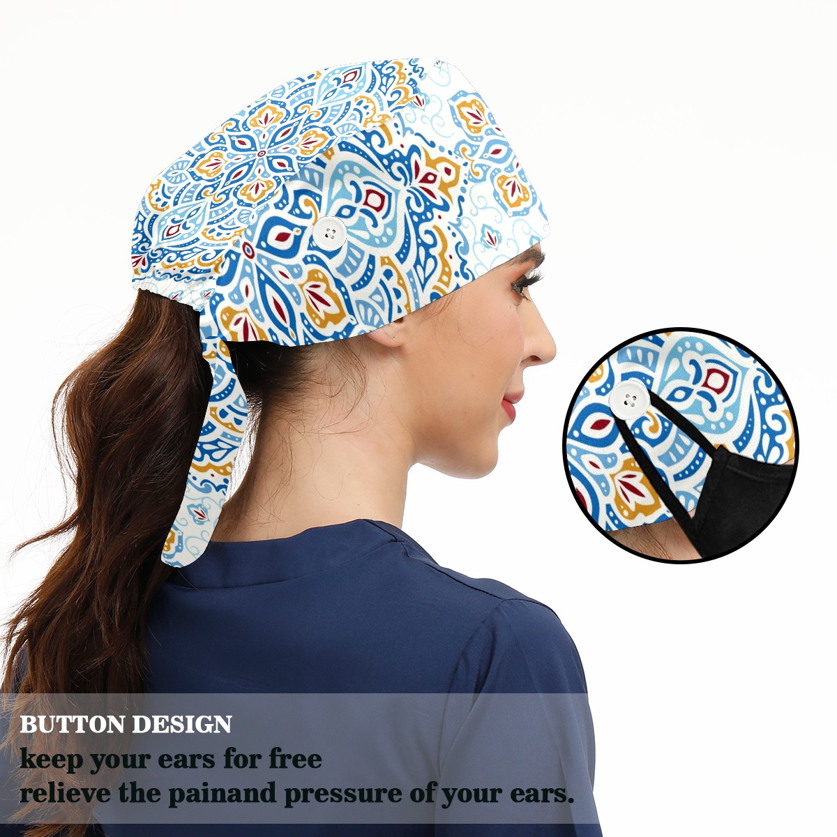 Working Caps with Button & Sweatband Satin Lined Cotton Adjustable Nurse Hats Elastic Band Scrub Cap Surgeon Hat Blue Ethnic Boho Mandala Flower