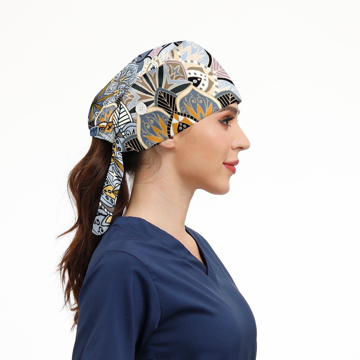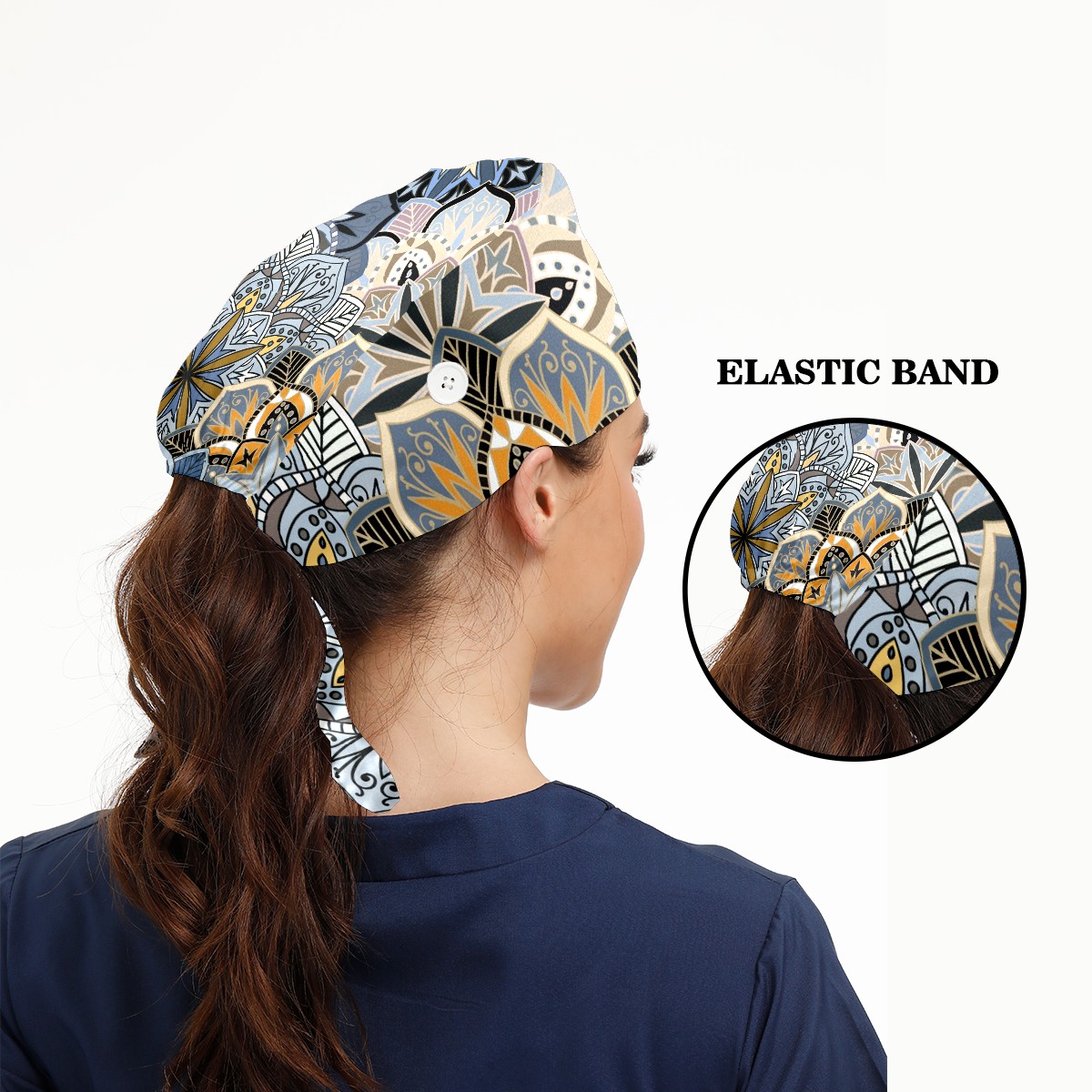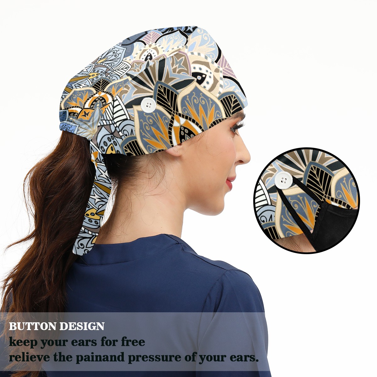 Working Caps with Button & Sweatband Satin Lined Cotton Adjustable Nurse Hats Elastic Band Scrub Cap Surgeon Hat Abstract Mandala Flower