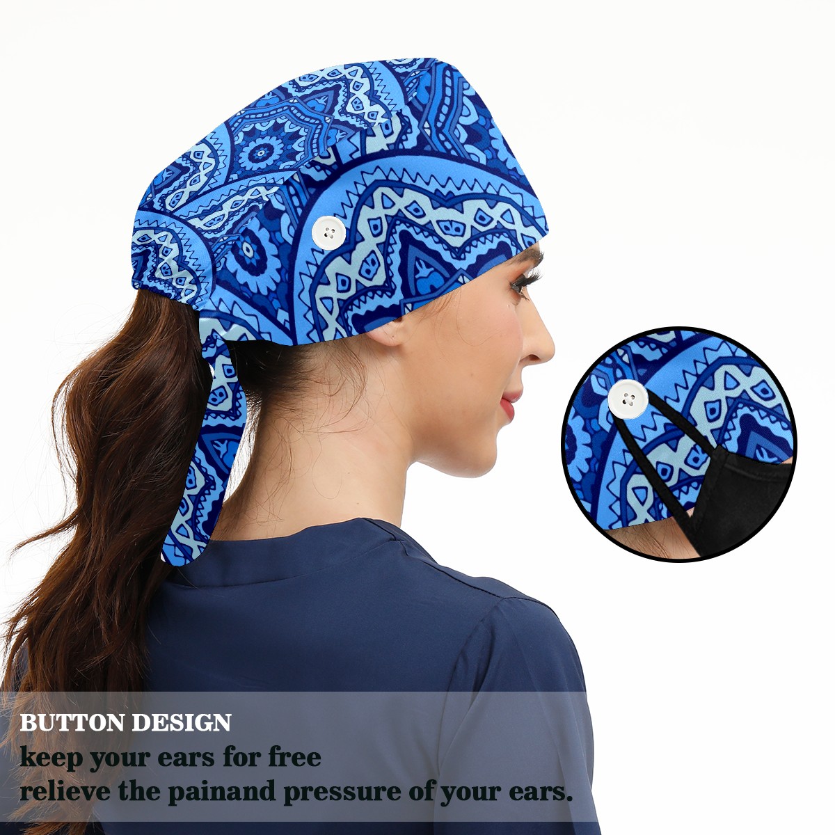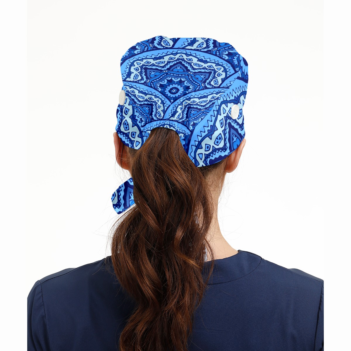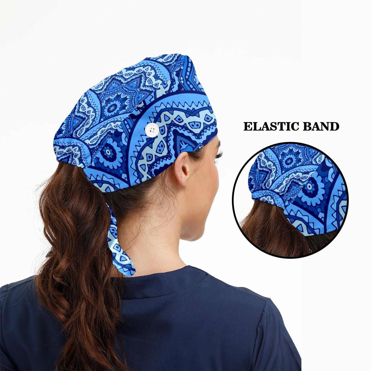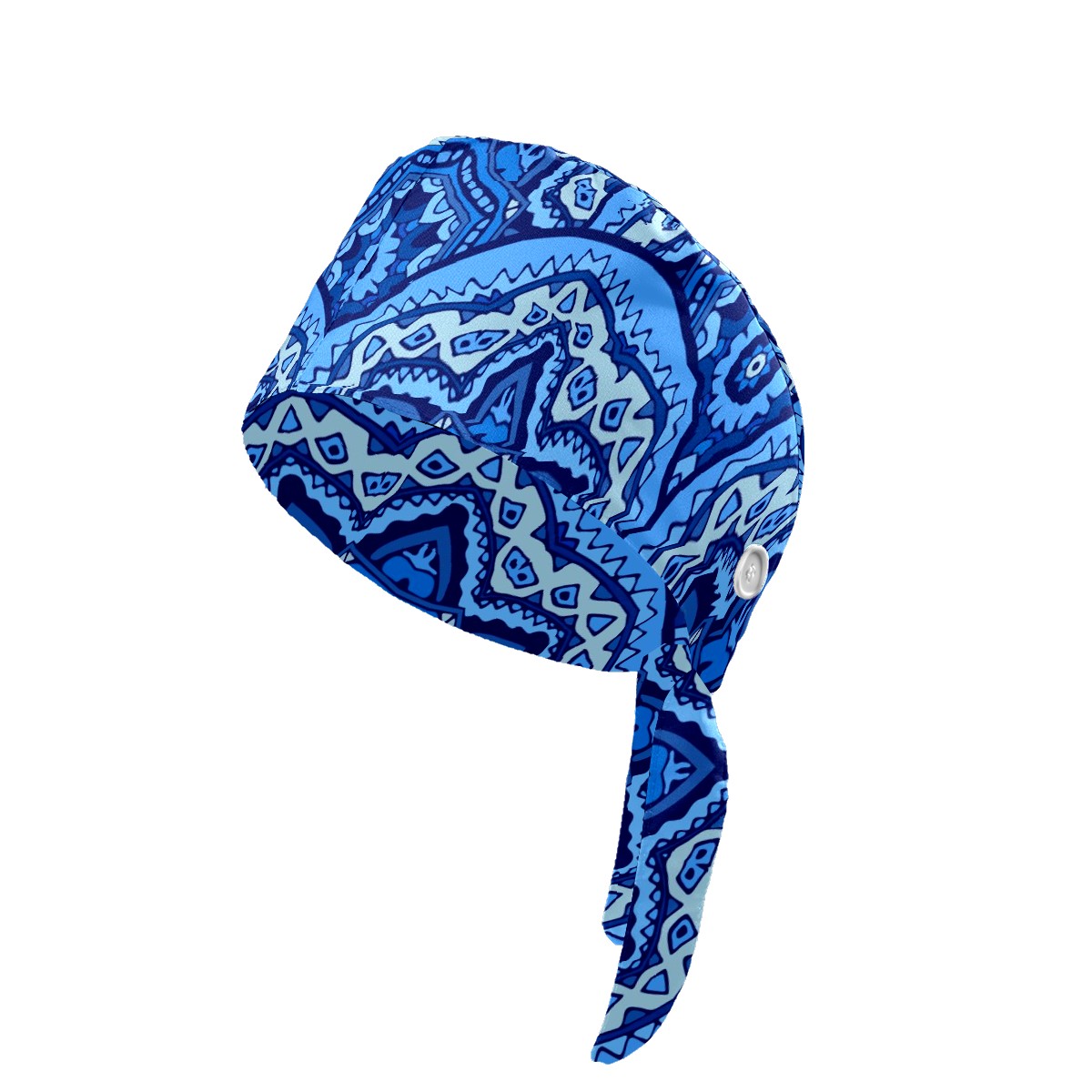 Working Caps with Button & Sweatband Satin Lined Cotton Adjustable Nurse Hats Elastic Band Scrub Cap Surgeon Hat Abstract Blue Mandala Geometric Print
