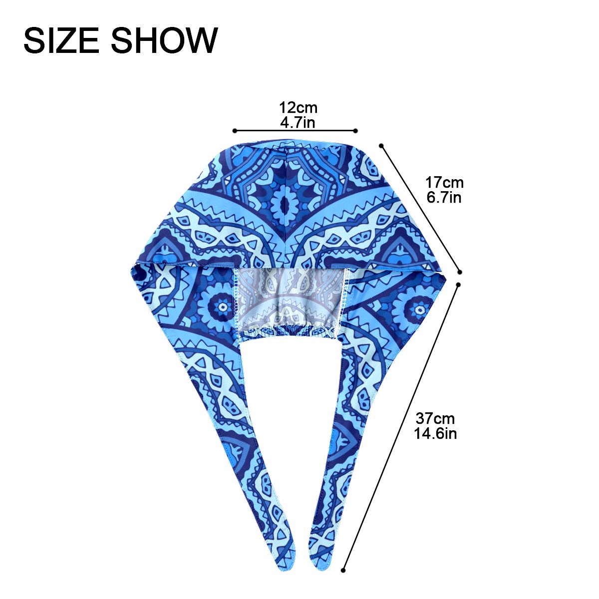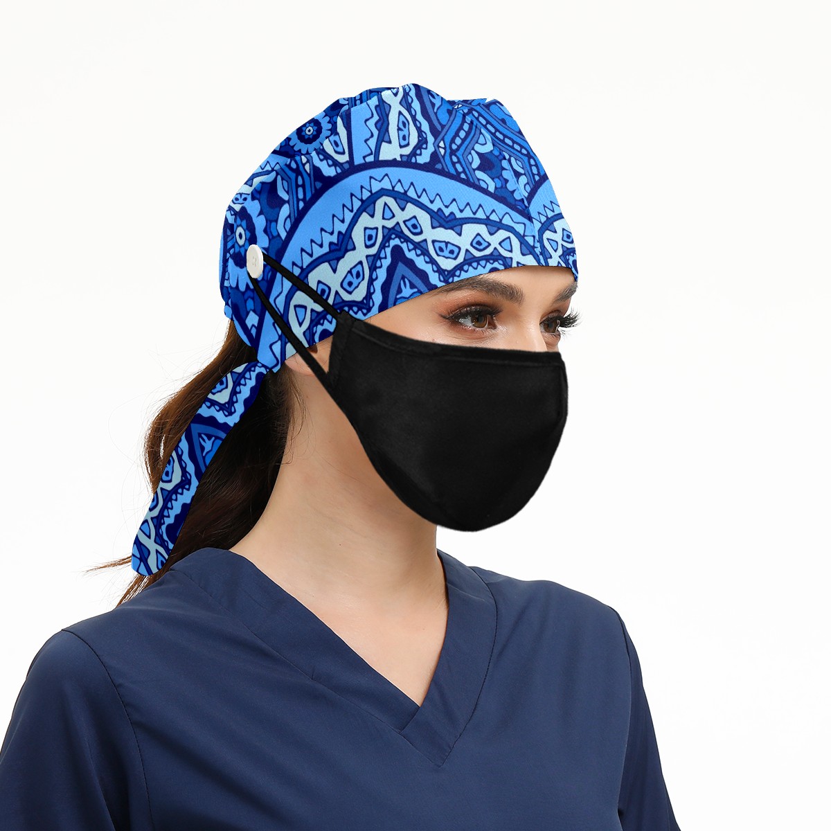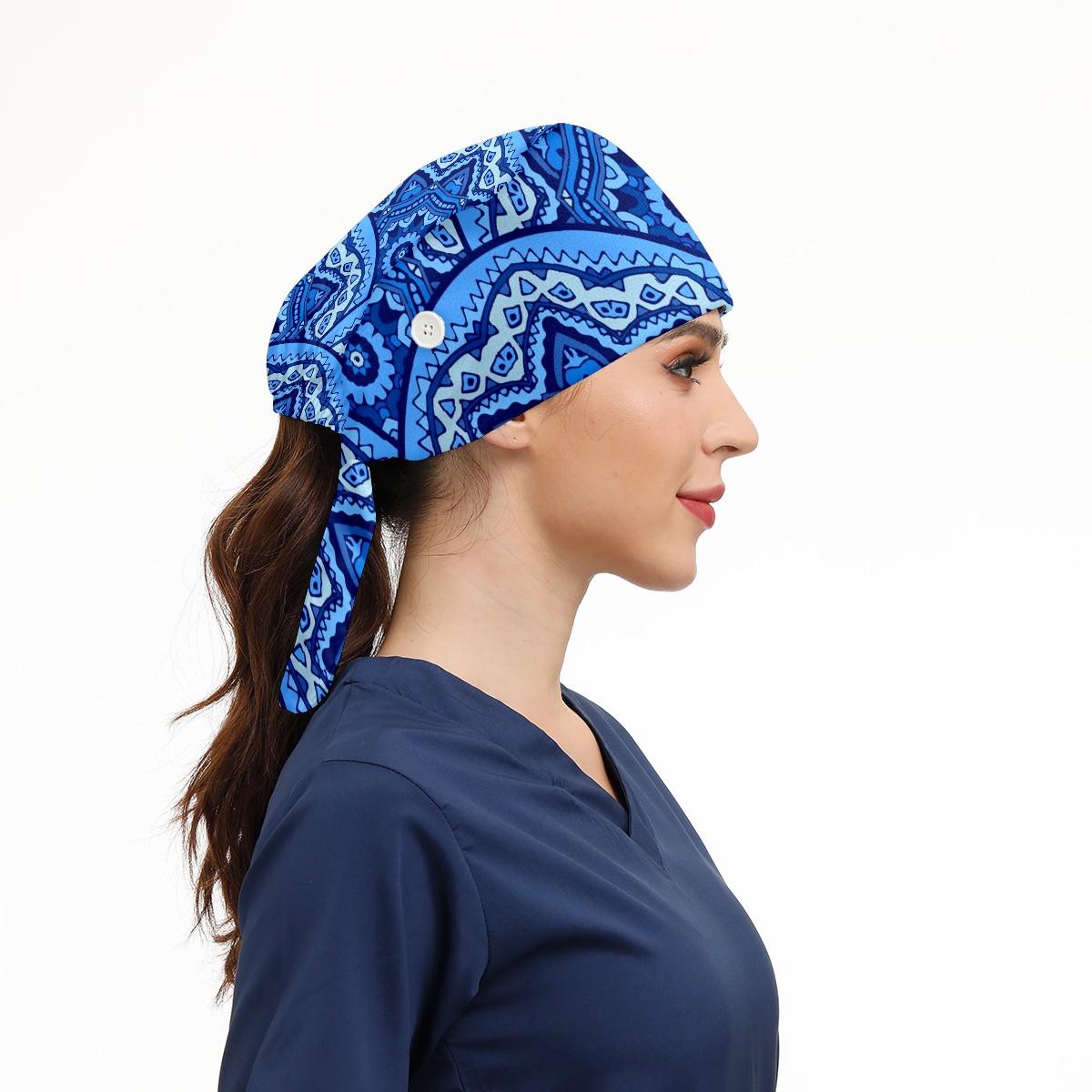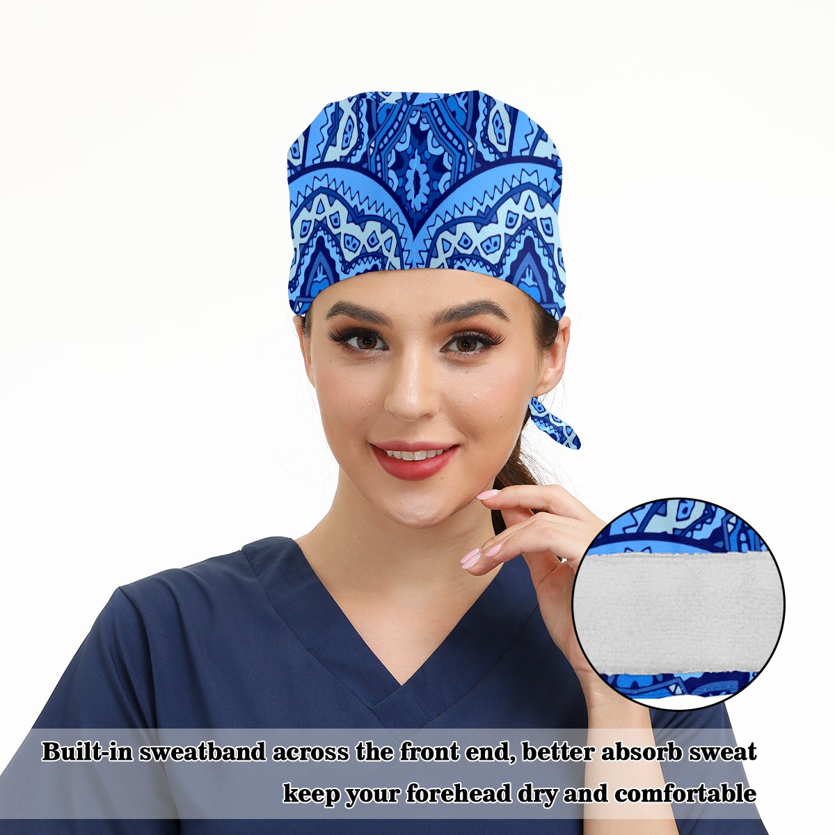 Working Caps with Button & Sweatband Satin Lined Cotton Adjustable Nurse Hats Elastic Band Scrub Cap Surgeon Hat Abstract Blue Mandala Geometric Print