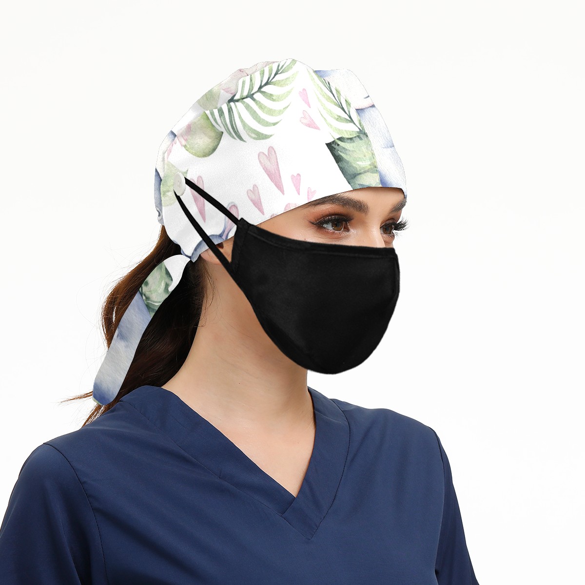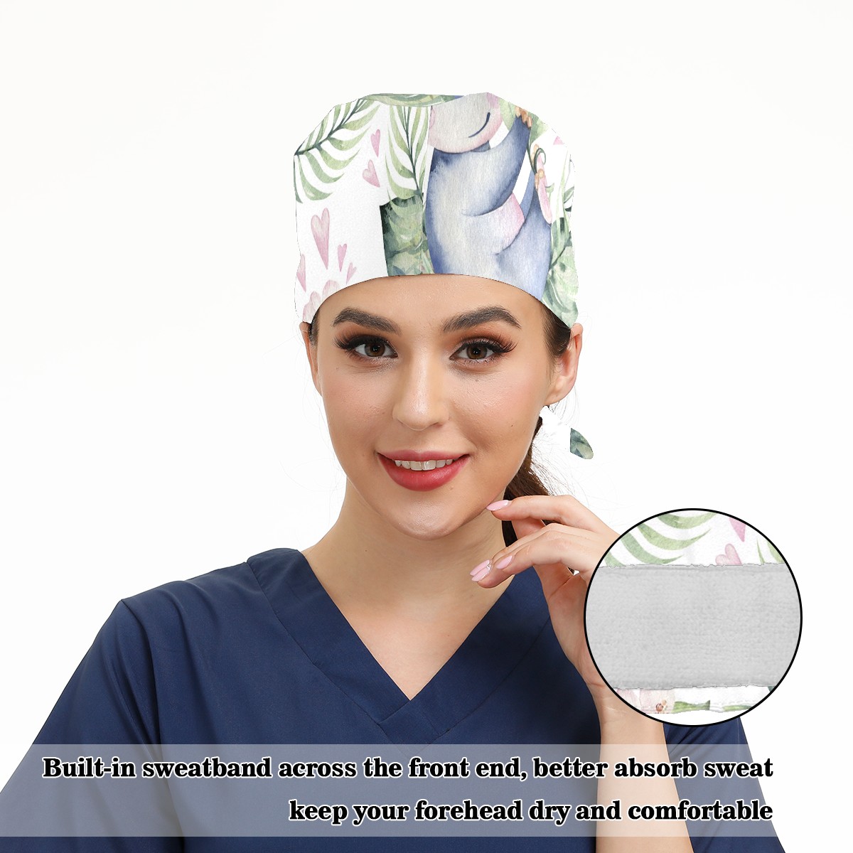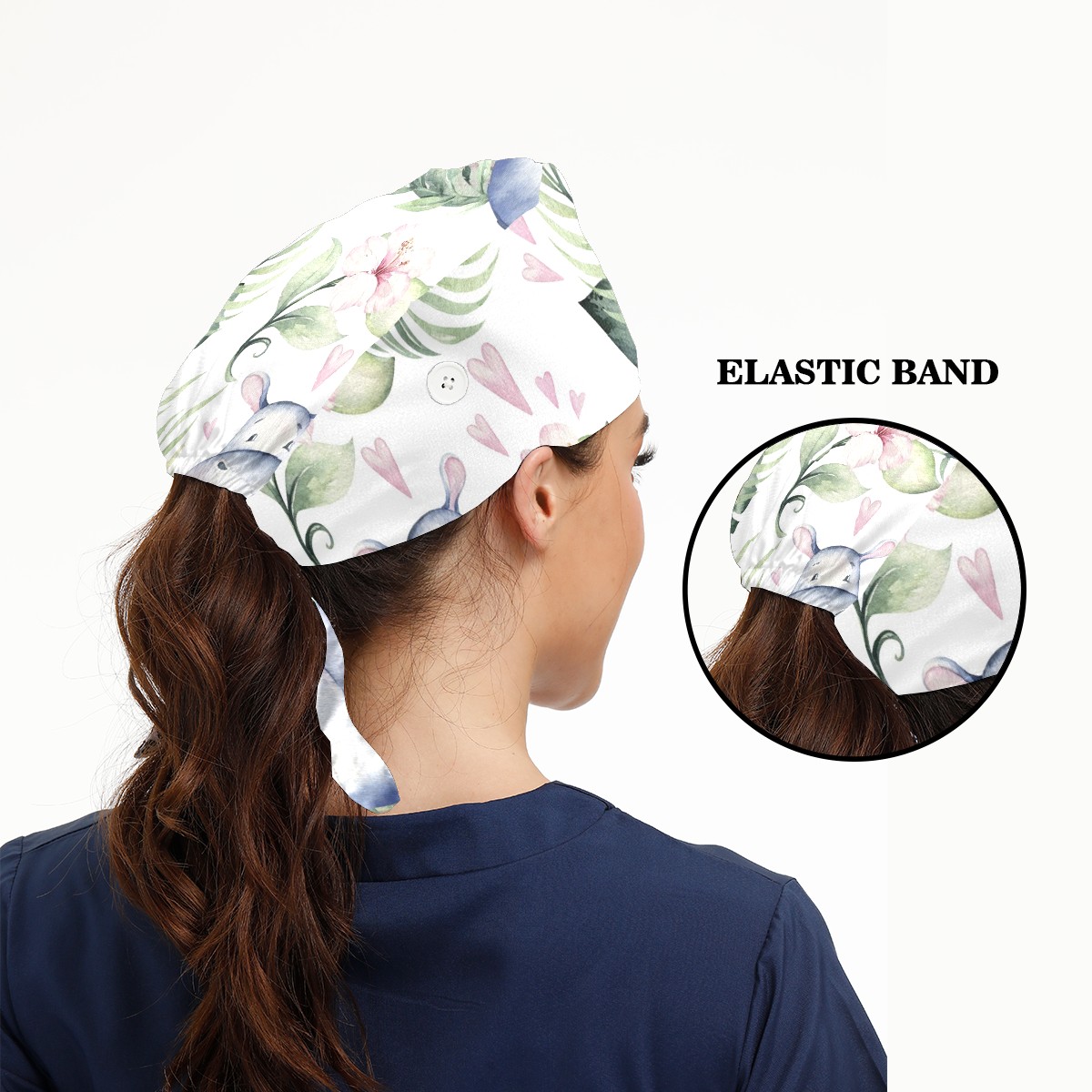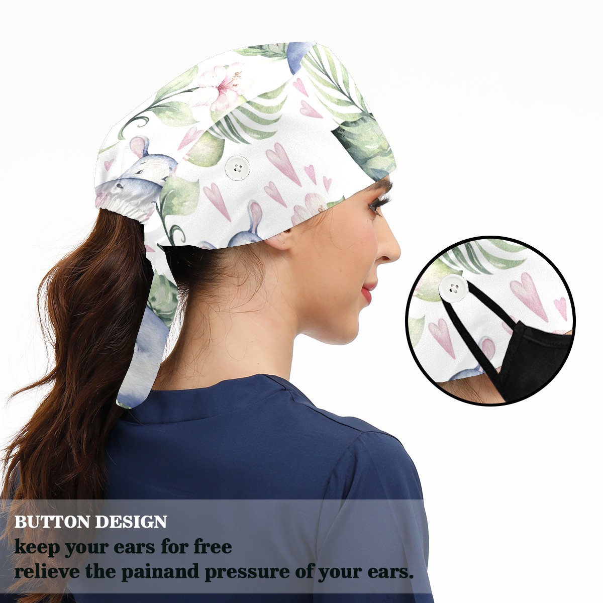Working Caps with Button & Sweatband Satin Lined Cotton Adjustable Nurse Hats Elastic Band Scrub Cap Surgeon Hat Tropical Cute Hippo Flower