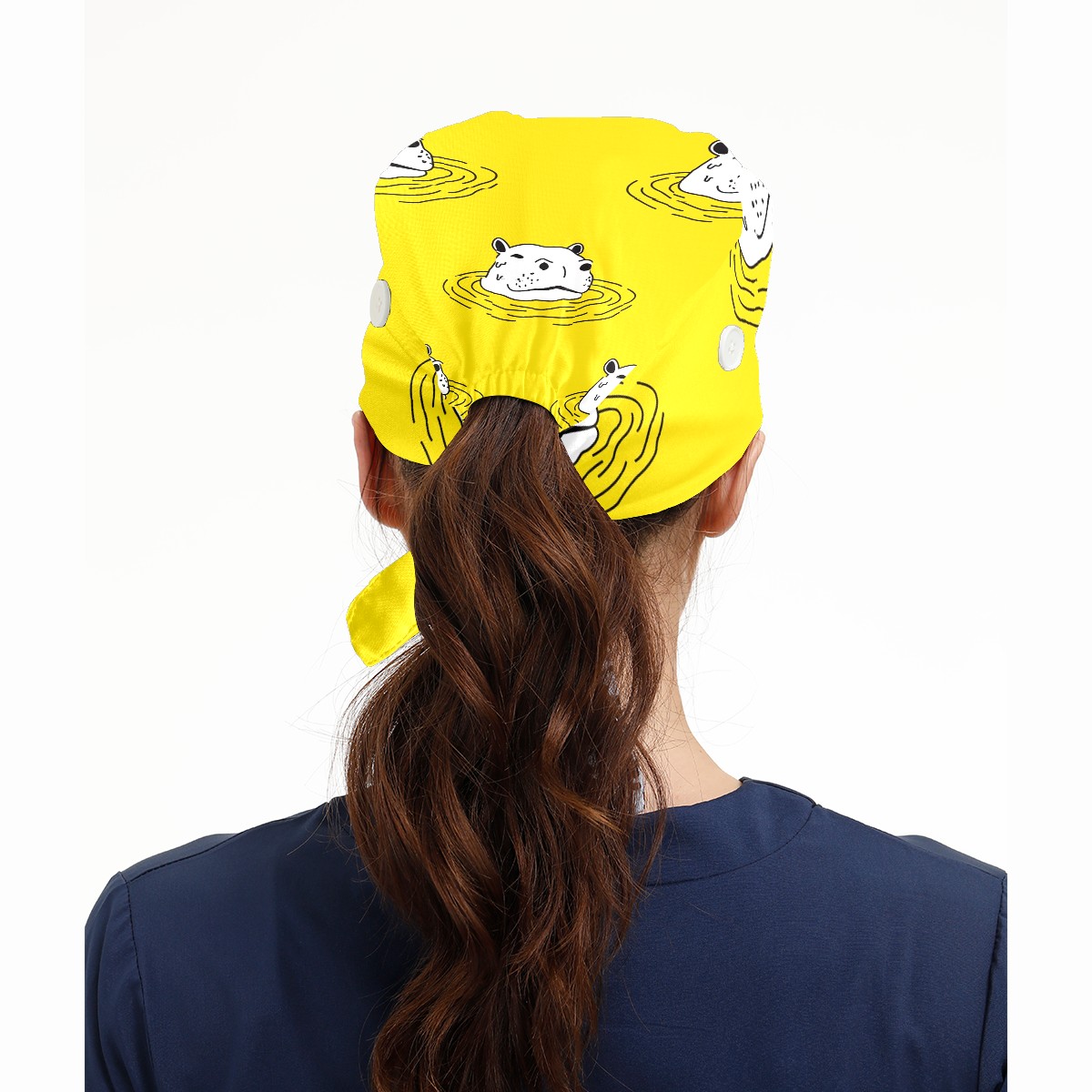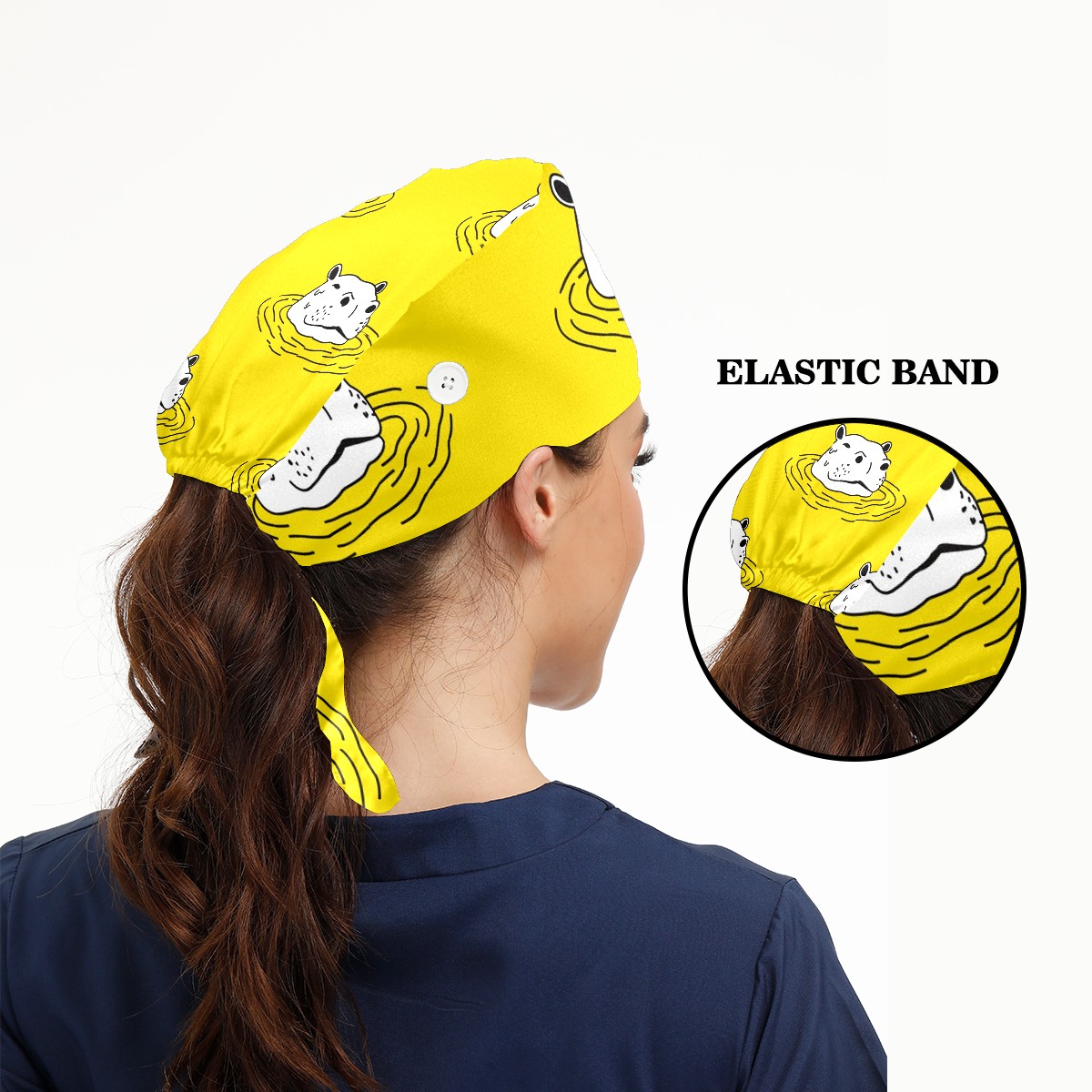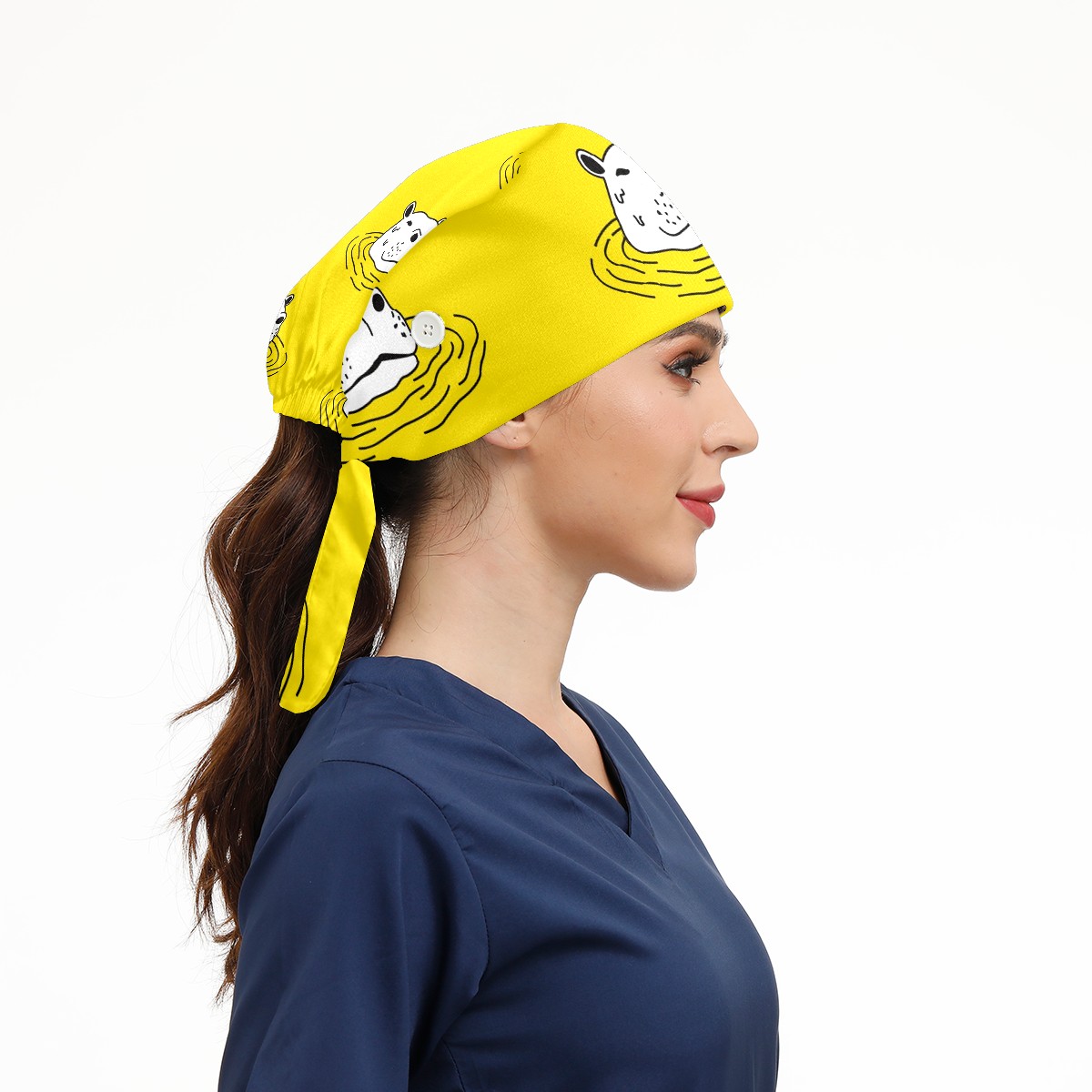 Working Caps with Button & Sweatband Satin Lined Cotton Adjustable Nurse Hats Elastic Band Scrub Cap Surgeon Hat Cute Hippo On Yellow Background