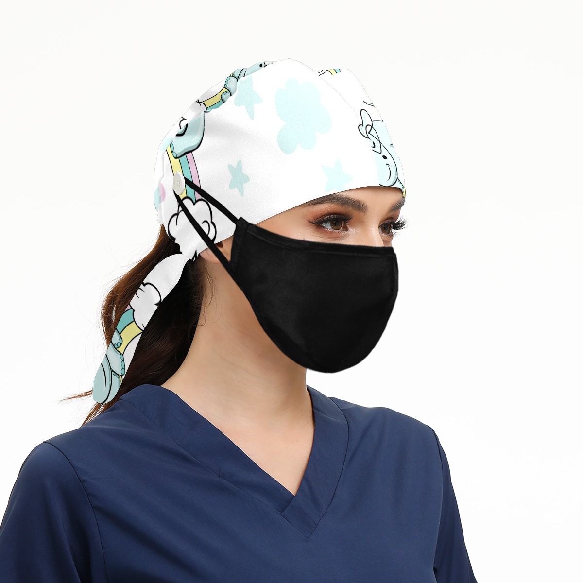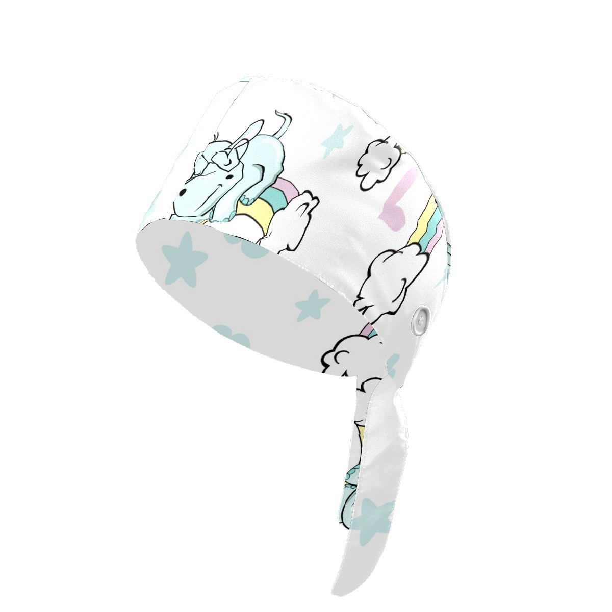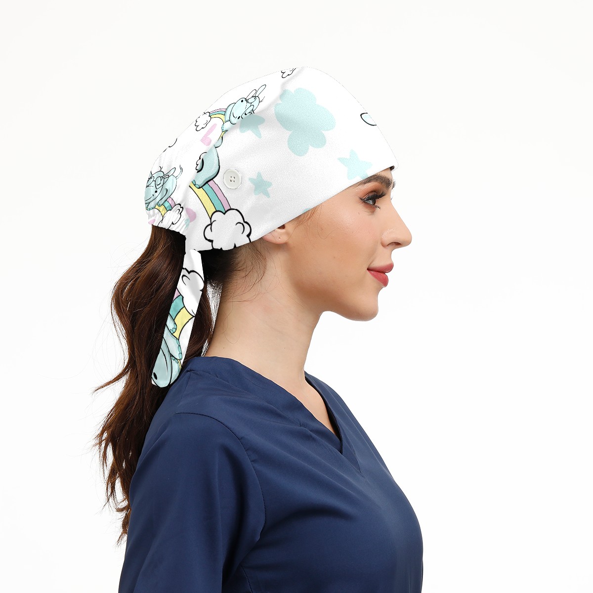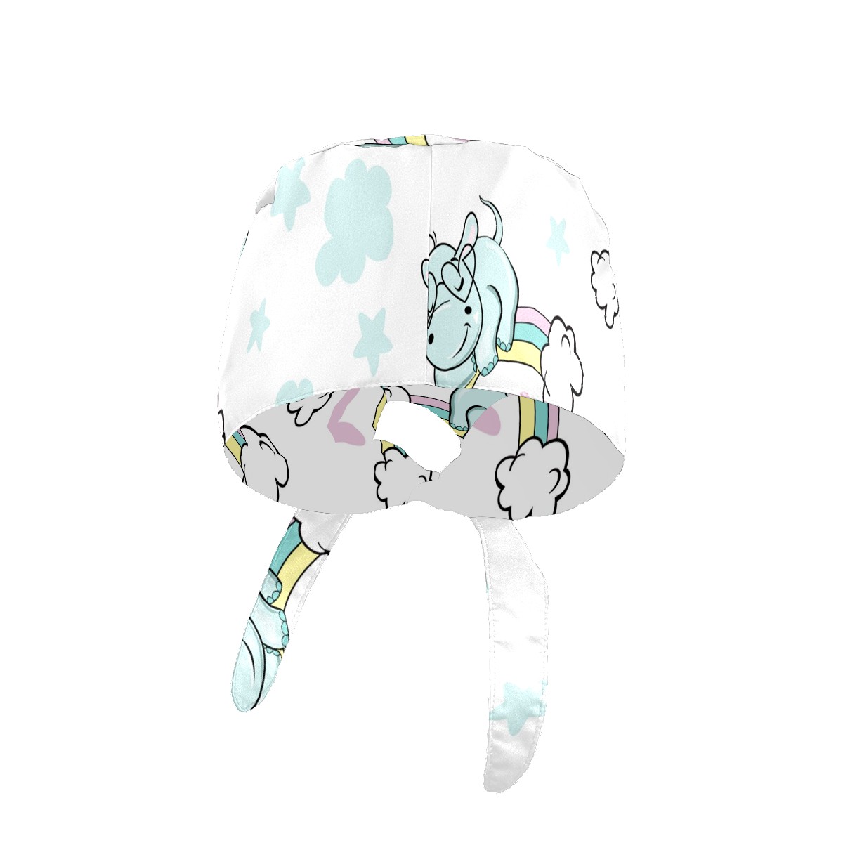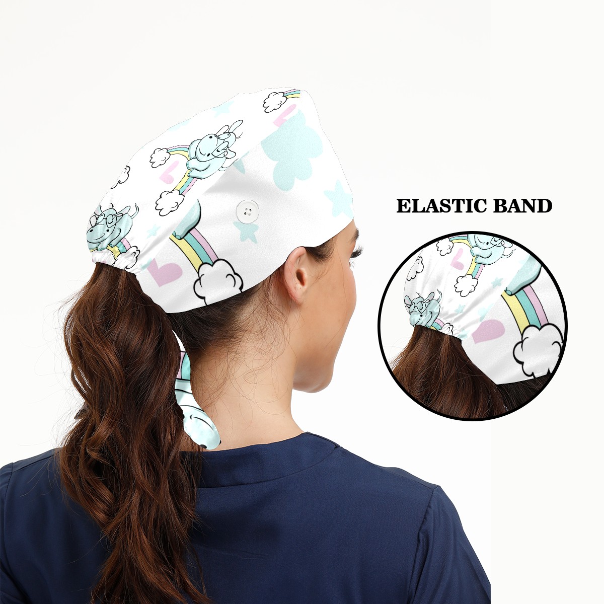 Working Caps with Button & Sweatband Satin Lined Cotton Adjustable Nurse Hats Elastic Band Scrub Cap Surgeon Hat Cute Hippo Rainbow Star