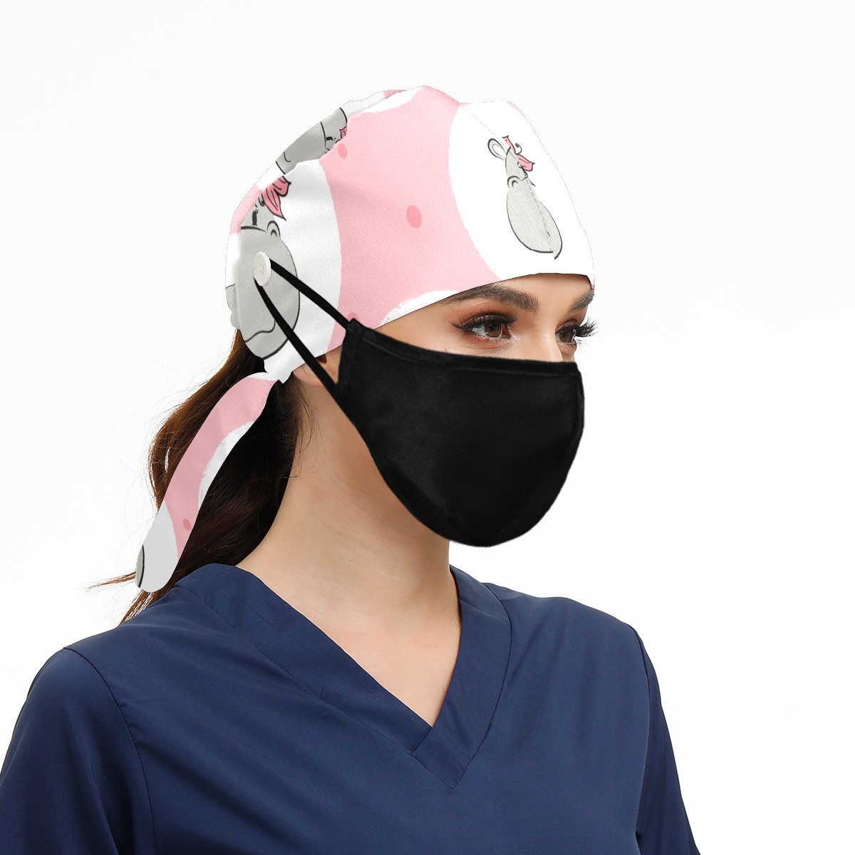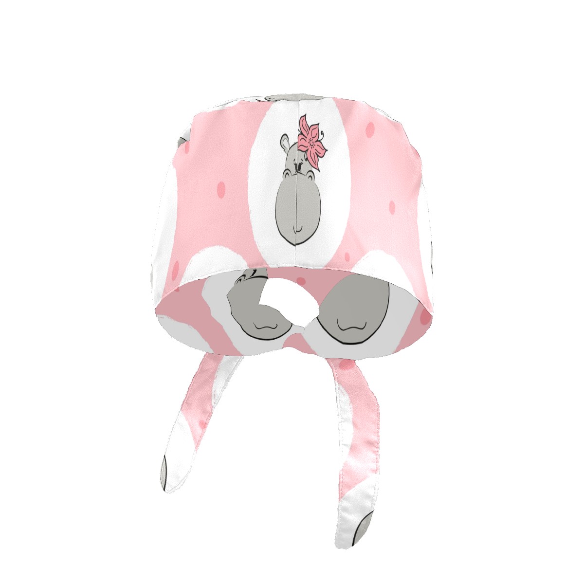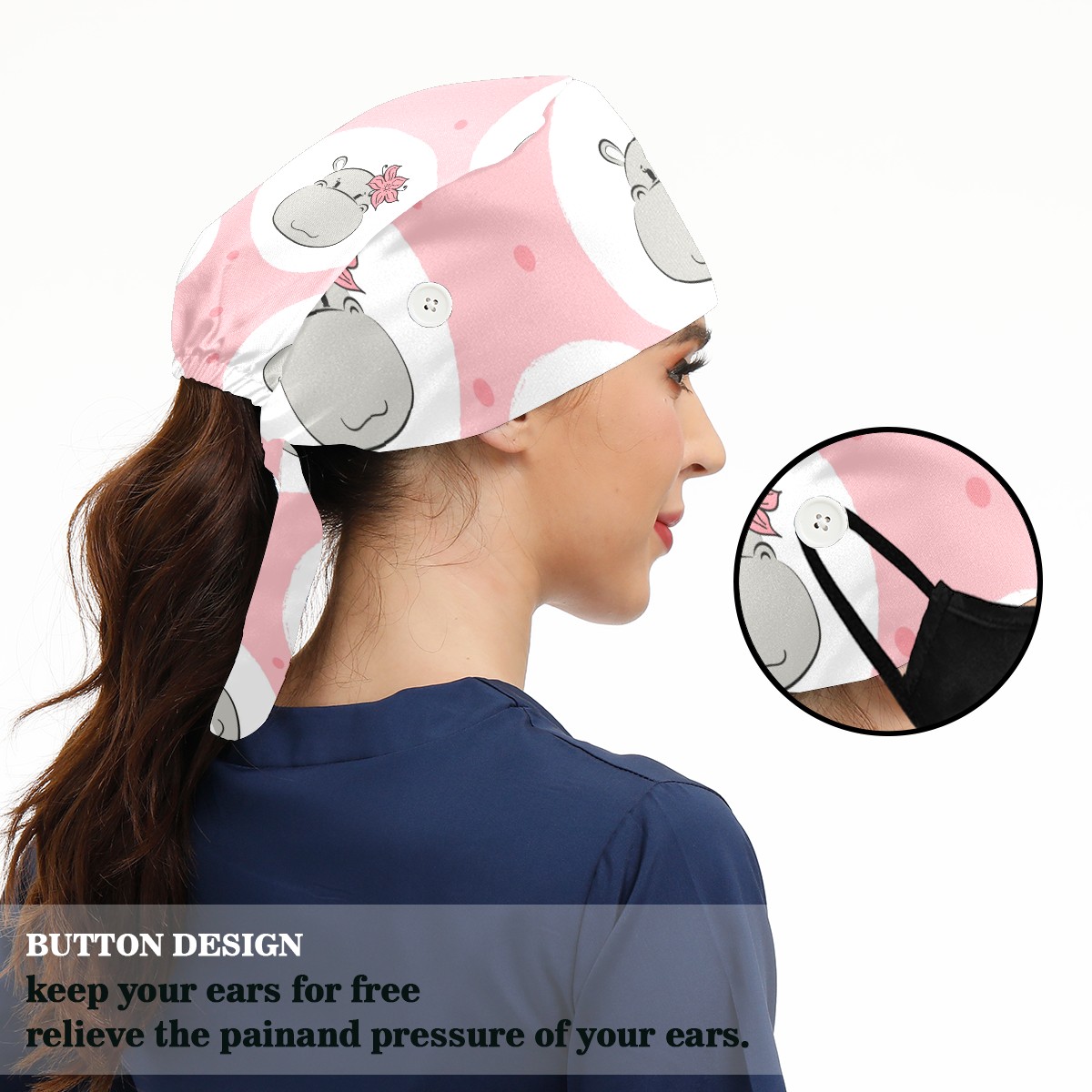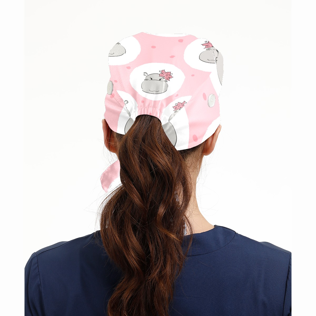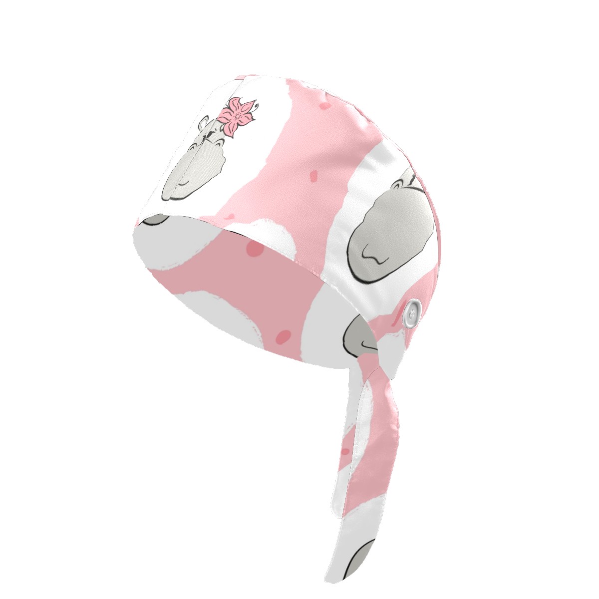 Working Caps with Button & Sweatband Satin Lined Cotton Adjustable Nurse Hats Elastic Band Scrub Cap Surgeon Hat Cute Hippo Flower On Pink Background