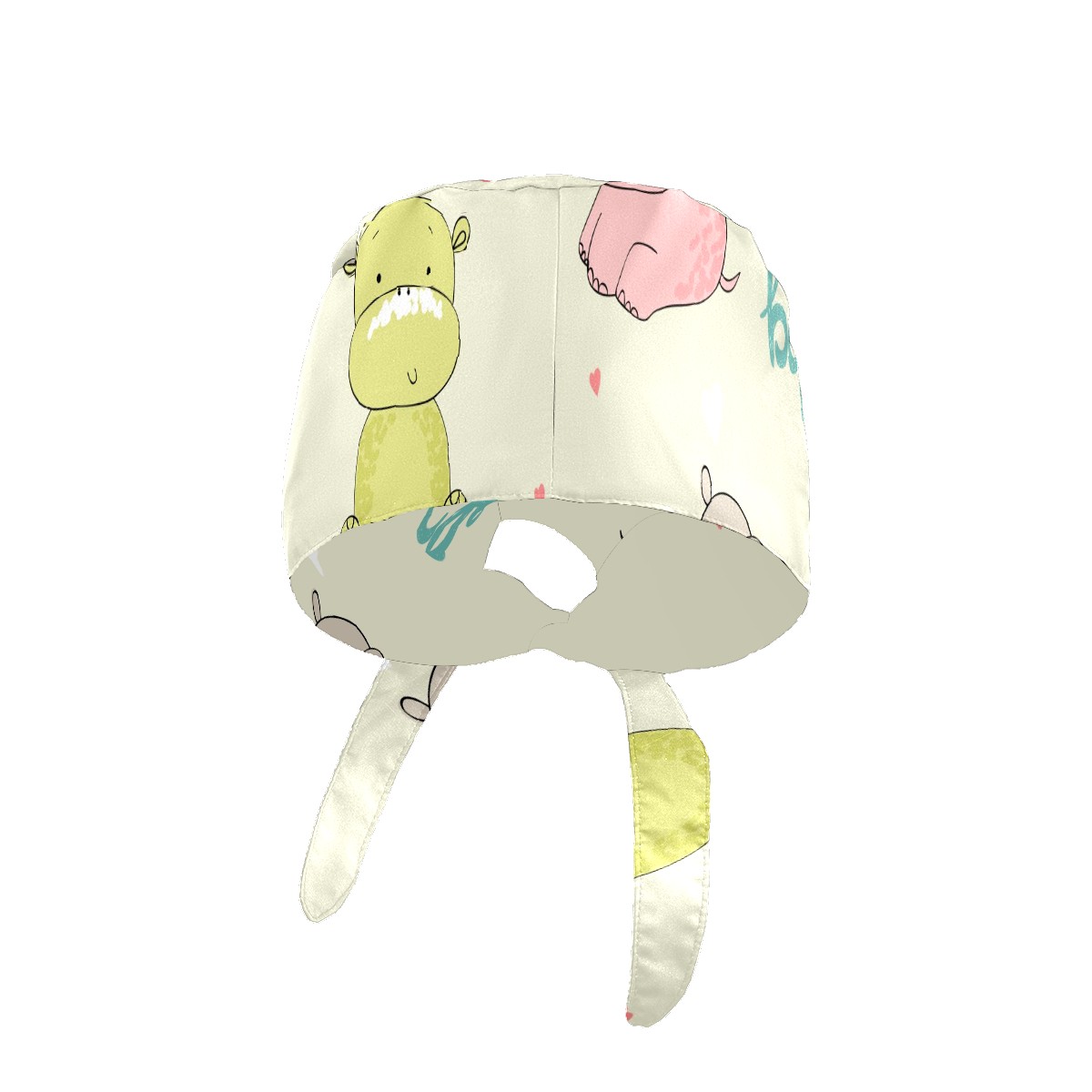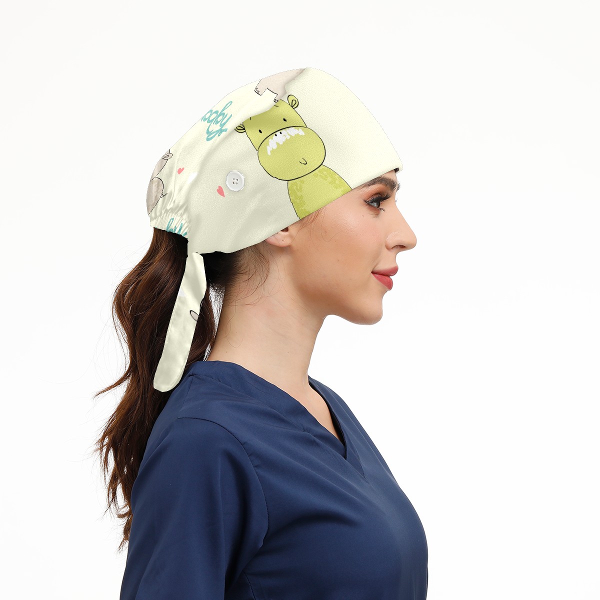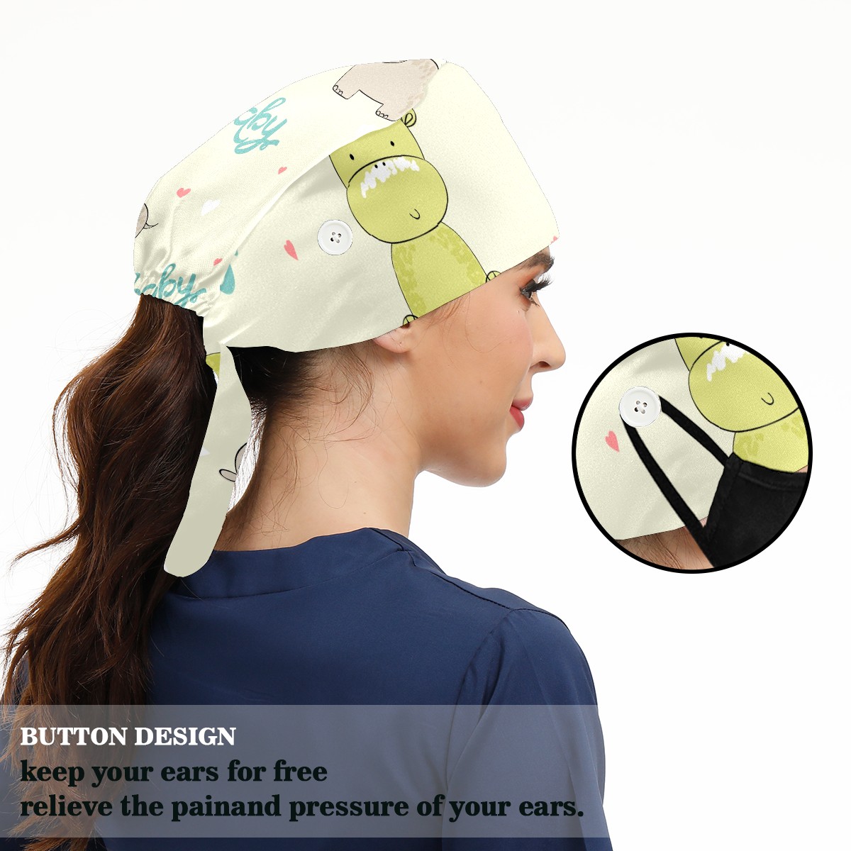 Working Caps with Button & Sweatband Satin Lined Cotton Adjustable Nurse Hats Elastic Band Scrub Cap Surgeon Hat Cute Colorful Hippo