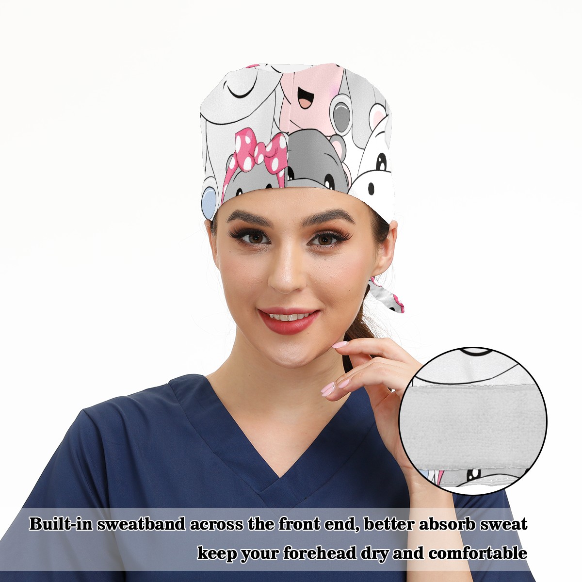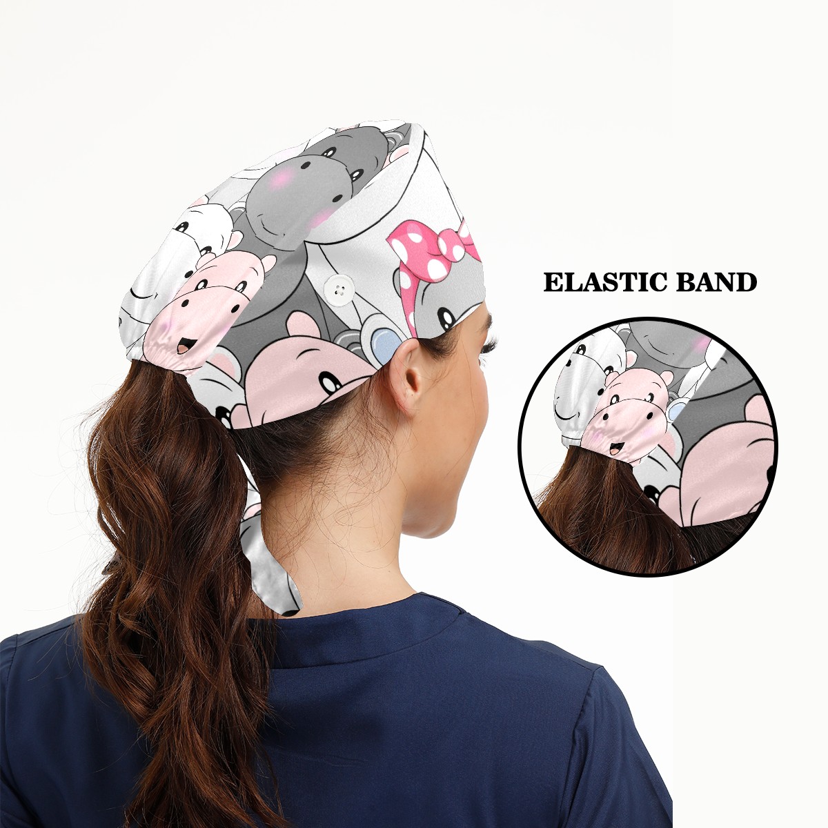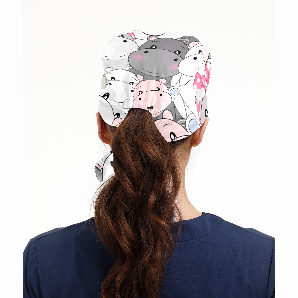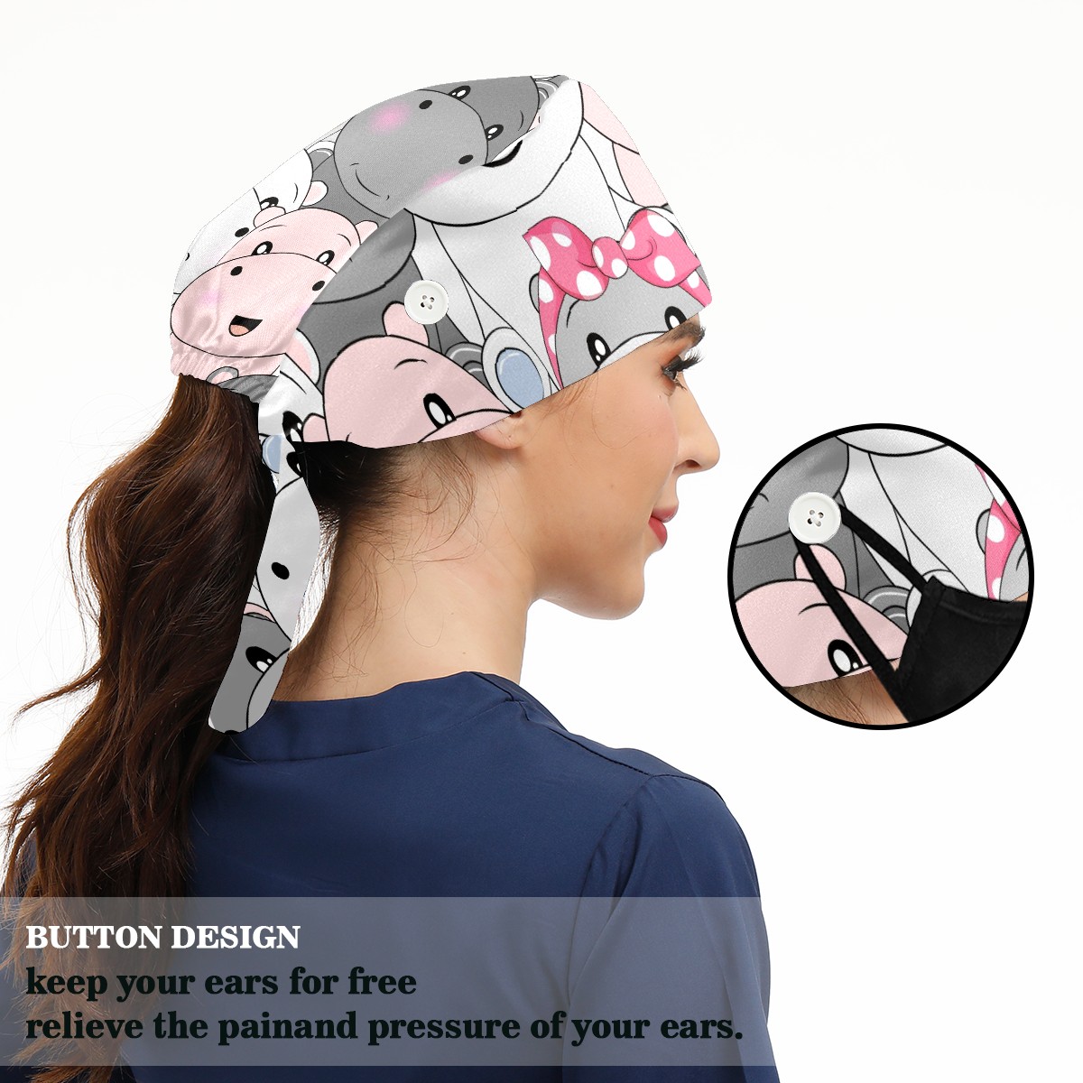 Working Caps with Button & Sweatband Satin Lined Cotton Adjustable Nurse Hats Elastic Band Scrub Cap Surgeon Hat Cute Baby Hippo