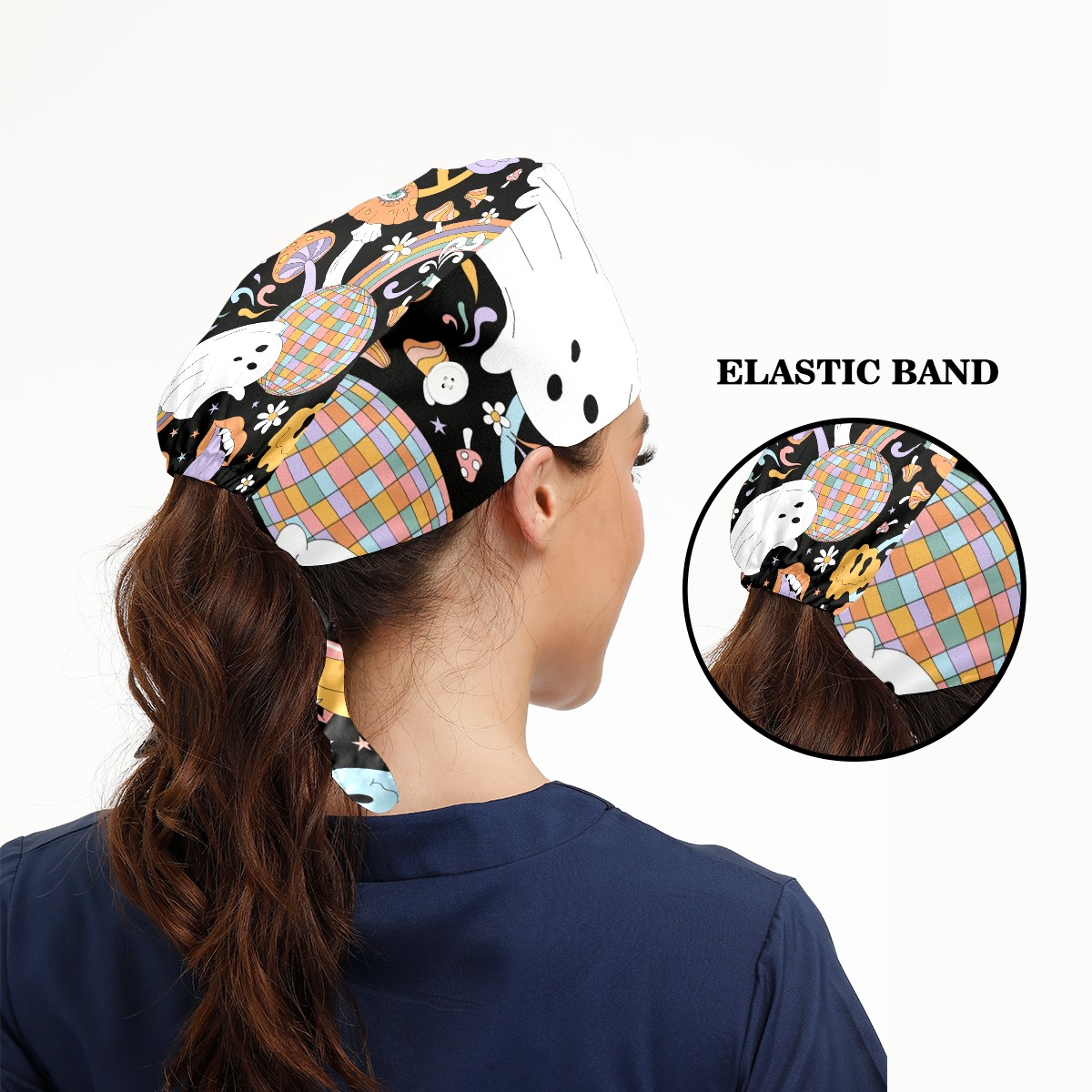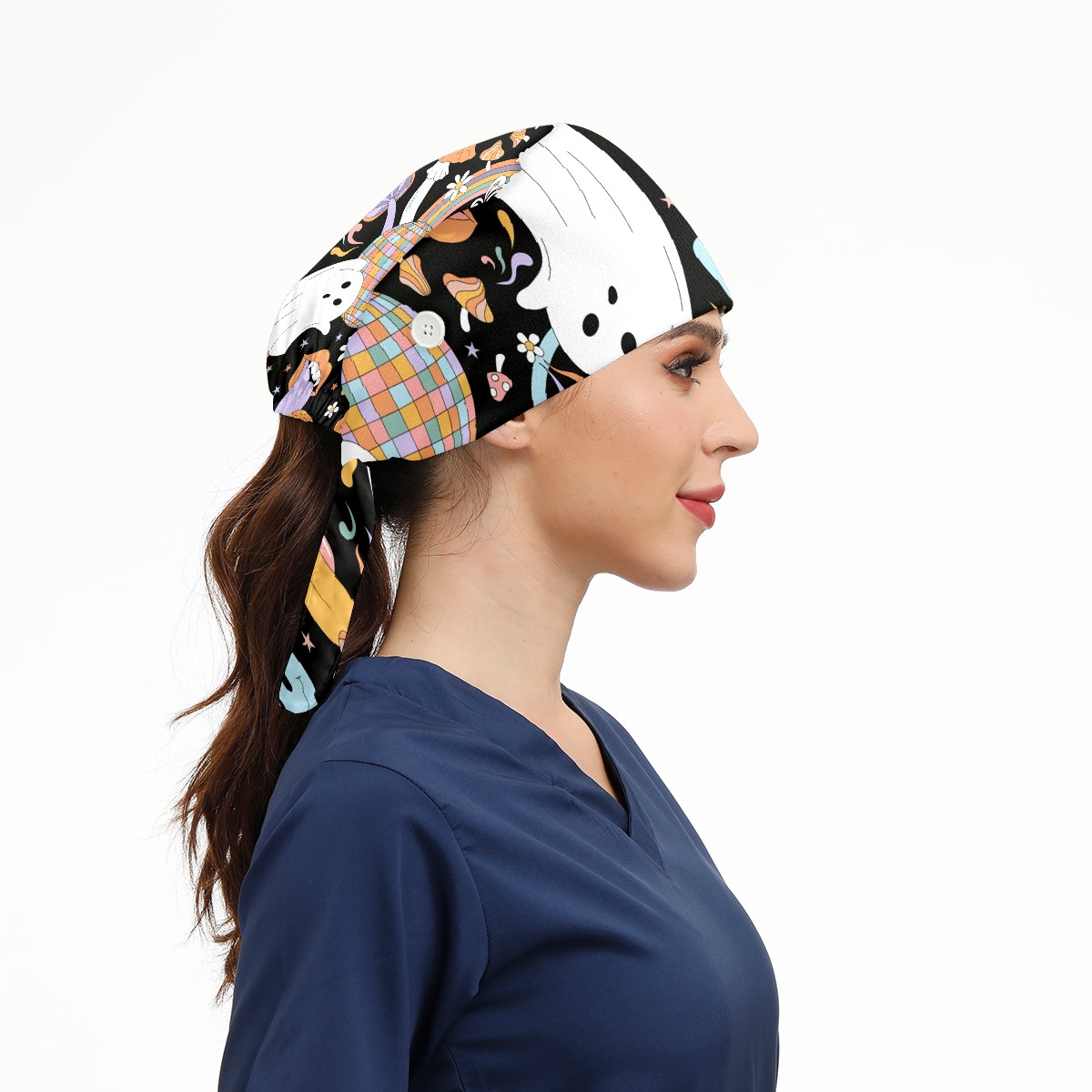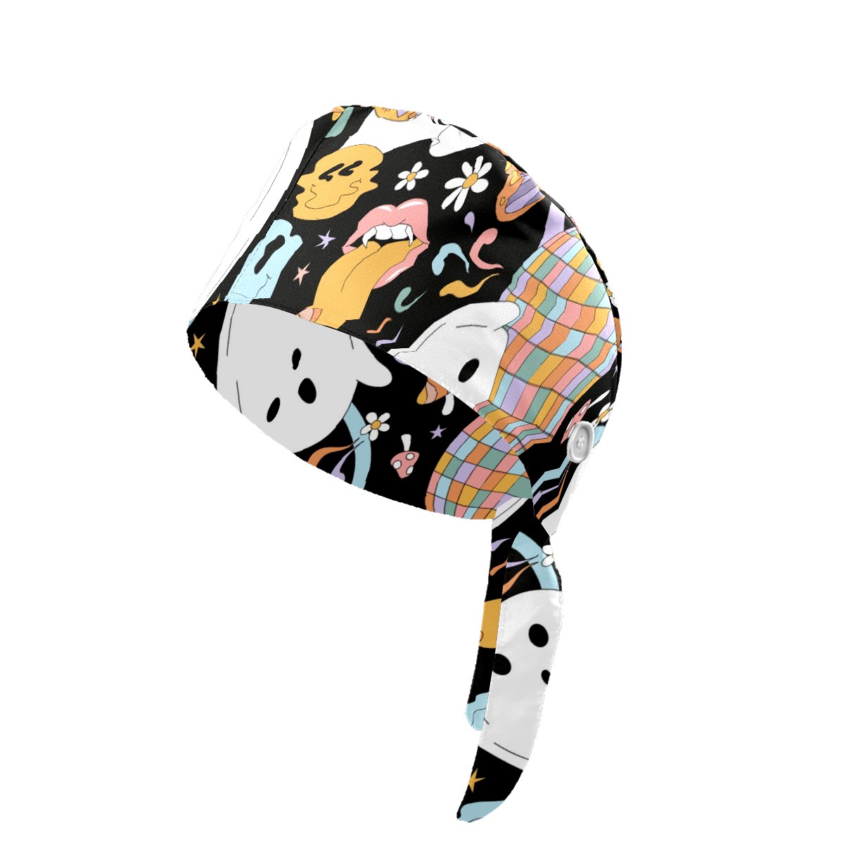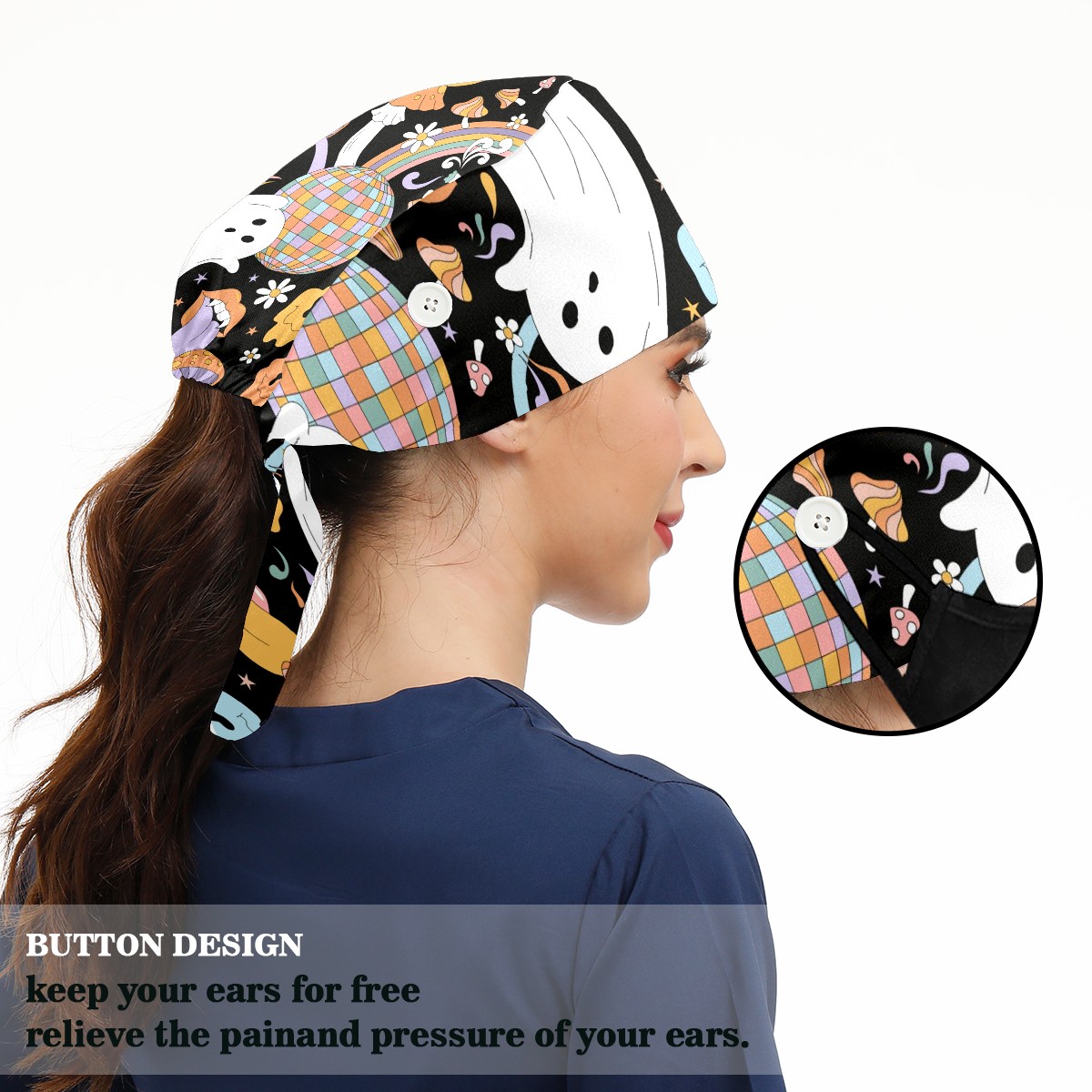 Working Caps with Button & Sweatband Satin Lined Cotton Adjustable Nurse Hats Elastic Band Scrub Cap Surgeon Hat Retro Halloween Hippie Ghost Daisy Flower Rainbow