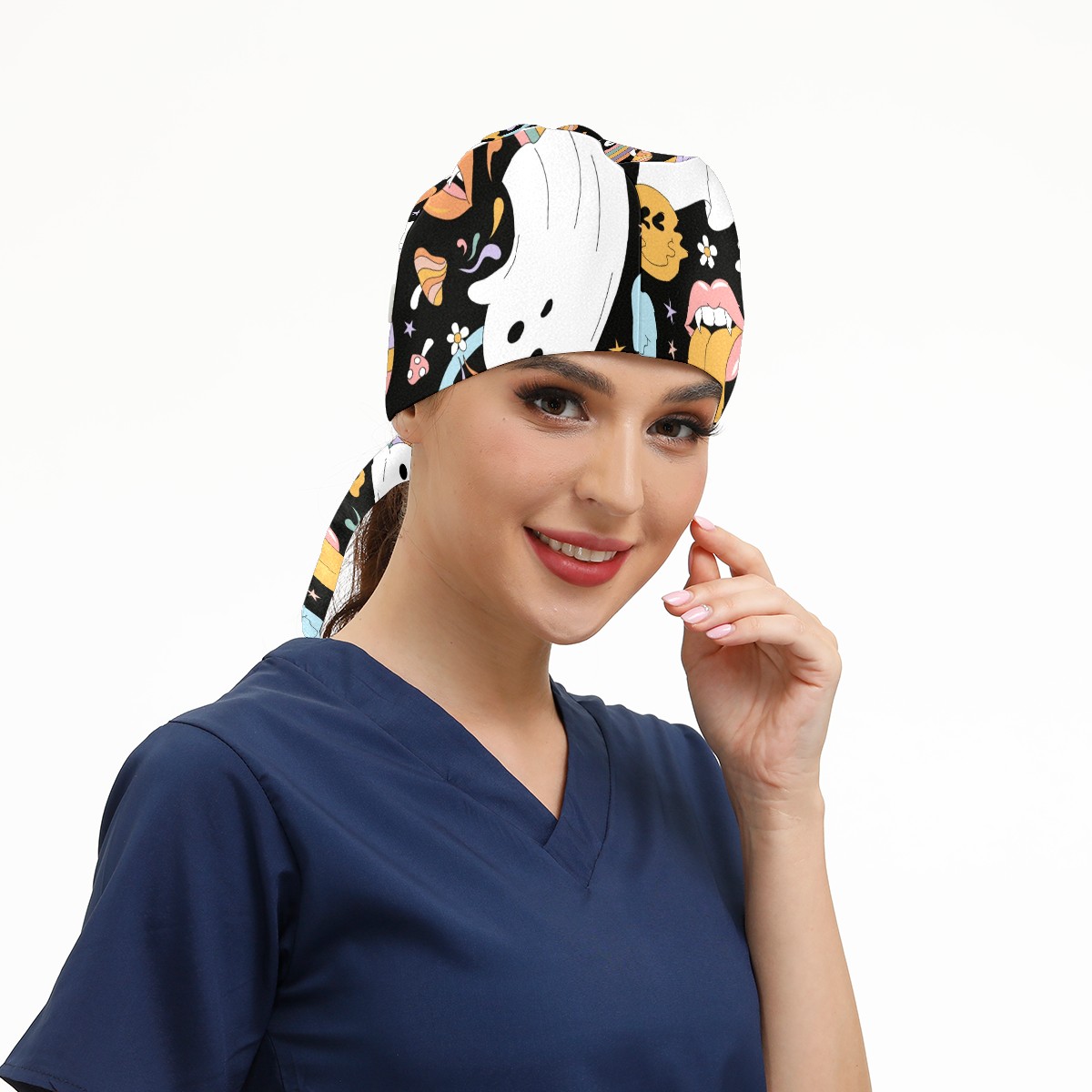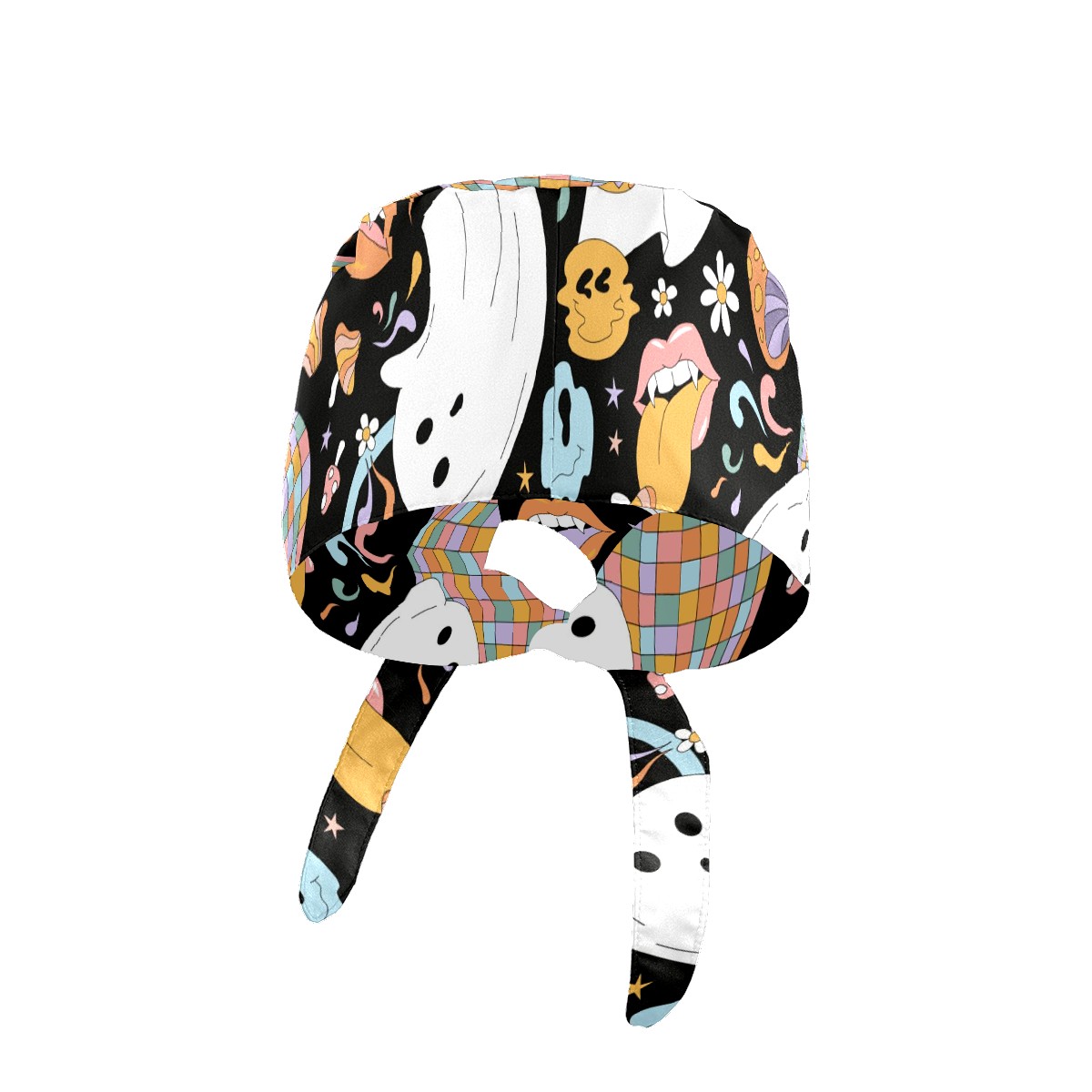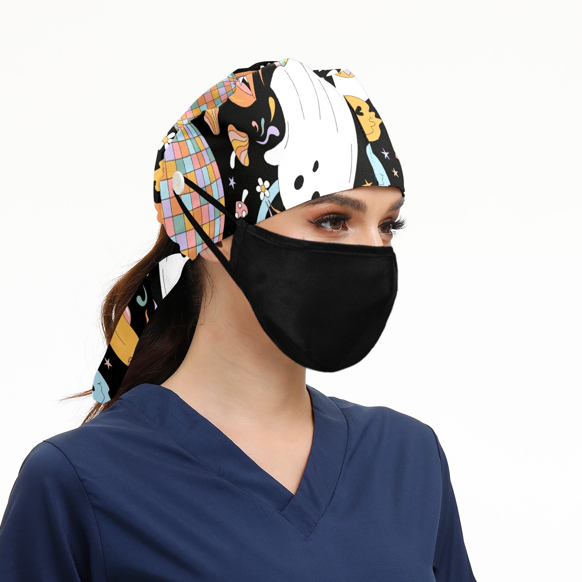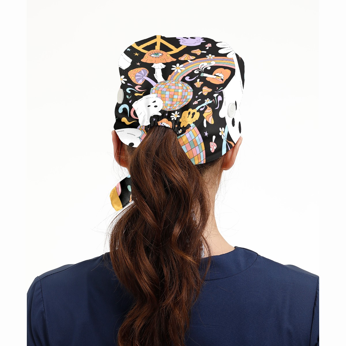 Working Caps with Button & Sweatband Satin Lined Cotton Adjustable Nurse Hats Elastic Band Scrub Cap Surgeon Hat Retro Halloween Hippie Ghost Daisy Flower Rainbow