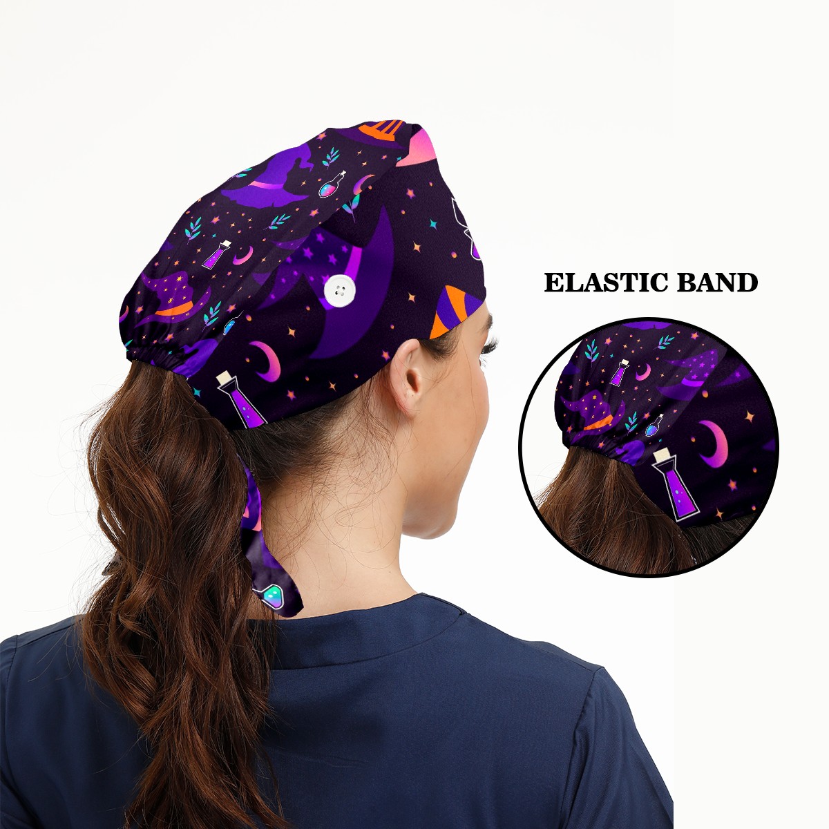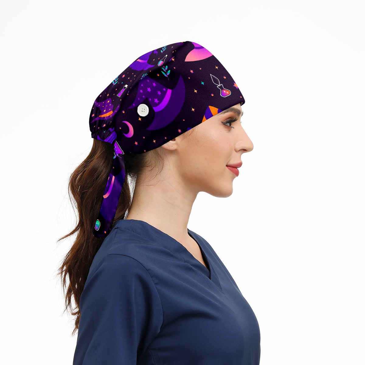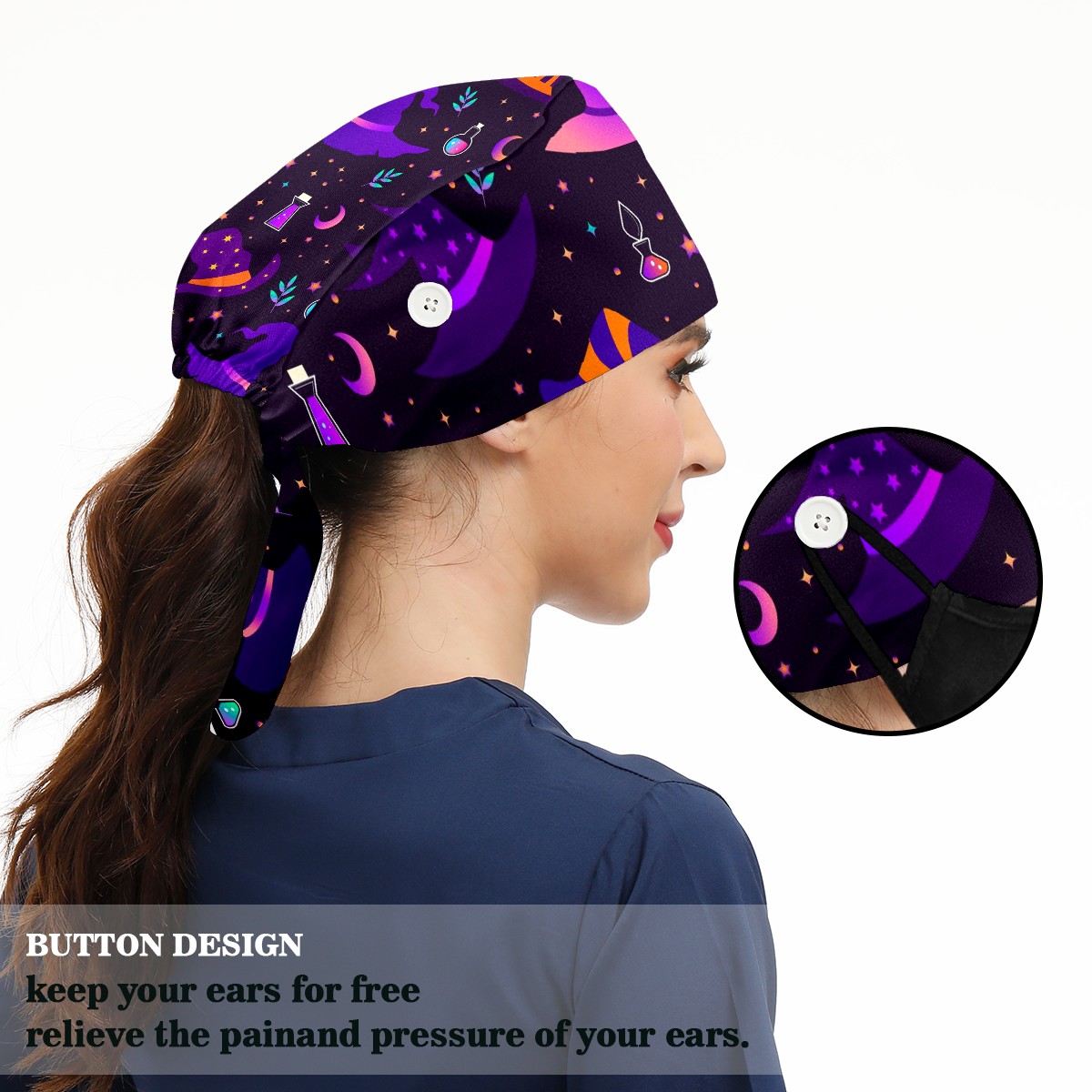 Working Caps with Button & Sweatband Satin Lined Cotton Adjustable Nurse Hats Elastic Band Scrub Cap Surgeon Hat Magic Witch Hats Stars Moon