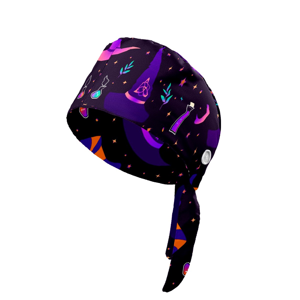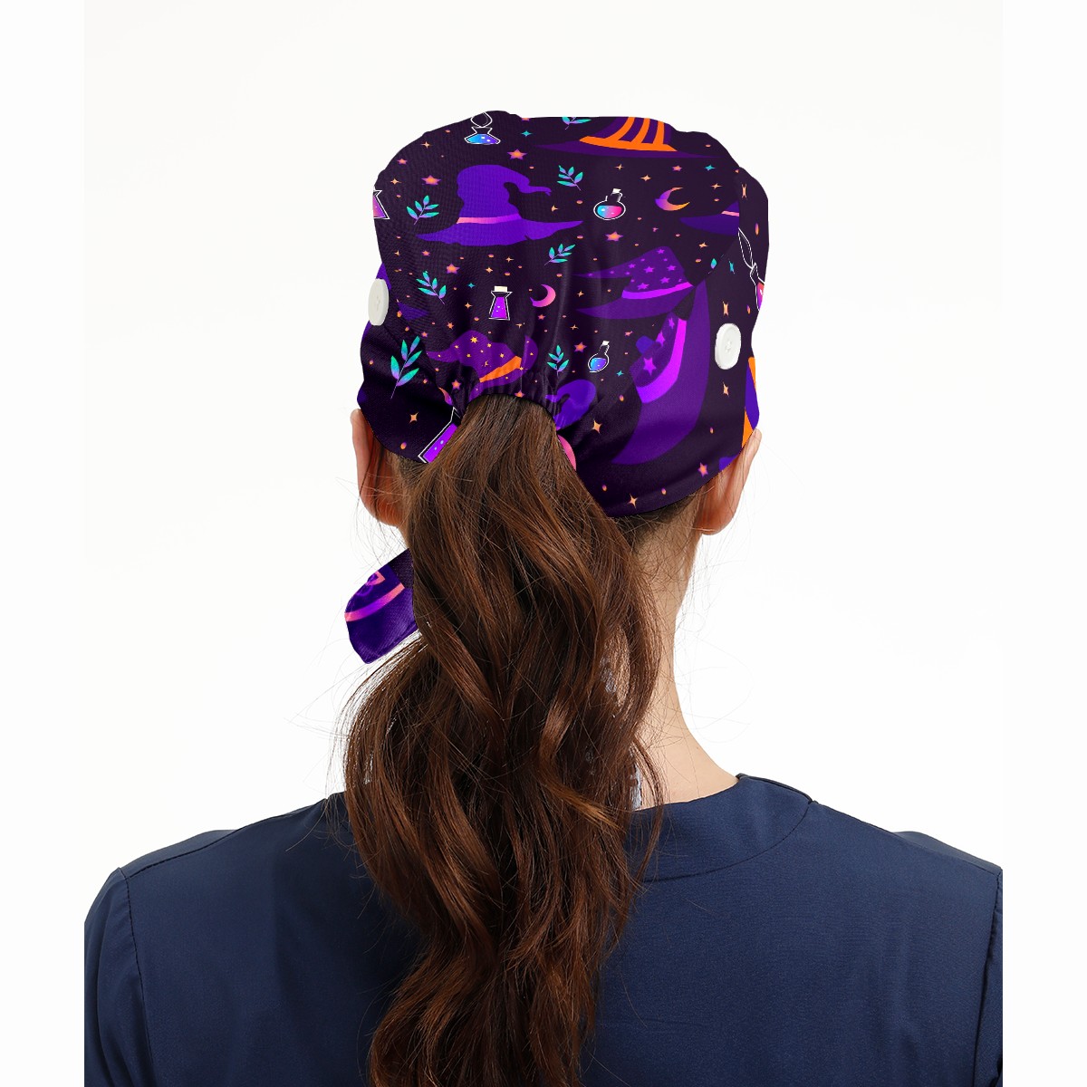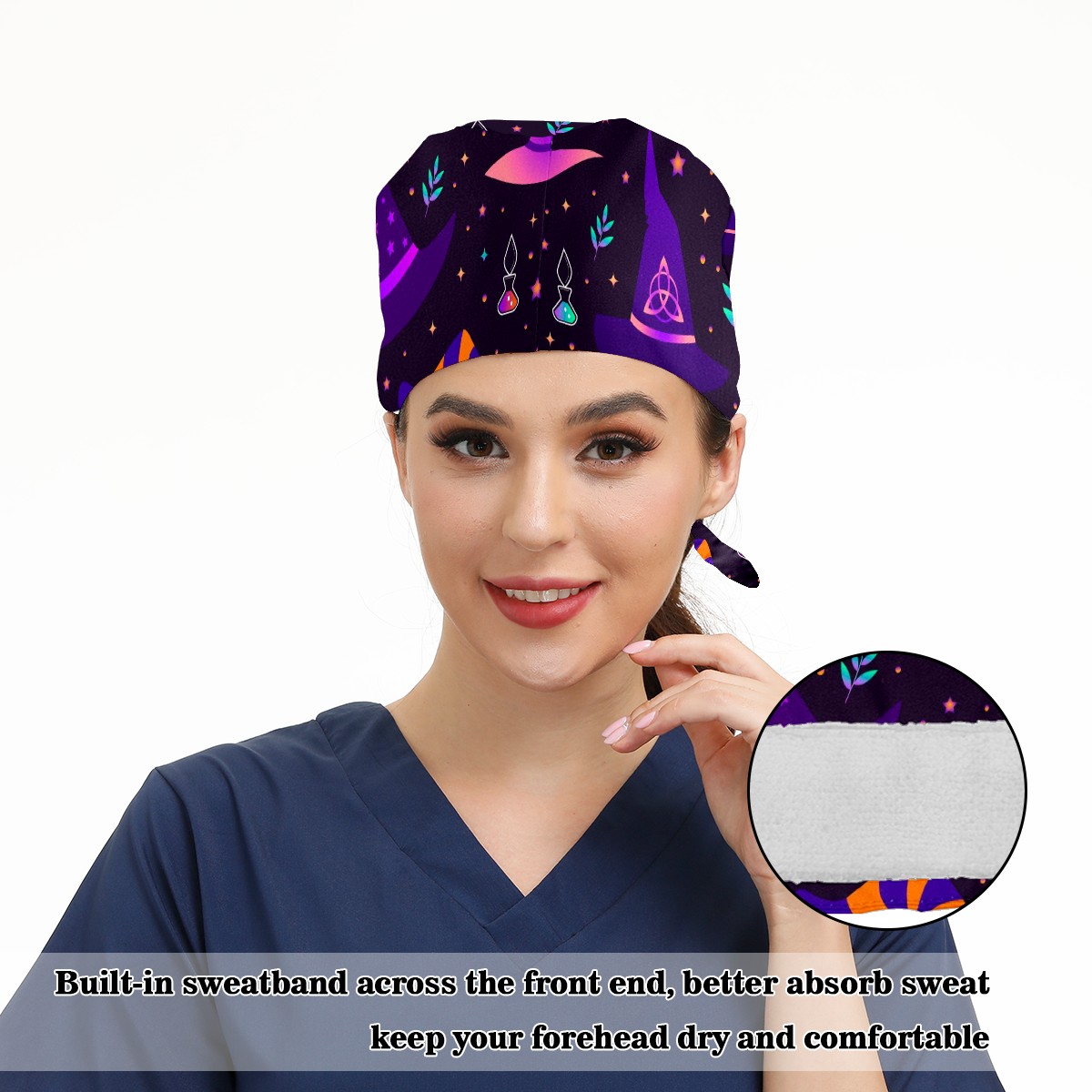 Working Caps with Button & Sweatband Satin Lined Cotton Adjustable Nurse Hats Elastic Band Scrub Cap Surgeon Hat Magic Witch Hats Stars Moon