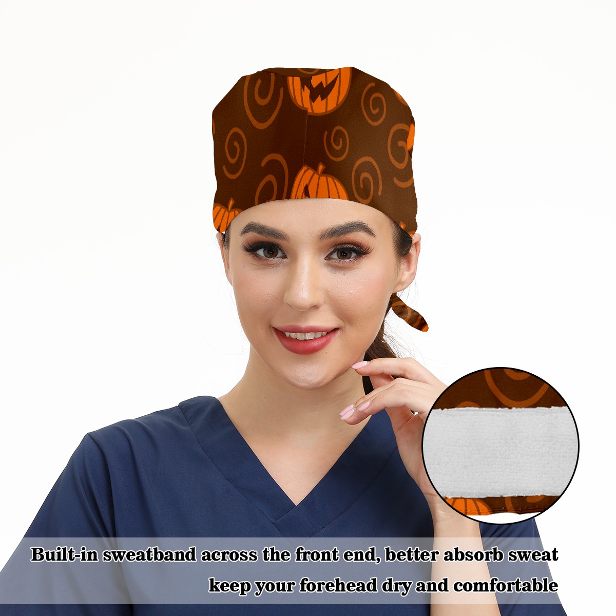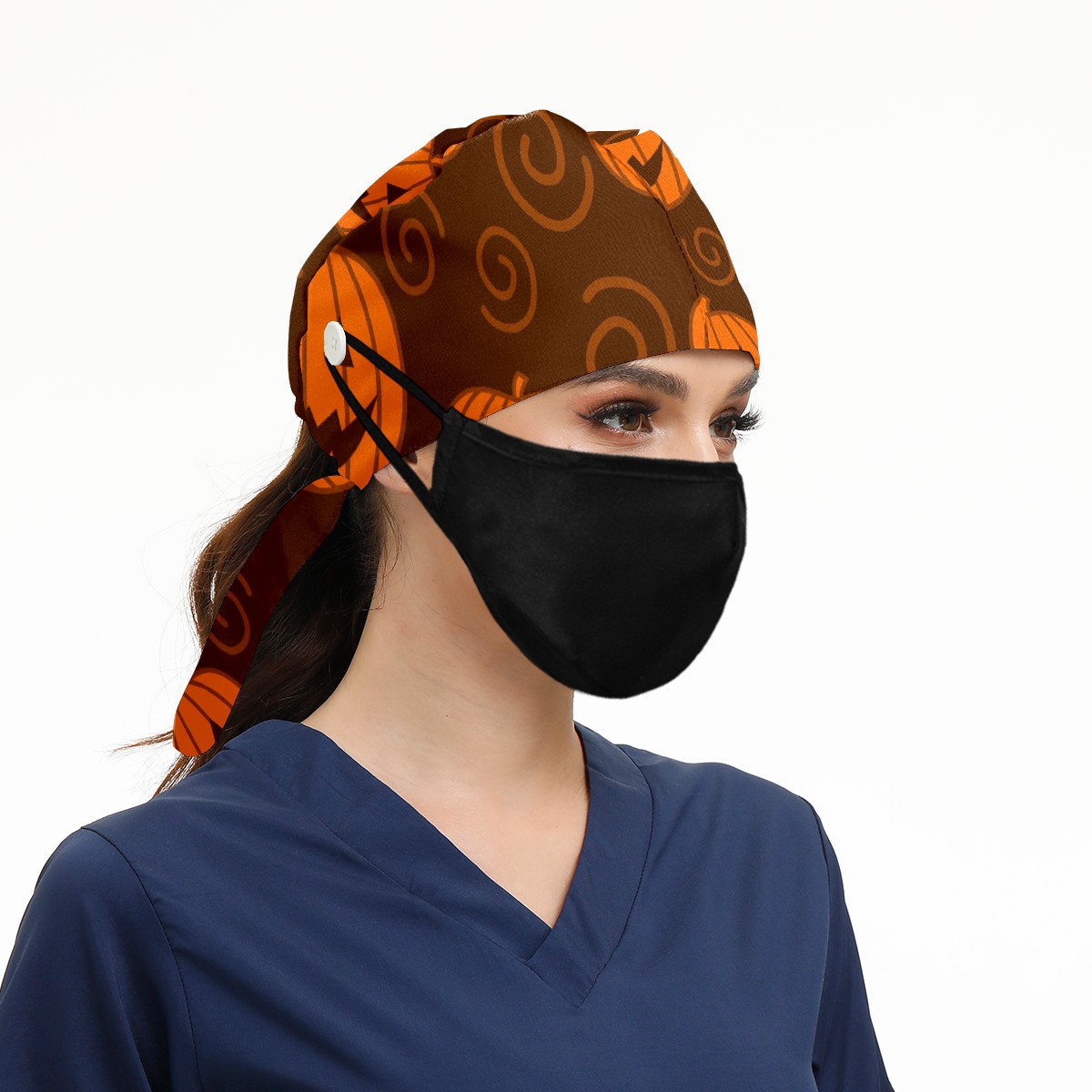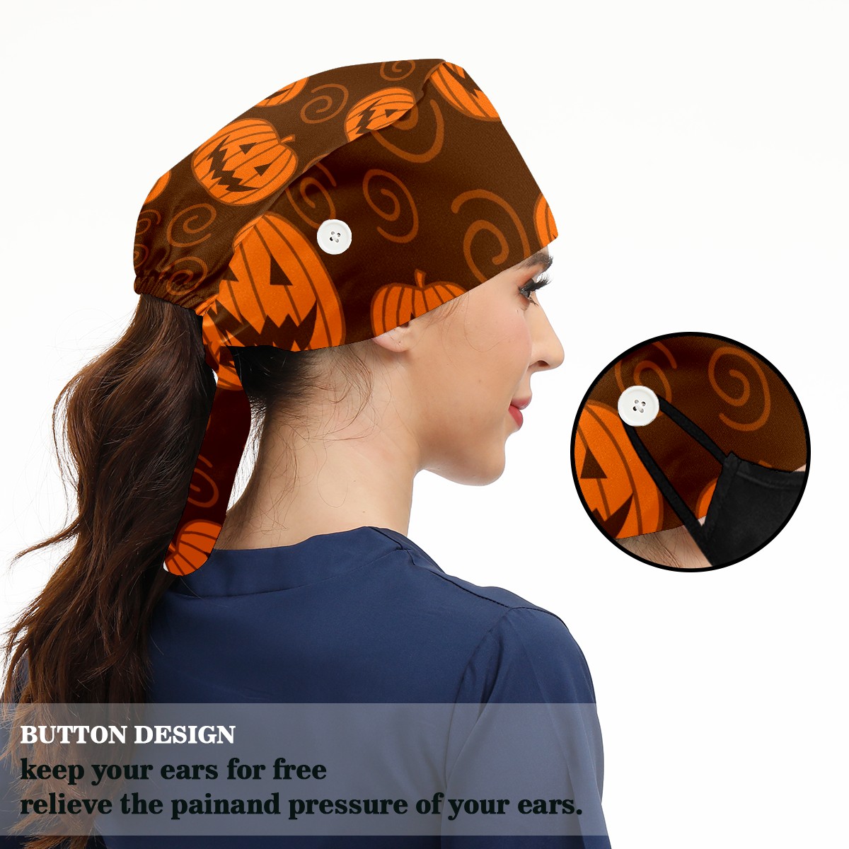 Working Caps with Button & Sweatband Satin Lined Cotton Adjustable Nurse Hats Elastic Band Scrub Cap Surgeon Hat Hallowen Orange Pumpkin