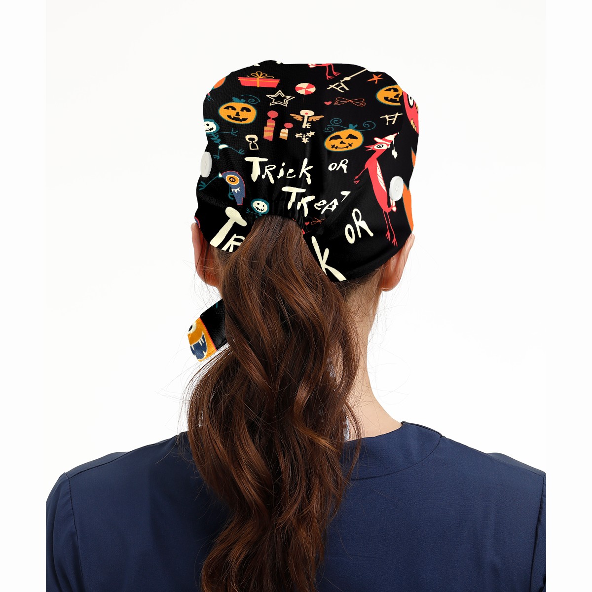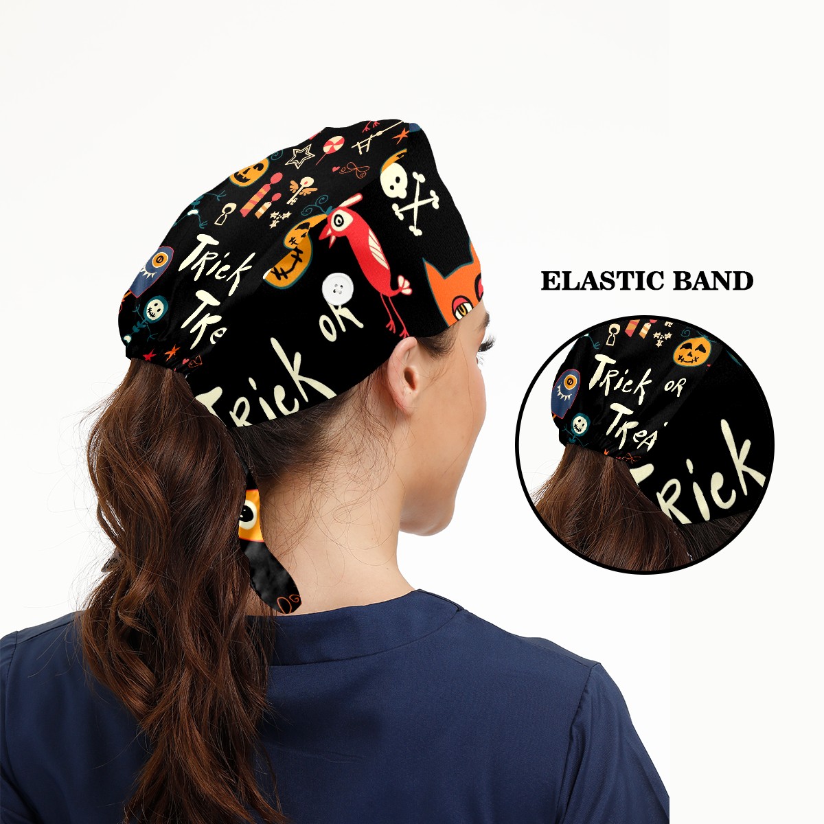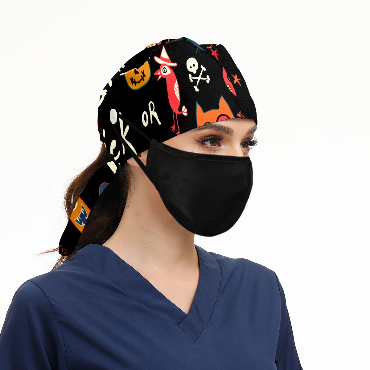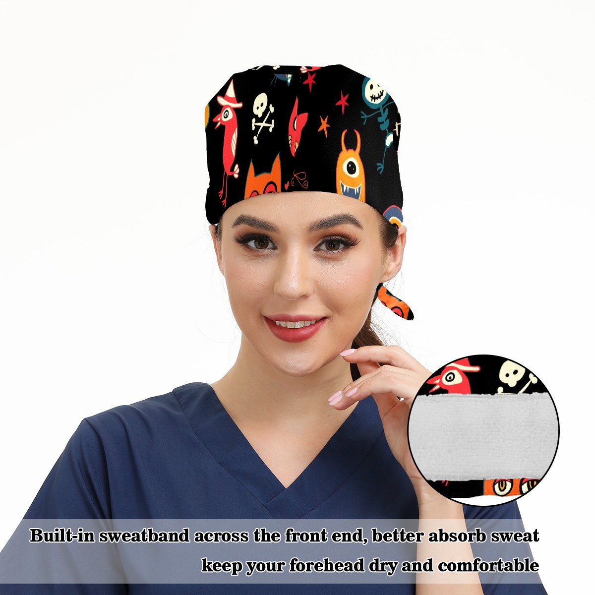 Working Caps with Button & Sweatband Satin Lined Cotton Adjustable Nurse Hats Elastic Band Scrub Cap Surgeon Hat Halloween Trick-or-Treat Pattern