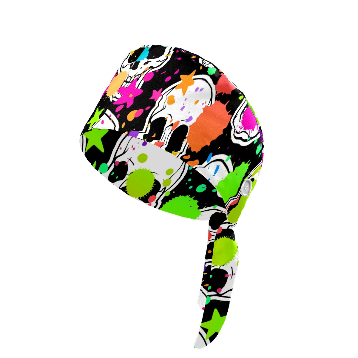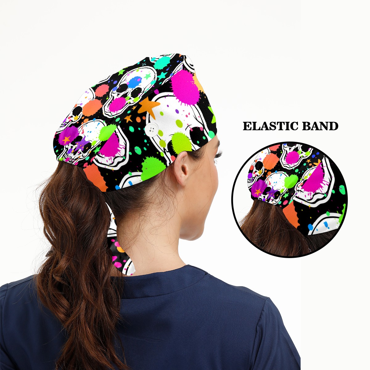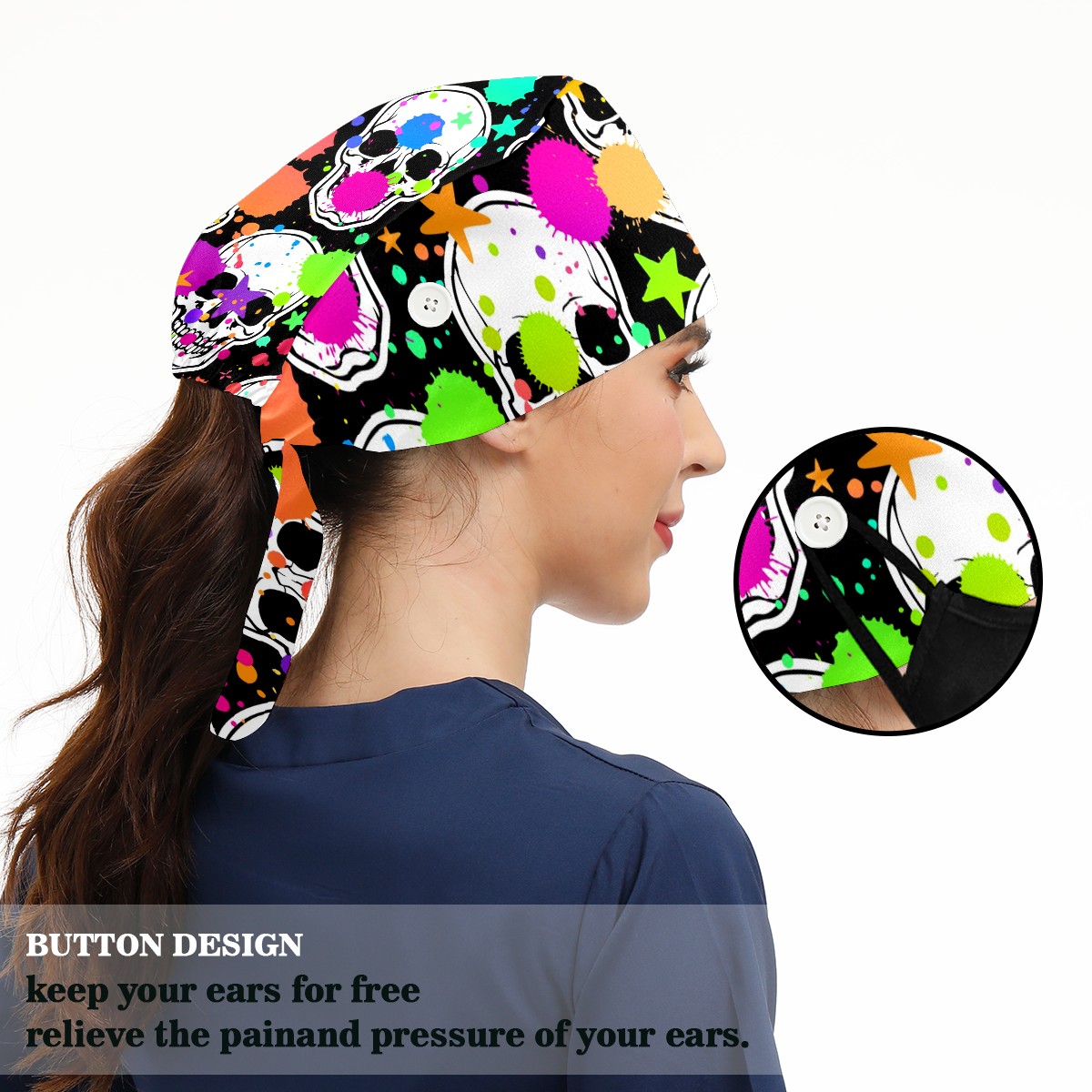 Working Caps with Button & Sweatband Satin Lined Cotton Adjustable Nurse Hats Elastic Band Scrub Cap Surgeon Hat Halloween Skull Doodle