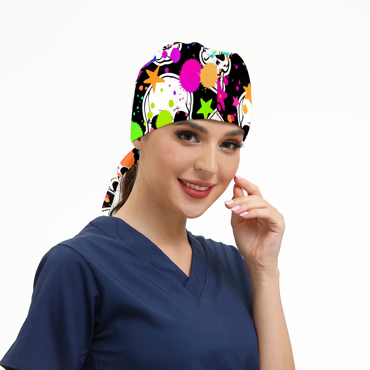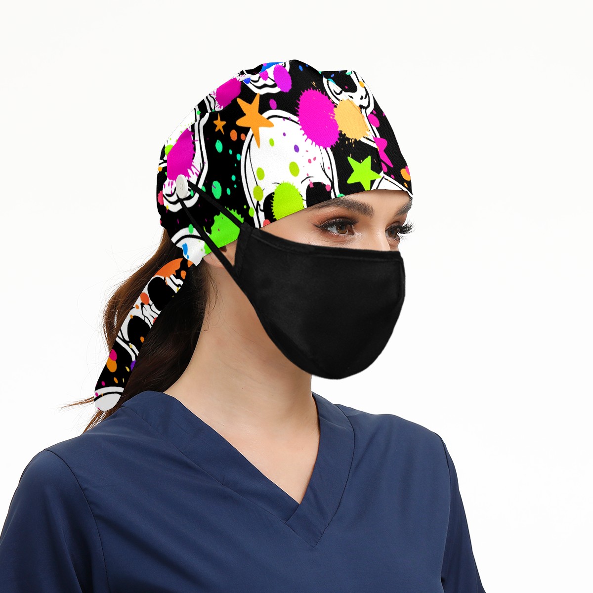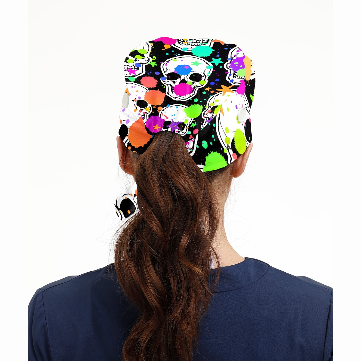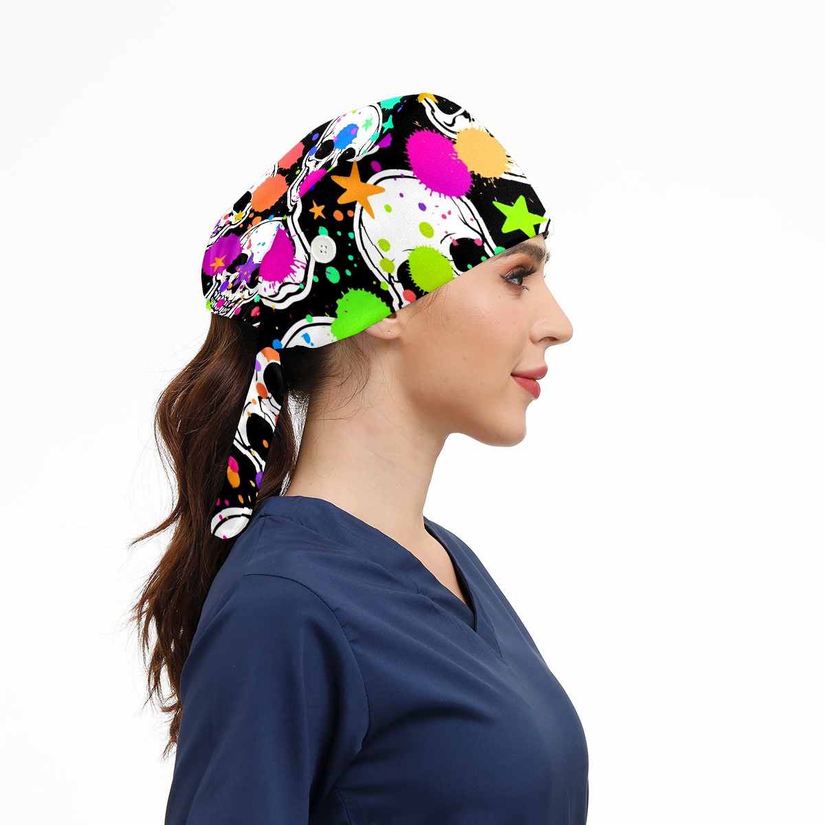 Working Caps with Button & Sweatband Satin Lined Cotton Adjustable Nurse Hats Elastic Band Scrub Cap Surgeon Hat Halloween Skull Doodle