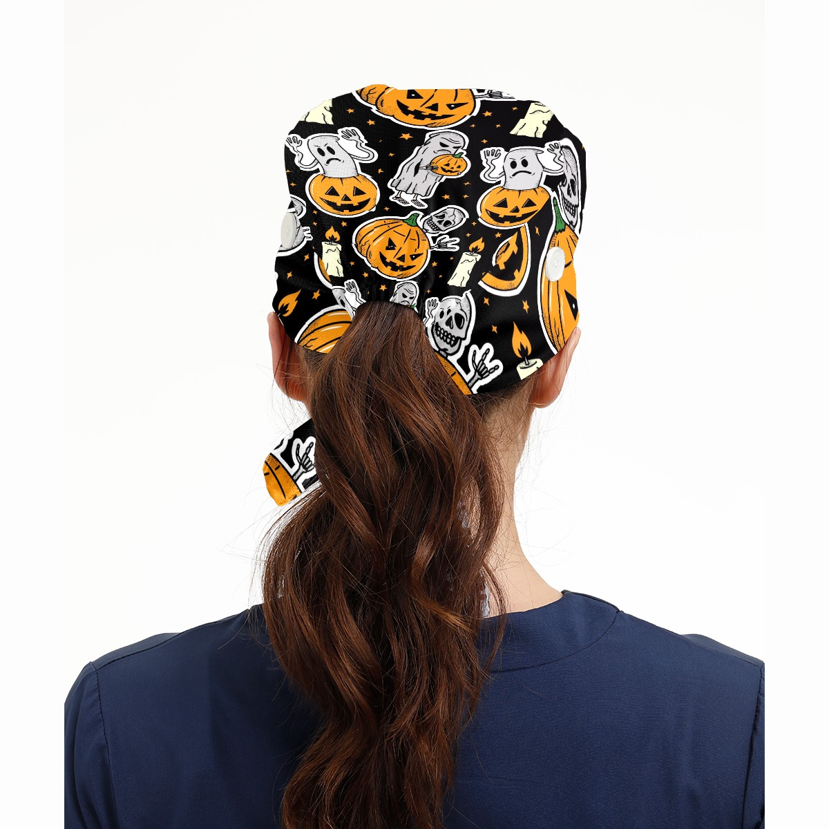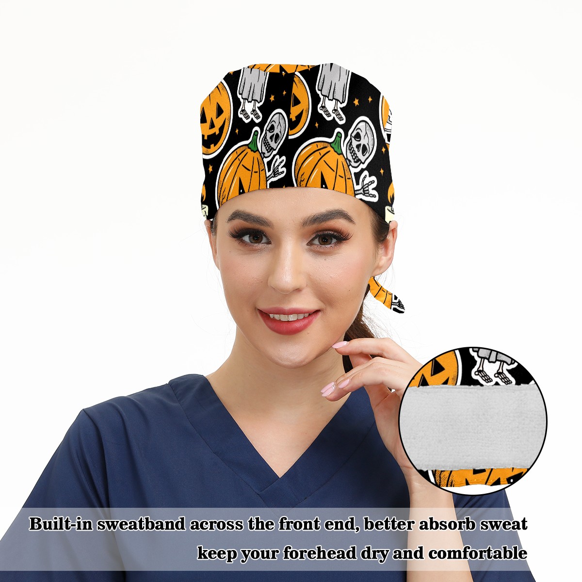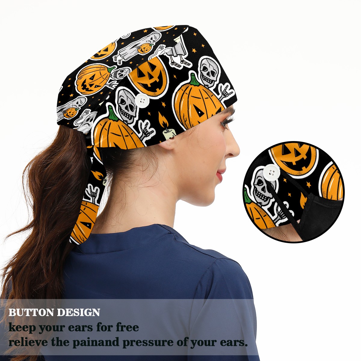 Working Caps with Button & Sweatband Satin Lined Cotton Adjustable Nurse Hats Elastic Band Scrub Cap Surgeon Hat Halloween Skeleton Ghost Pumpkin Candle