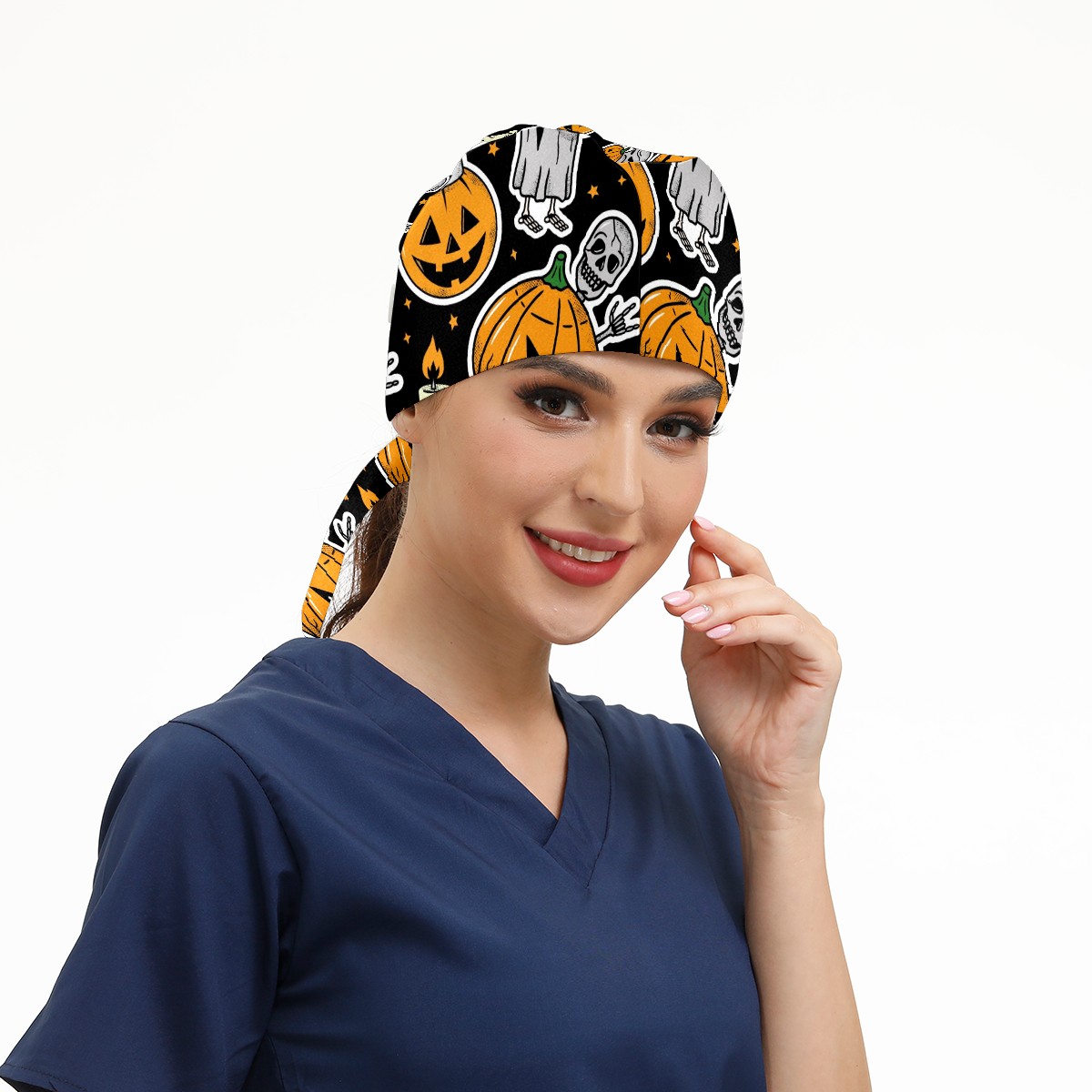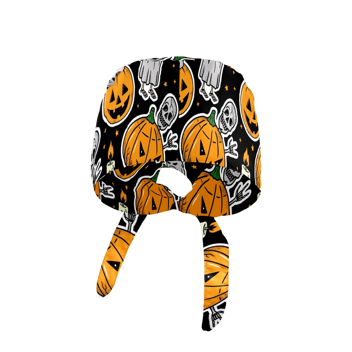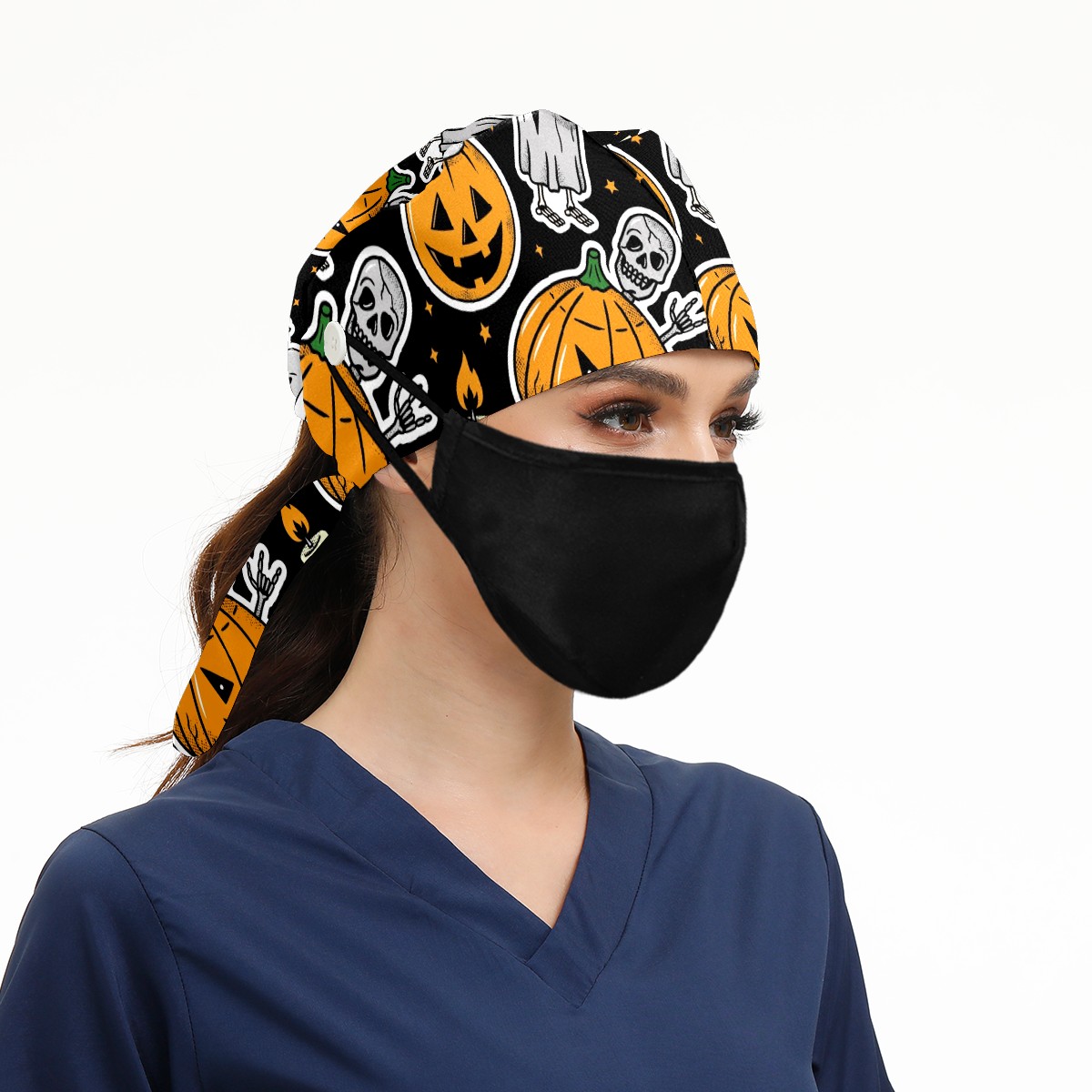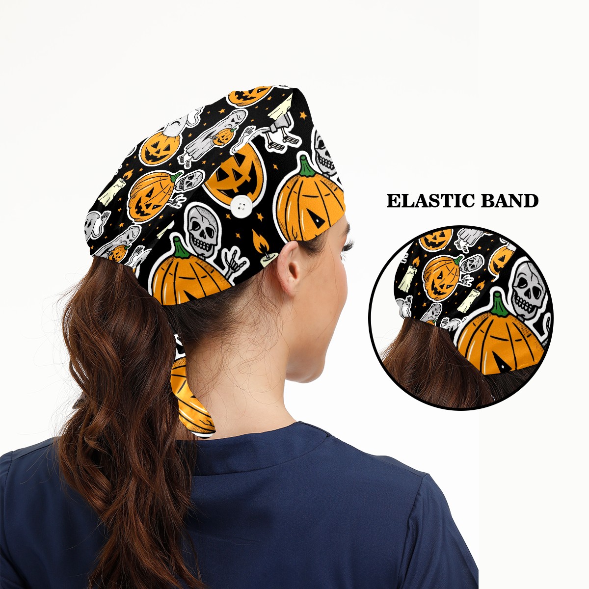 Working Caps with Button & Sweatband Satin Lined Cotton Adjustable Nurse Hats Elastic Band Scrub Cap Surgeon Hat Halloween Skeleton Ghost Pumpkin Candle