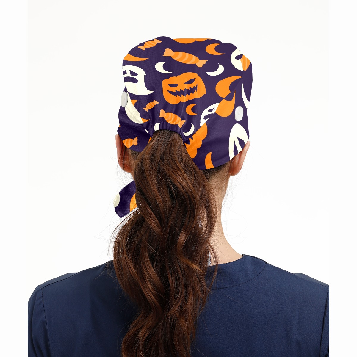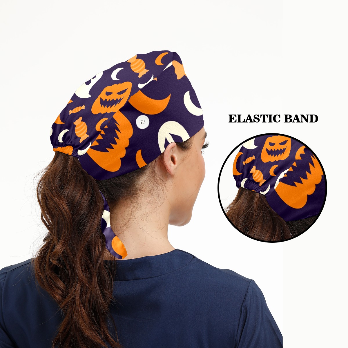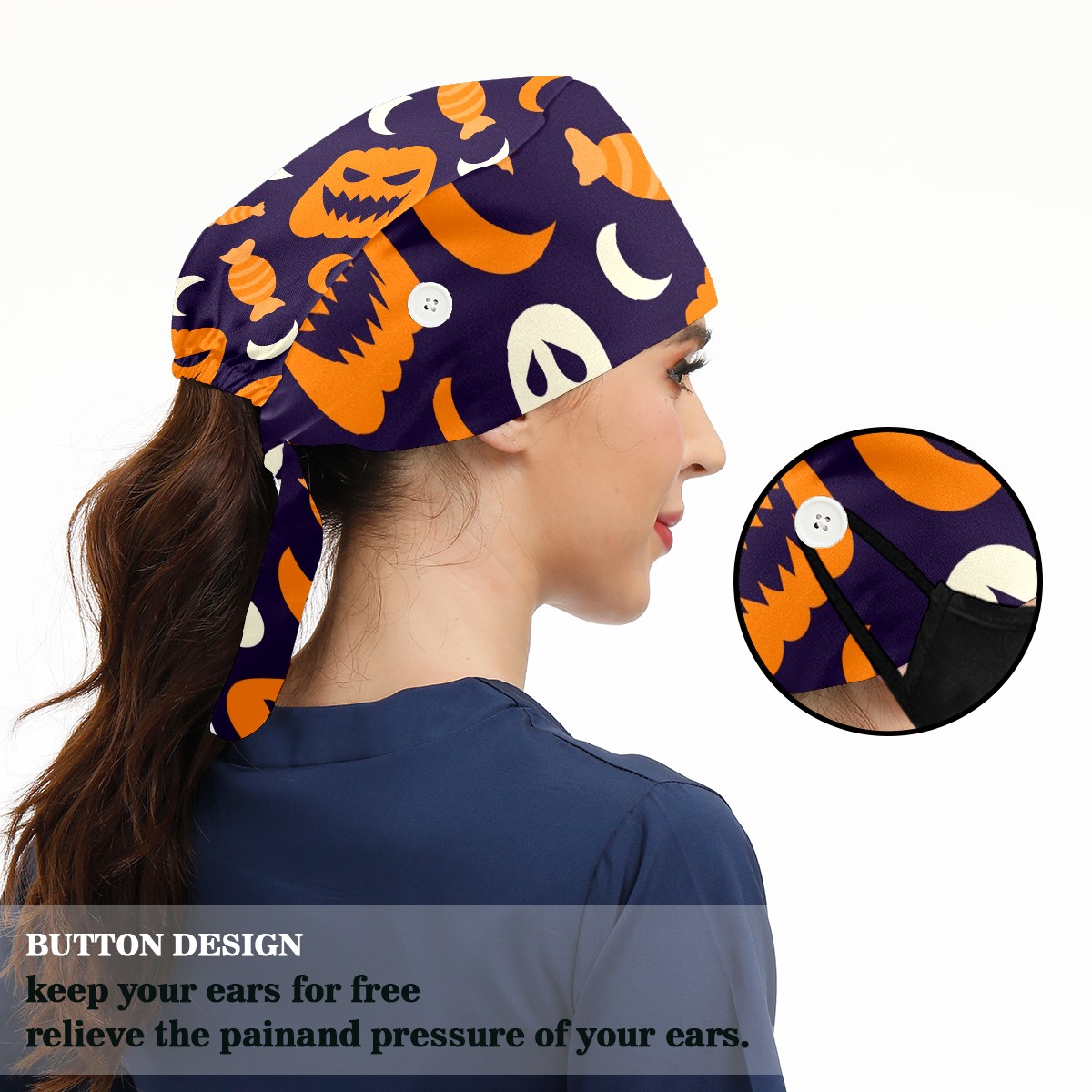 Working Caps with Button & Sweatband Satin Lined Cotton Adjustable Nurse Hats Elastic Band Scrub Cap Surgeon Hat Halloween Pumpkin Ghost Candy Moon