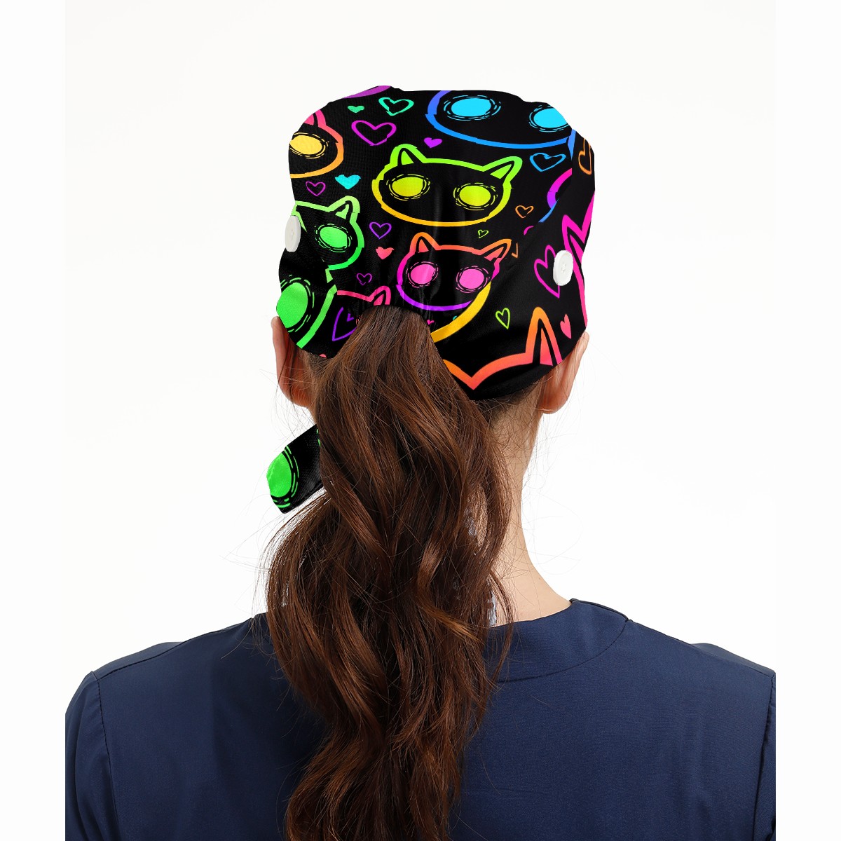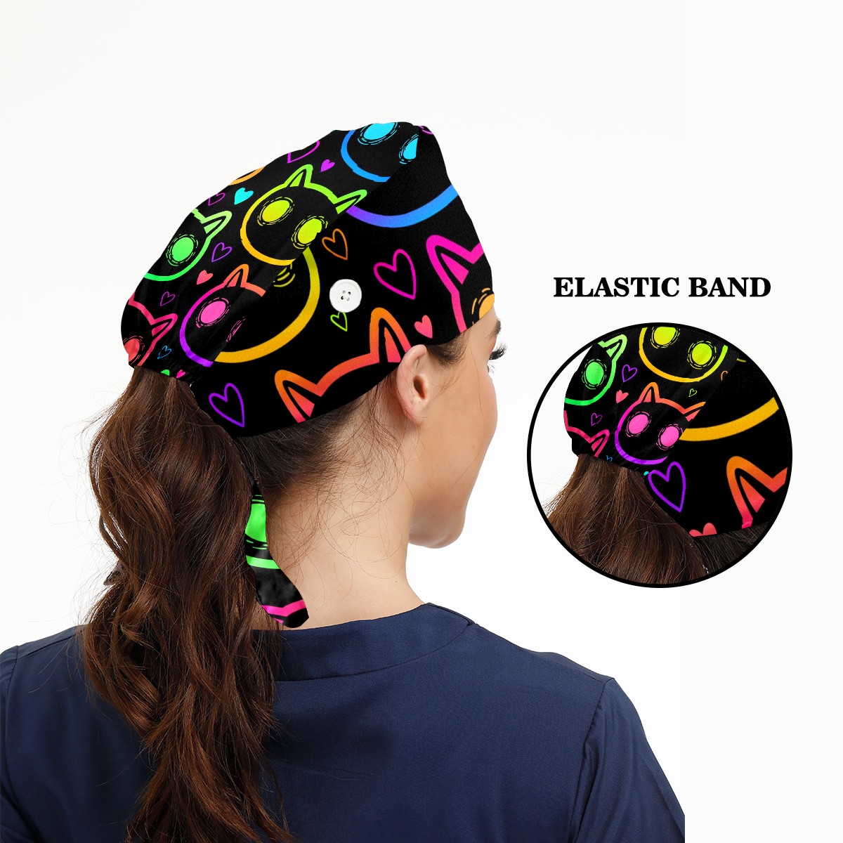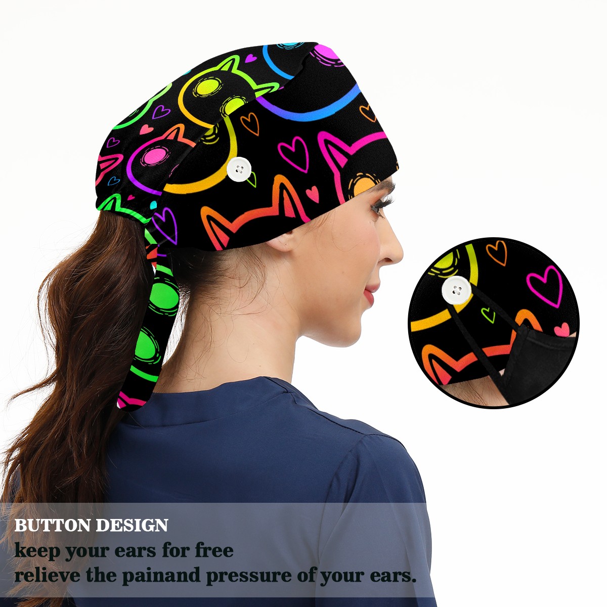 Working Caps with Button & Sweatband Satin Lined Cotton Adjustable Nurse Hats Elastic Band Scrub Cap Surgeon Hat Halloween Cute Witchcraft Cat