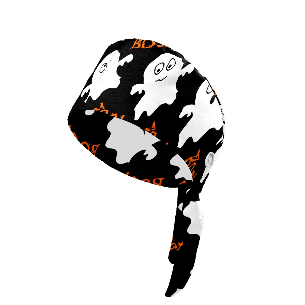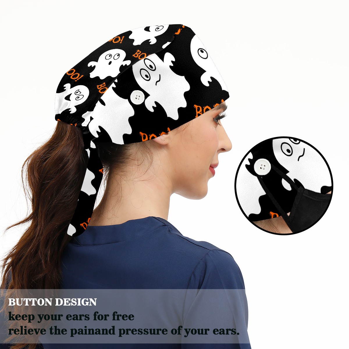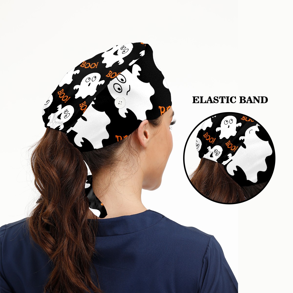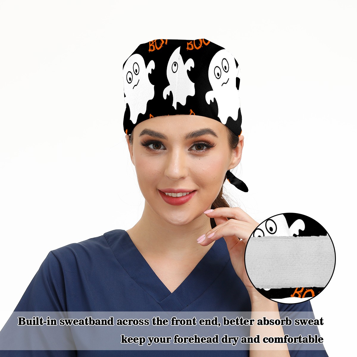 Working Caps with Button & Sweatband Satin Lined Cotton Adjustable Nurse Hats Elastic Band Scrub Cap Surgeon Hat Halloween Cute Ghosts
