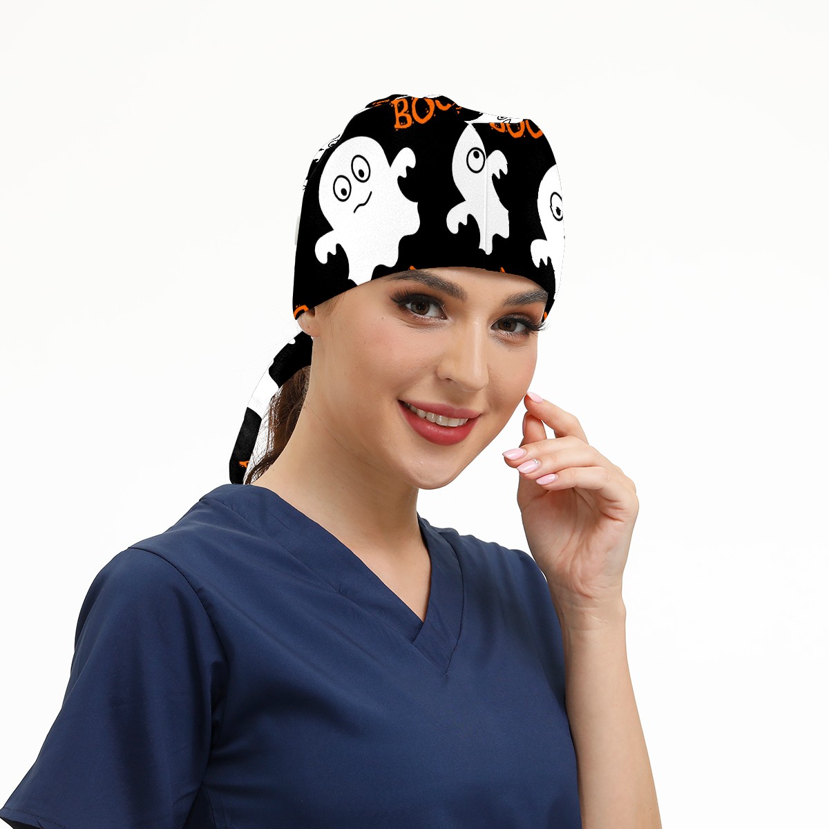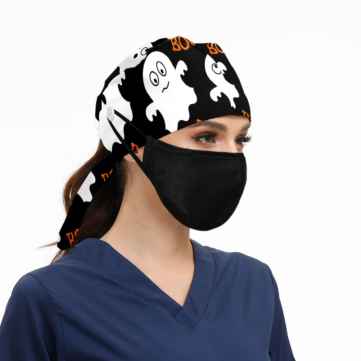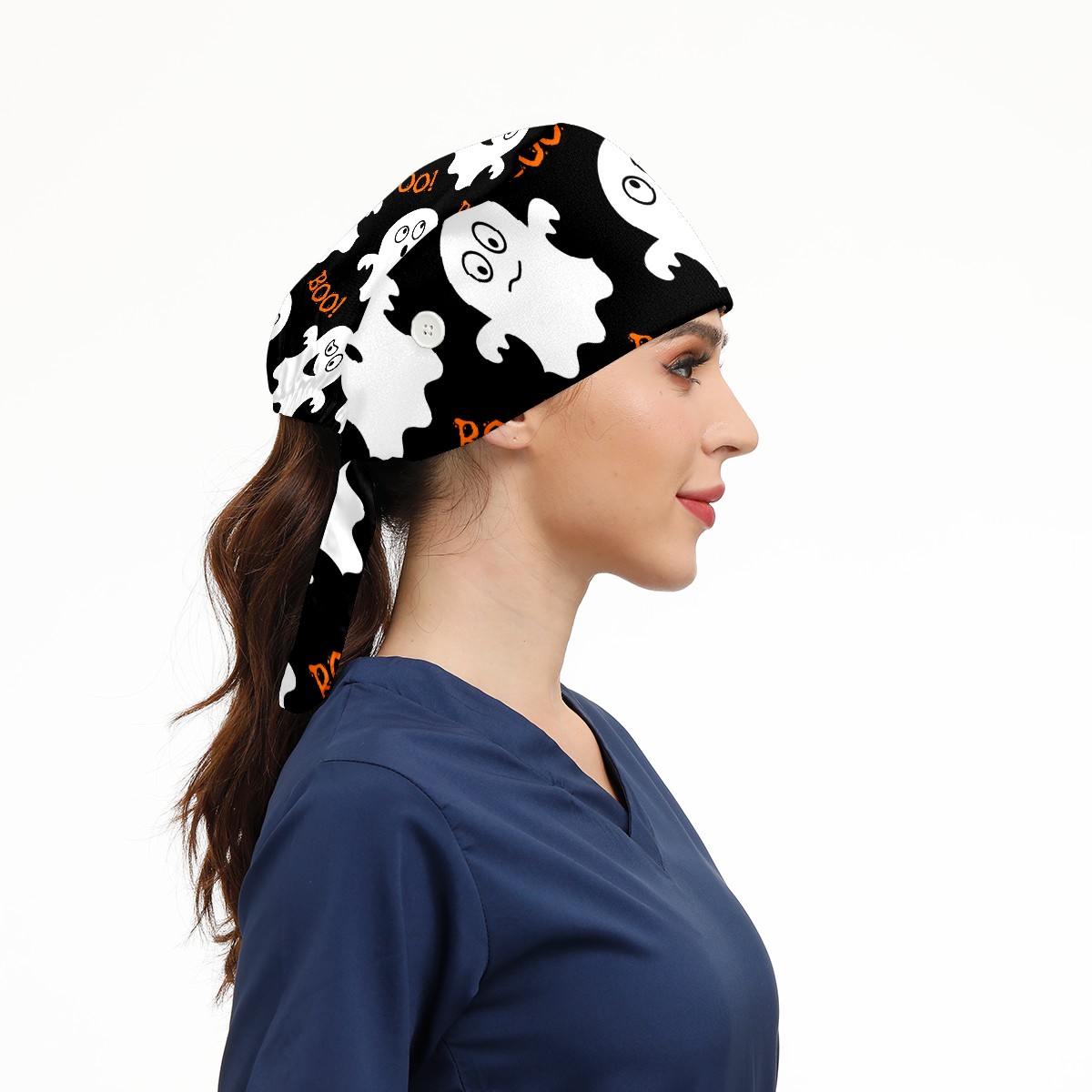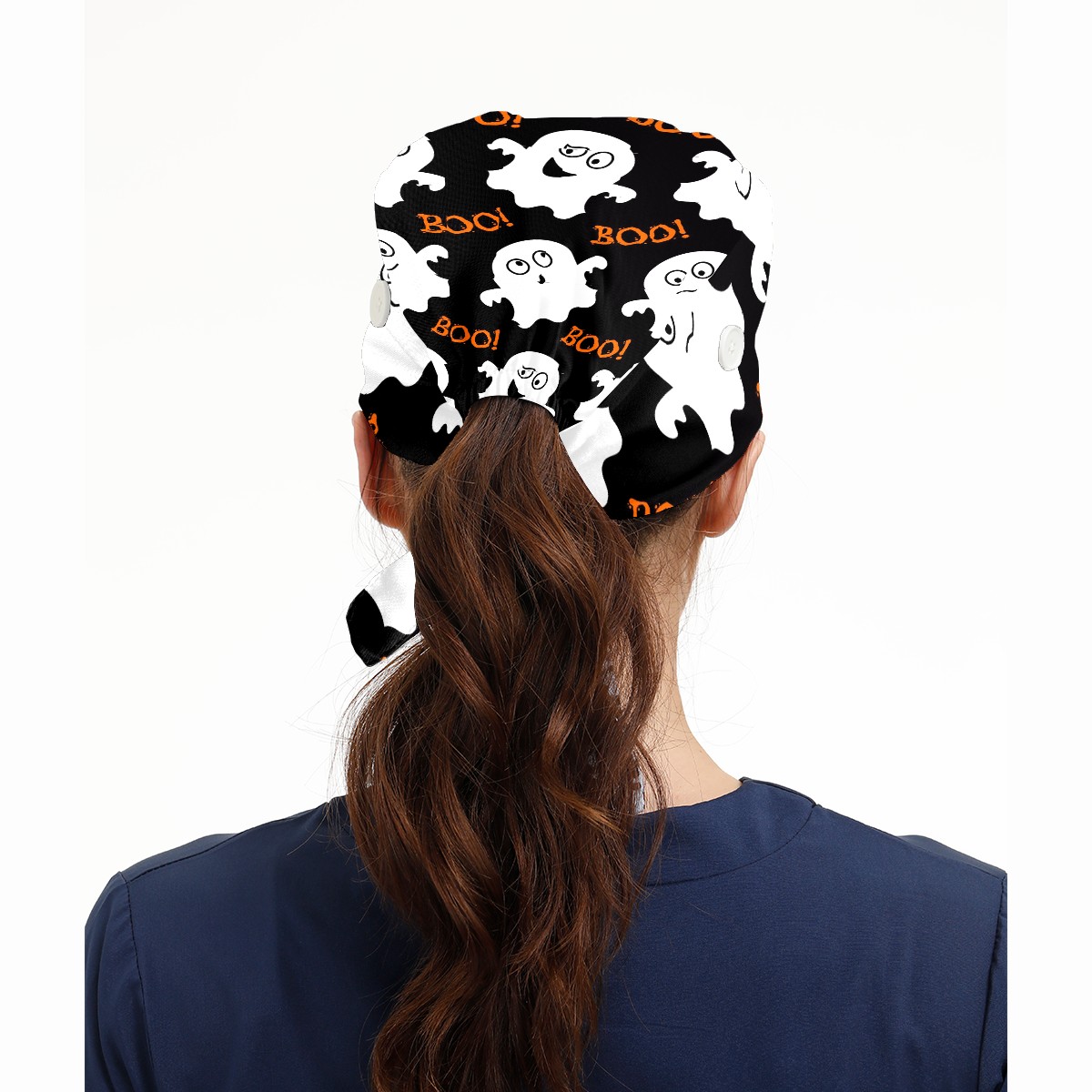 Working Caps with Button & Sweatband Satin Lined Cotton Adjustable Nurse Hats Elastic Band Scrub Cap Surgeon Hat Halloween Cute Ghosts