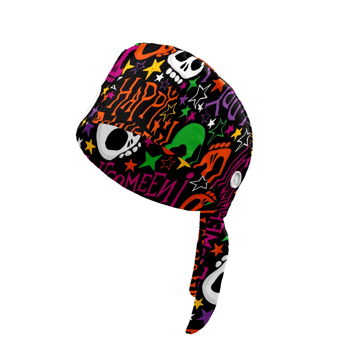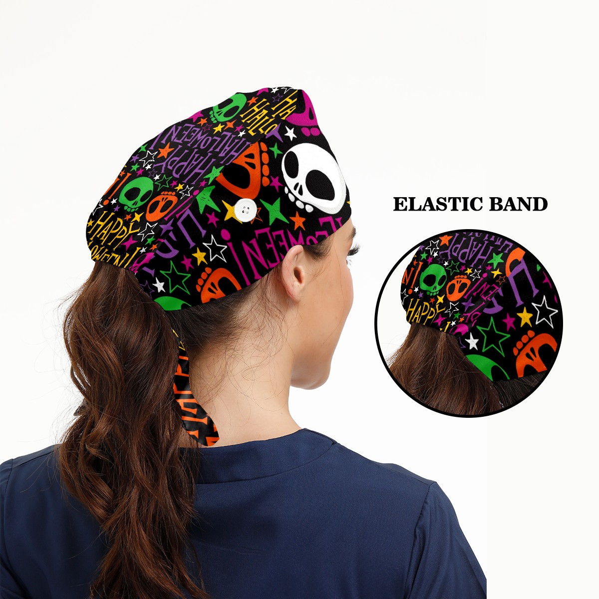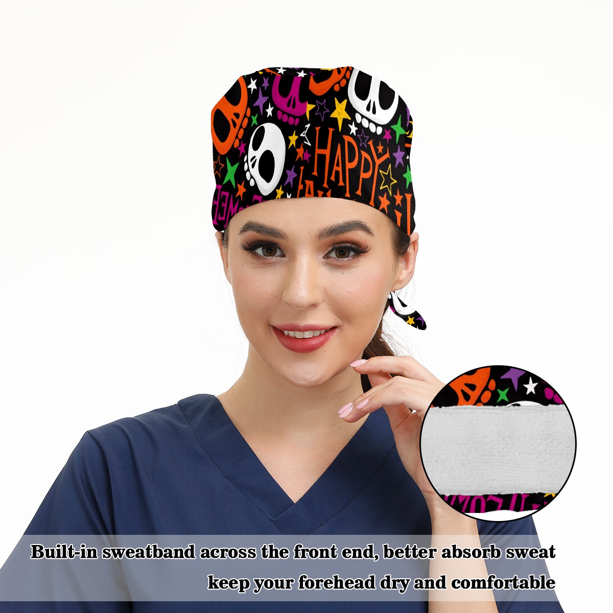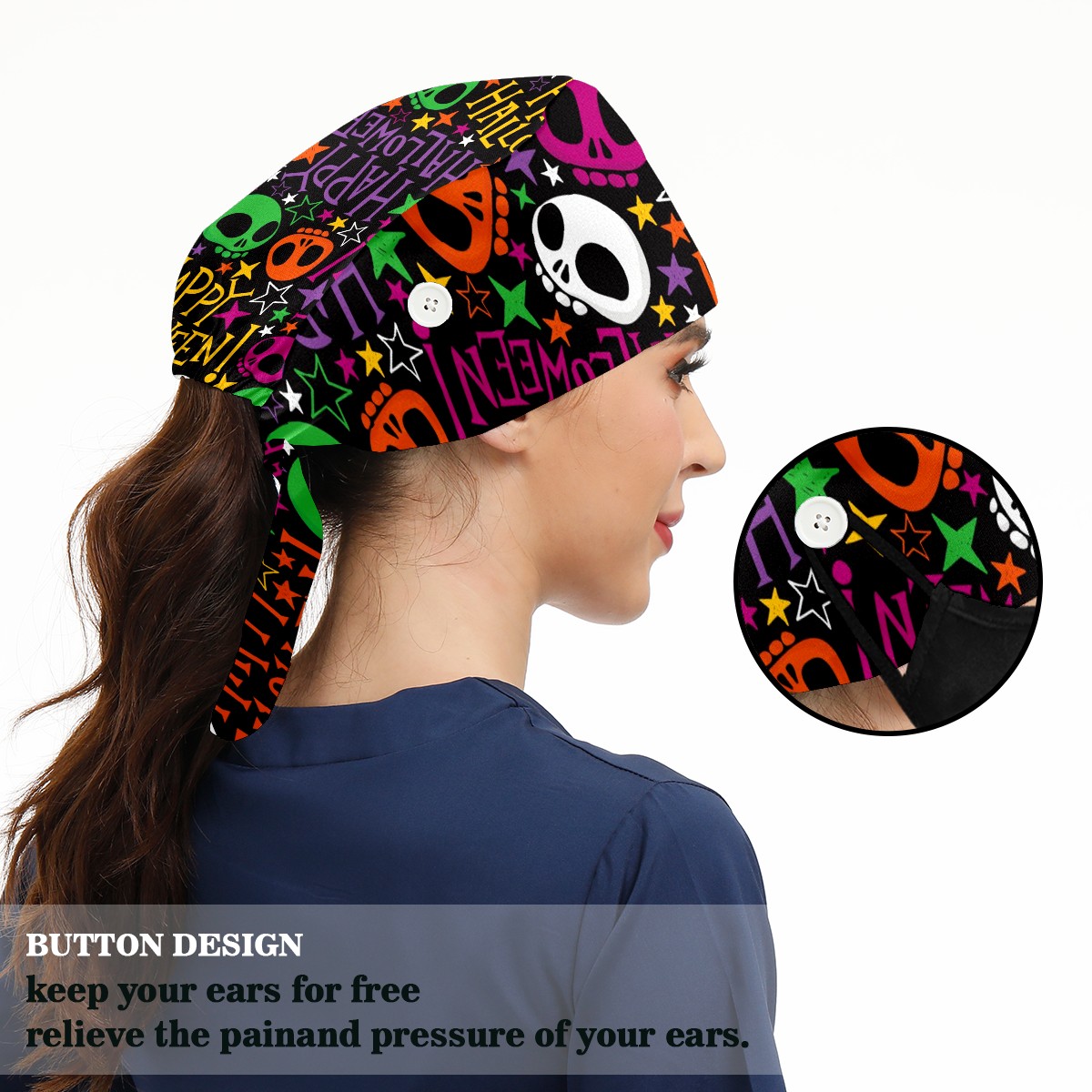 Working Caps with Button & Sweatband Satin Lined Cotton Adjustable Nurse Hats Elastic Band Scrub Cap Surgeon Hat Halloween Colorful Skull Doodle