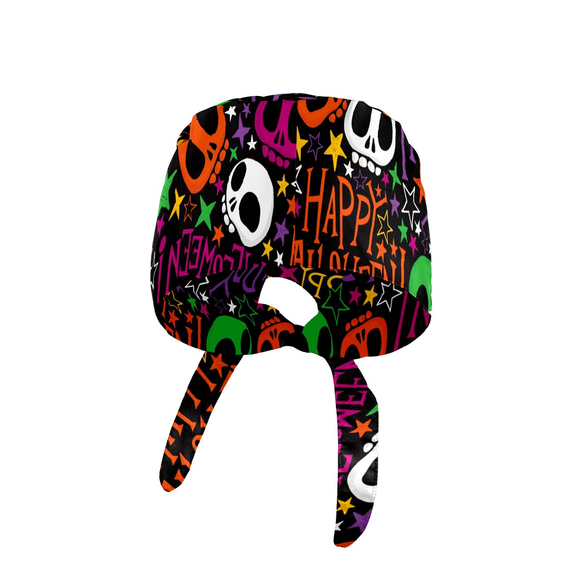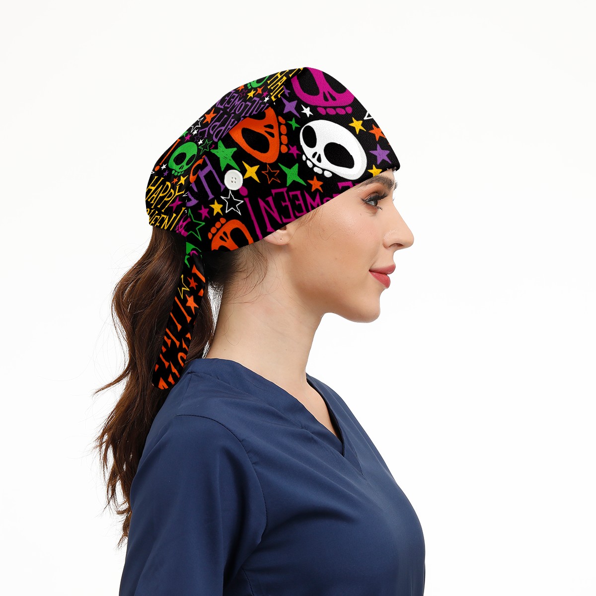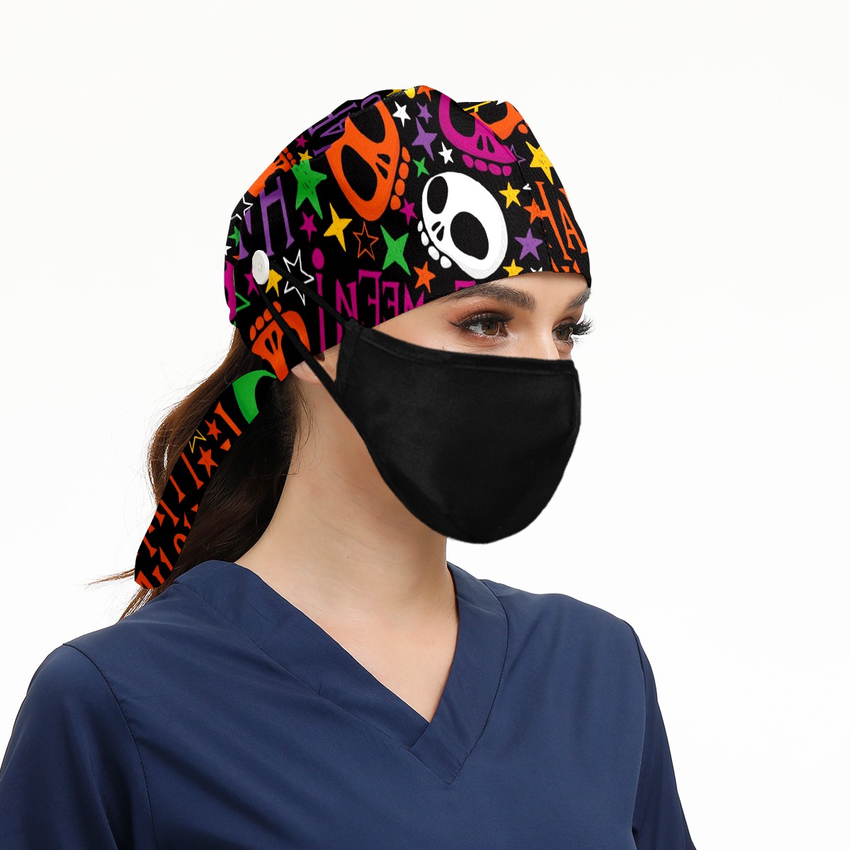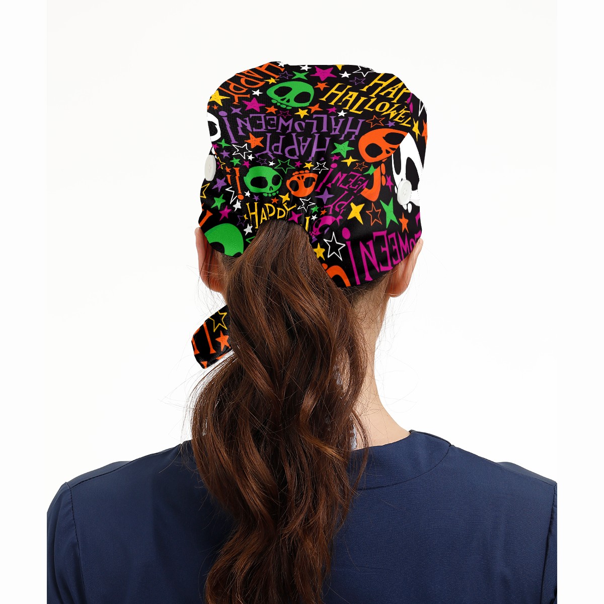 Working Caps with Button & Sweatband Satin Lined Cotton Adjustable Nurse Hats Elastic Band Scrub Cap Surgeon Hat Halloween Colorful Skull Doodle