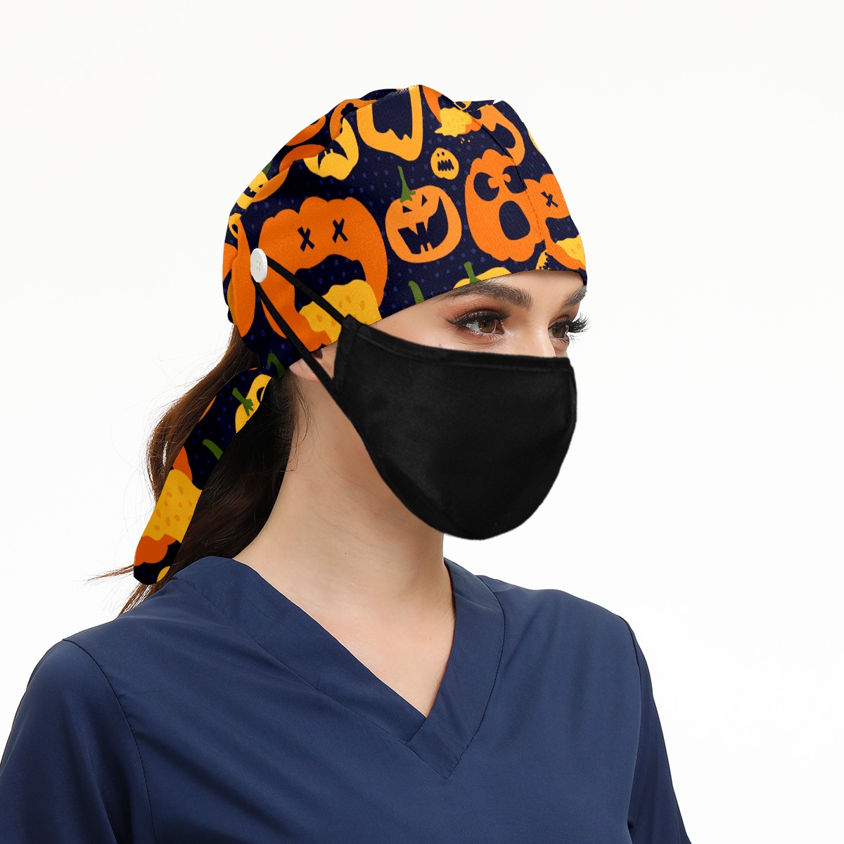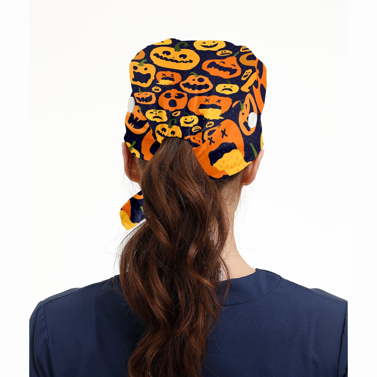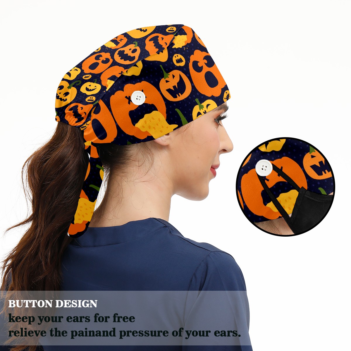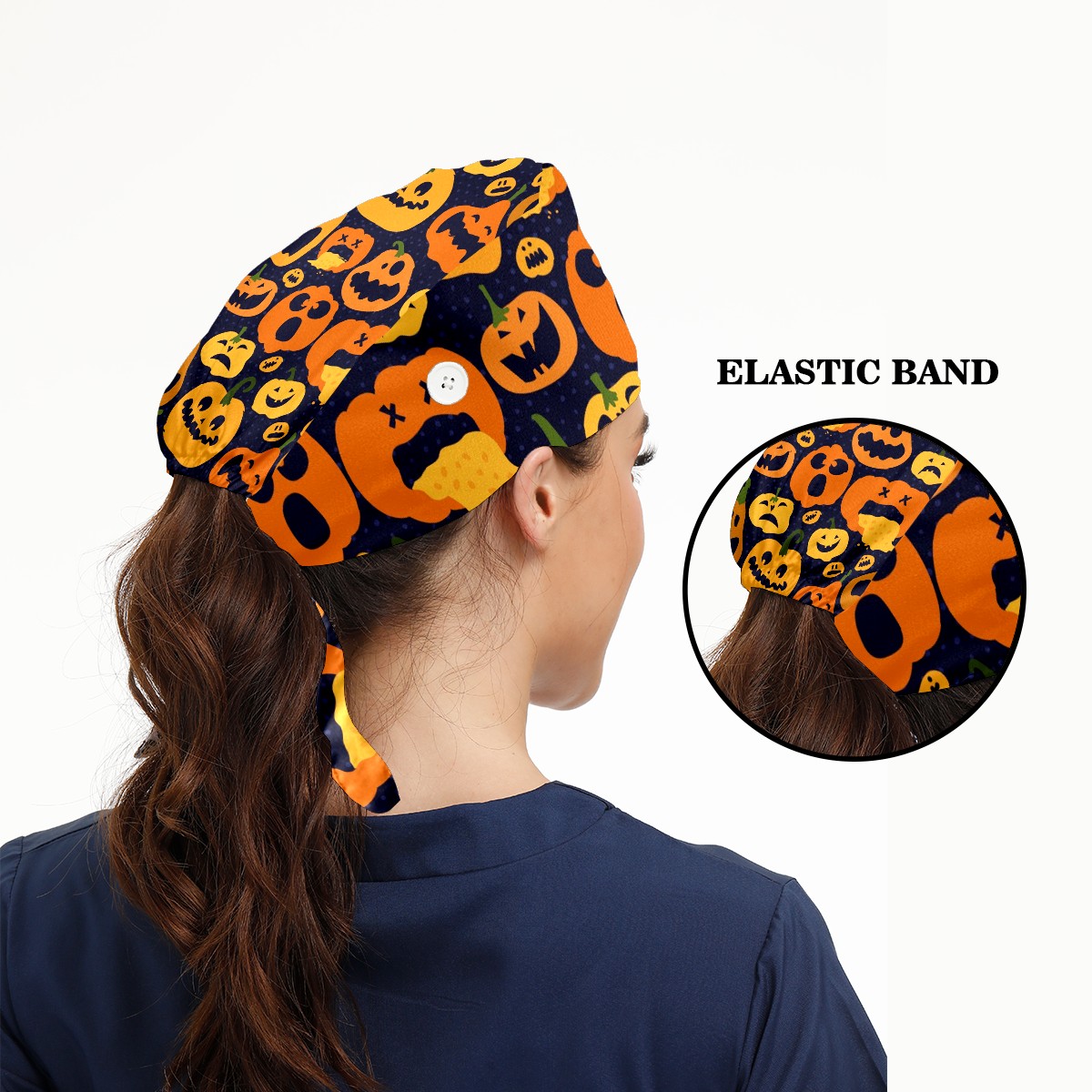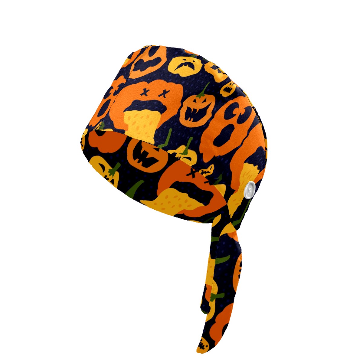 Working Caps with Button & Sweatband Satin Lined Cotton Adjustable Nurse Hats Elastic Band Scrub Cap Surgeon Hat Halloween Bright Pumpkin