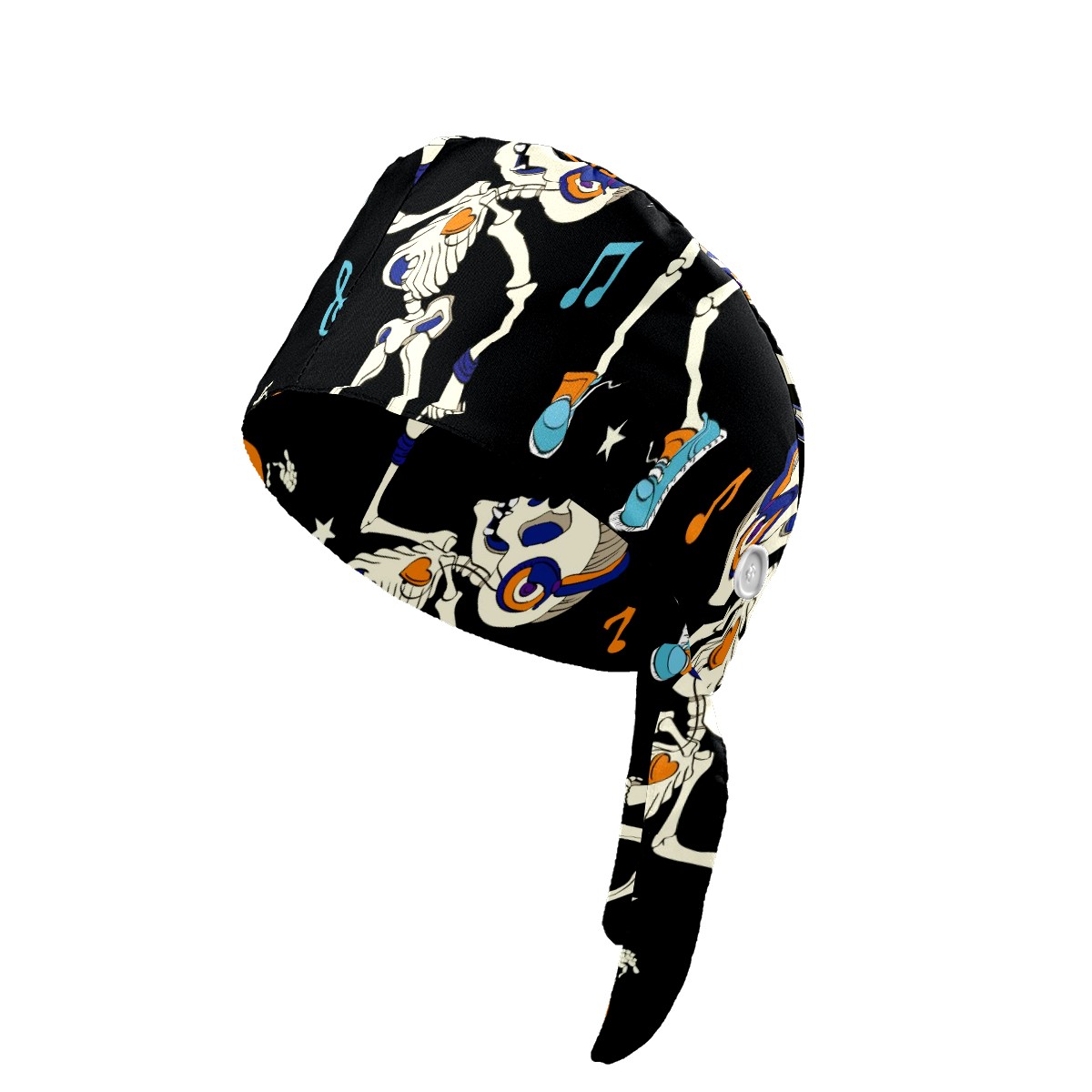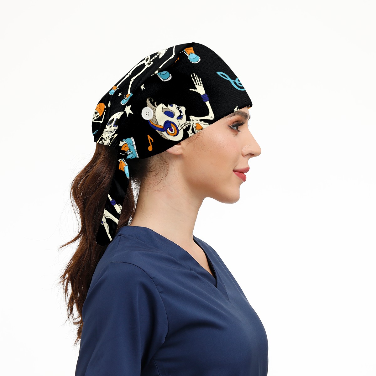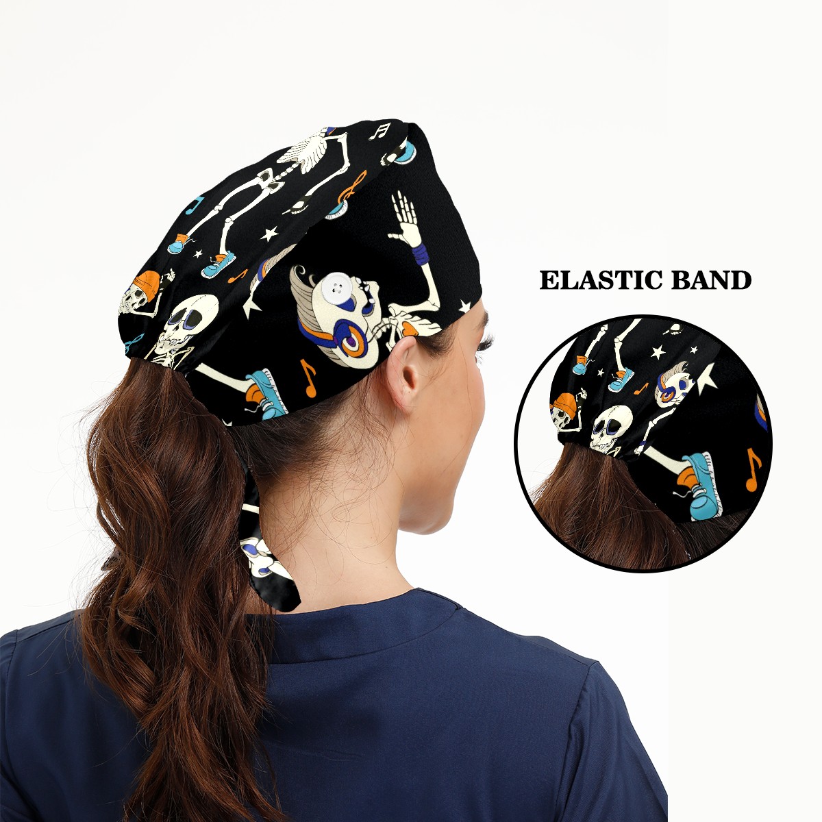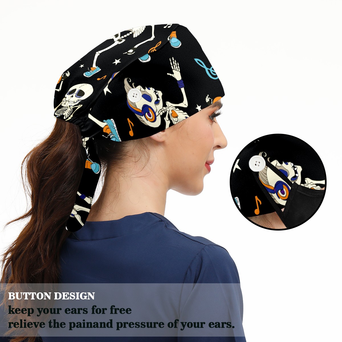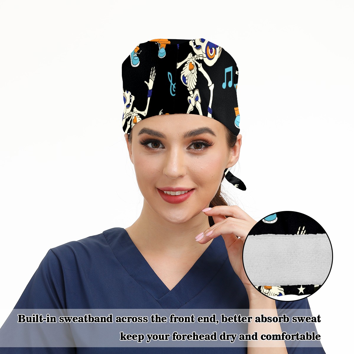Working Caps with Button & Sweatband Satin Lined Cotton Adjustable Nurse Hats Elastic Band Scrub Cap Surgeon Hat Dancing Skeleton Halloween