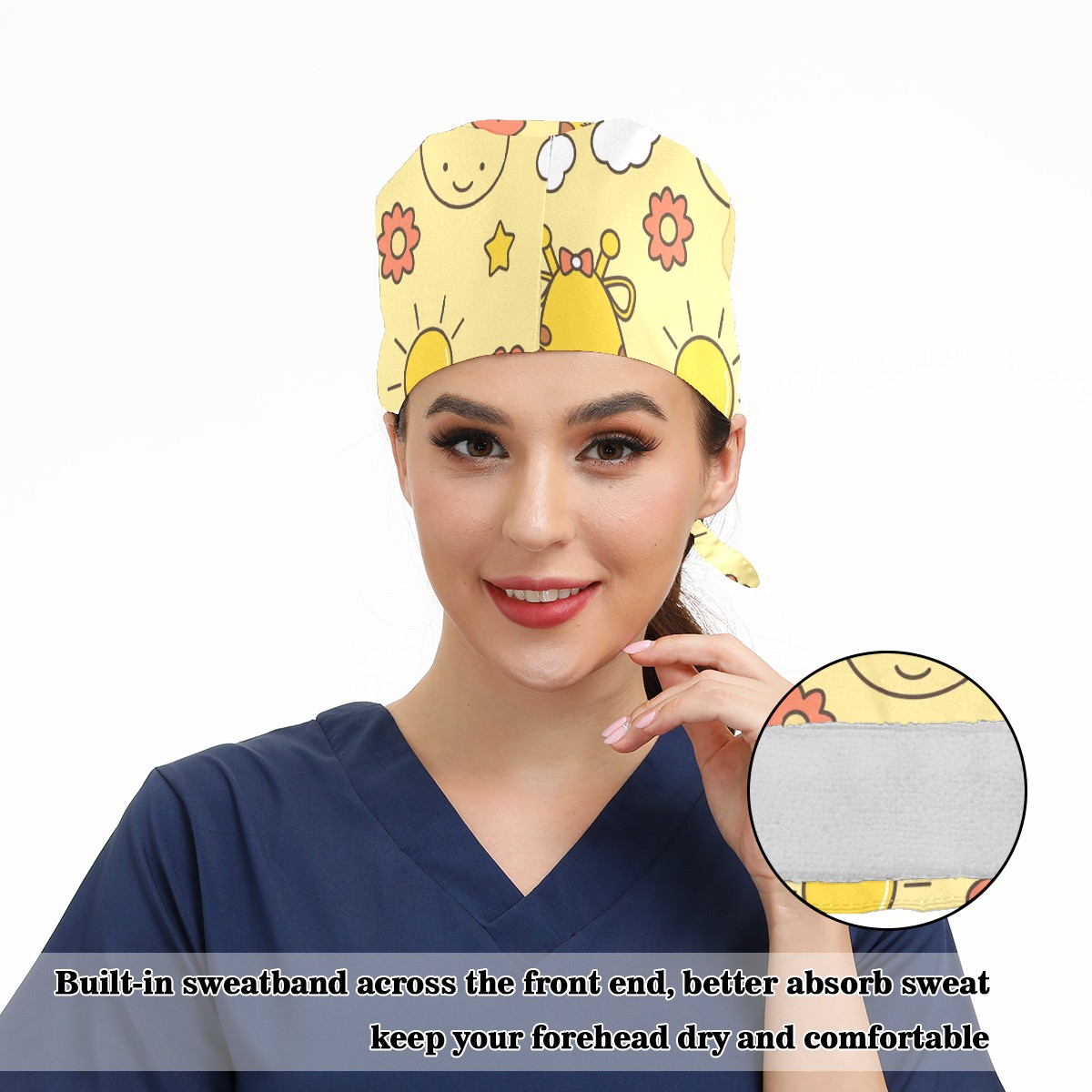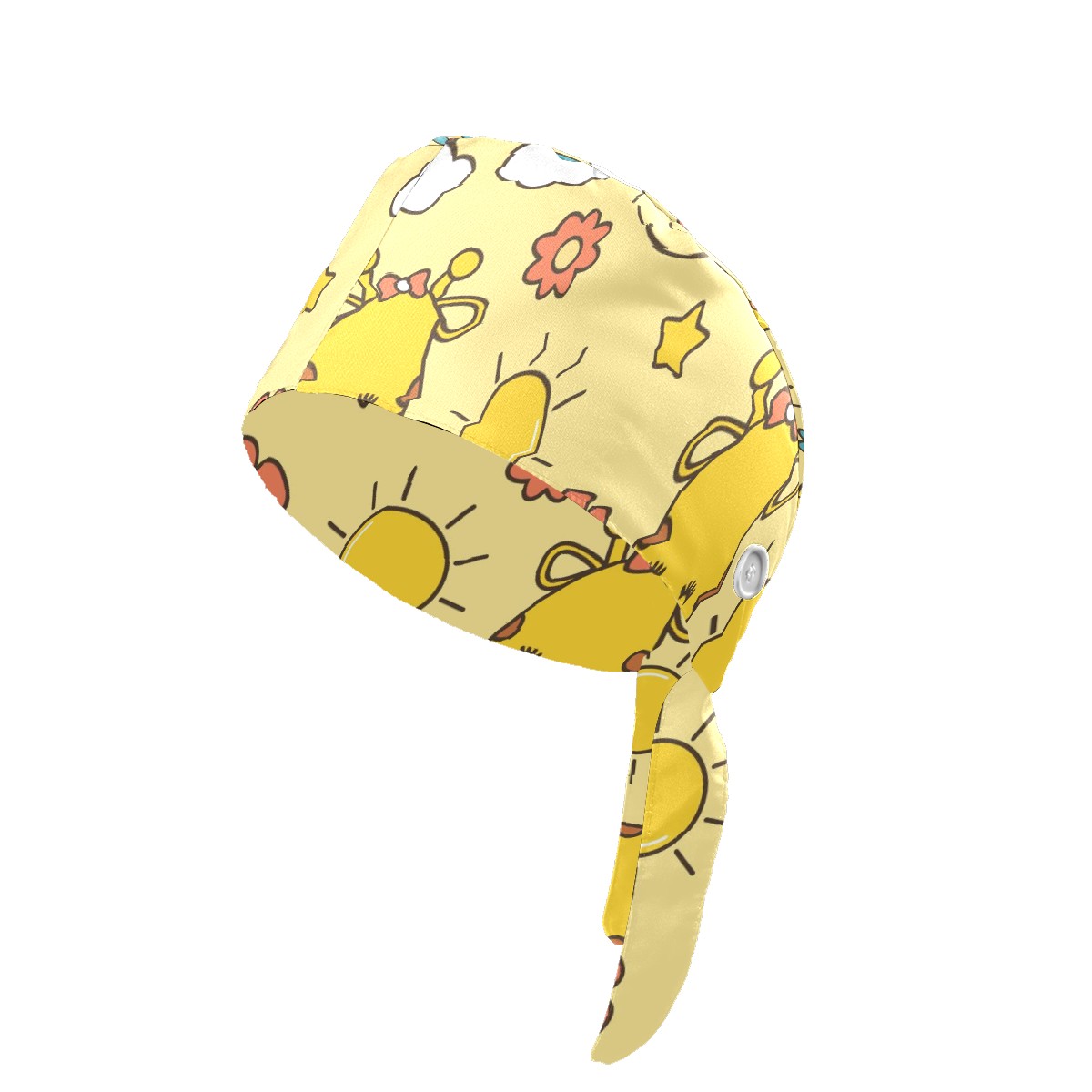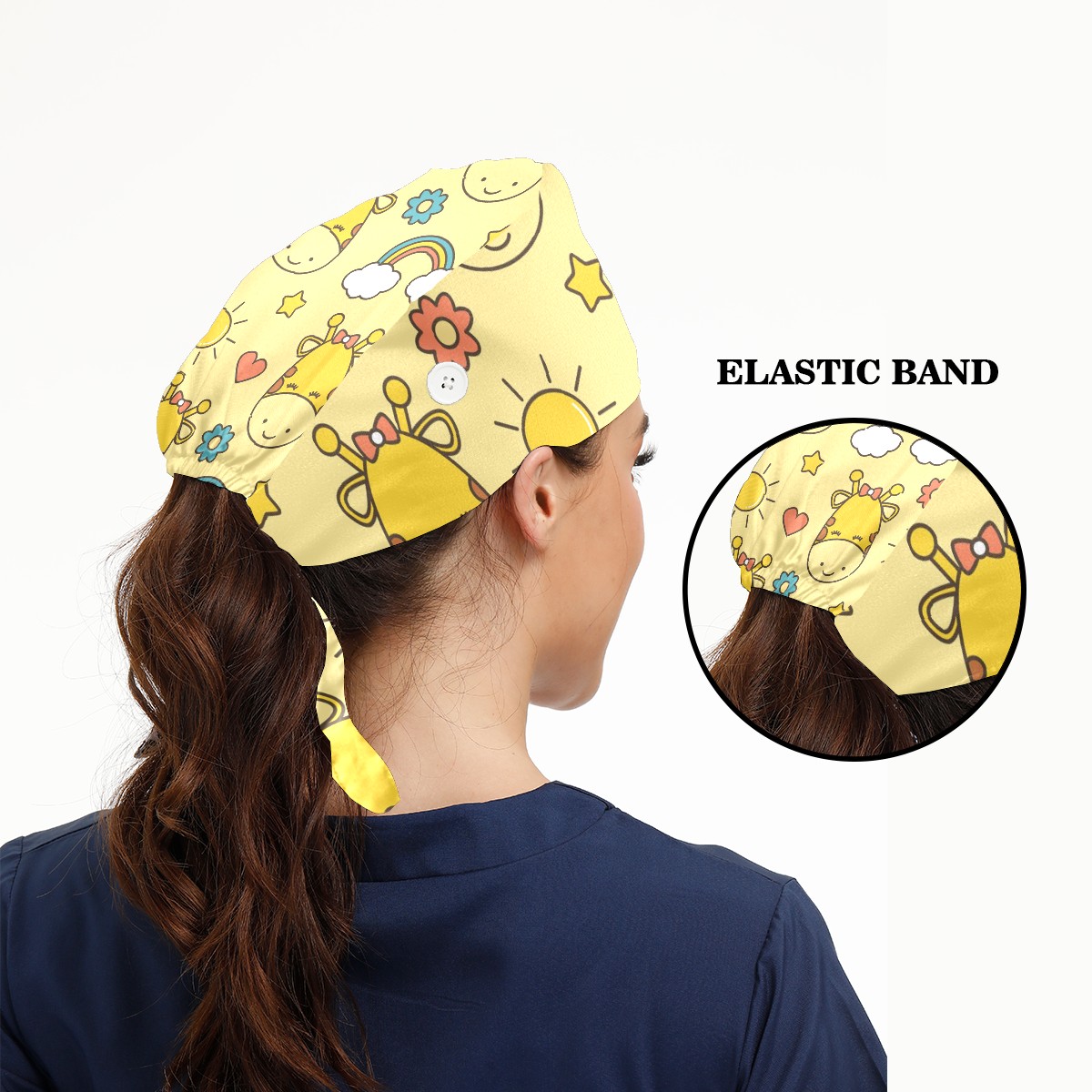 Working Caps with Button & Sweatband Satin Lined Cotton Adjustable Nurse Hats Elastic Band Scrub Cap Surgeon Hat Cute Lovely Giraffe Rainbow Star Flower