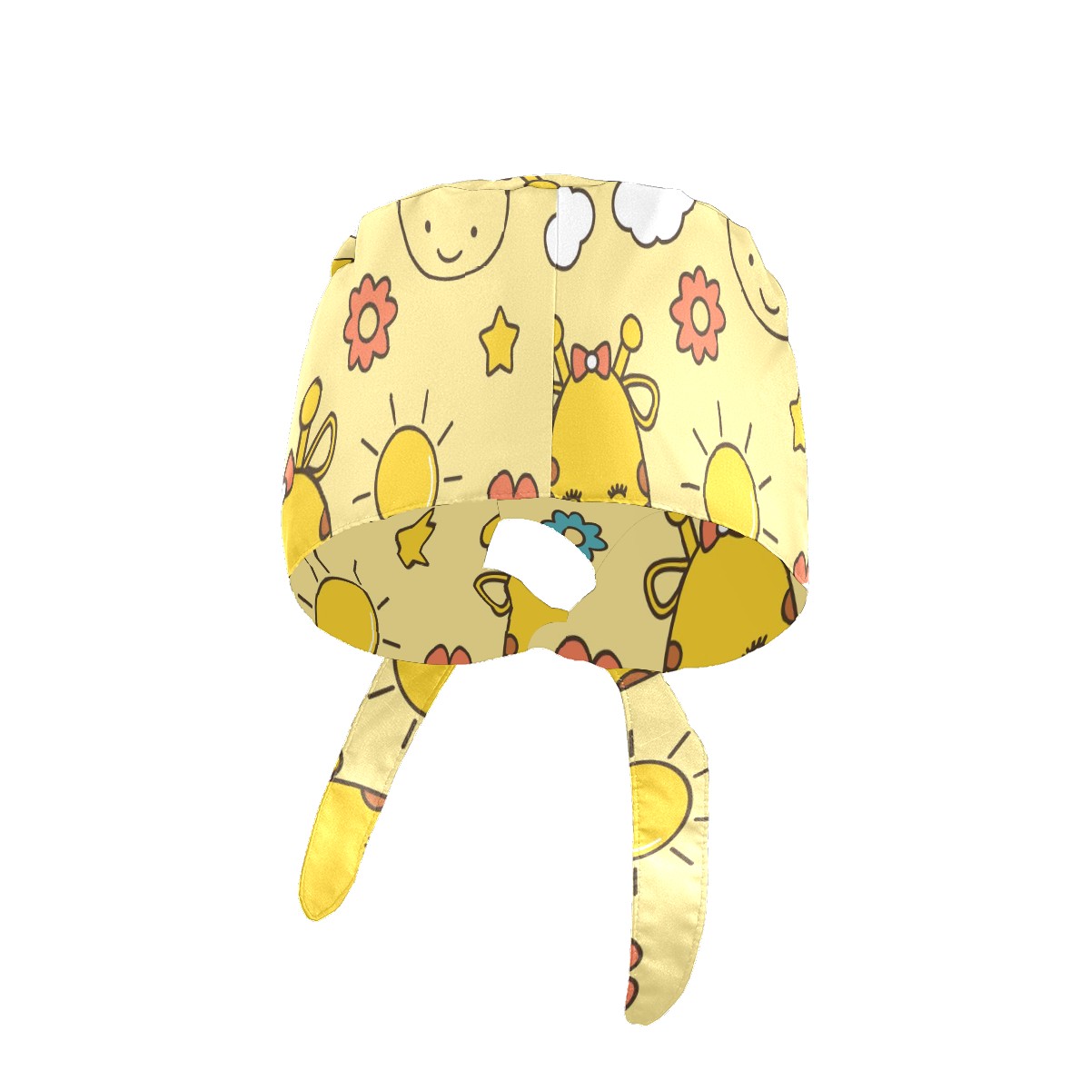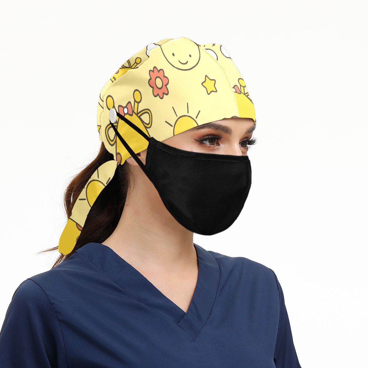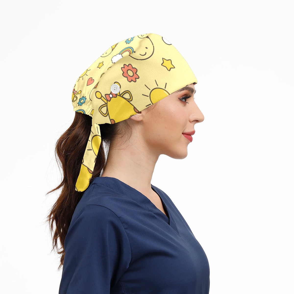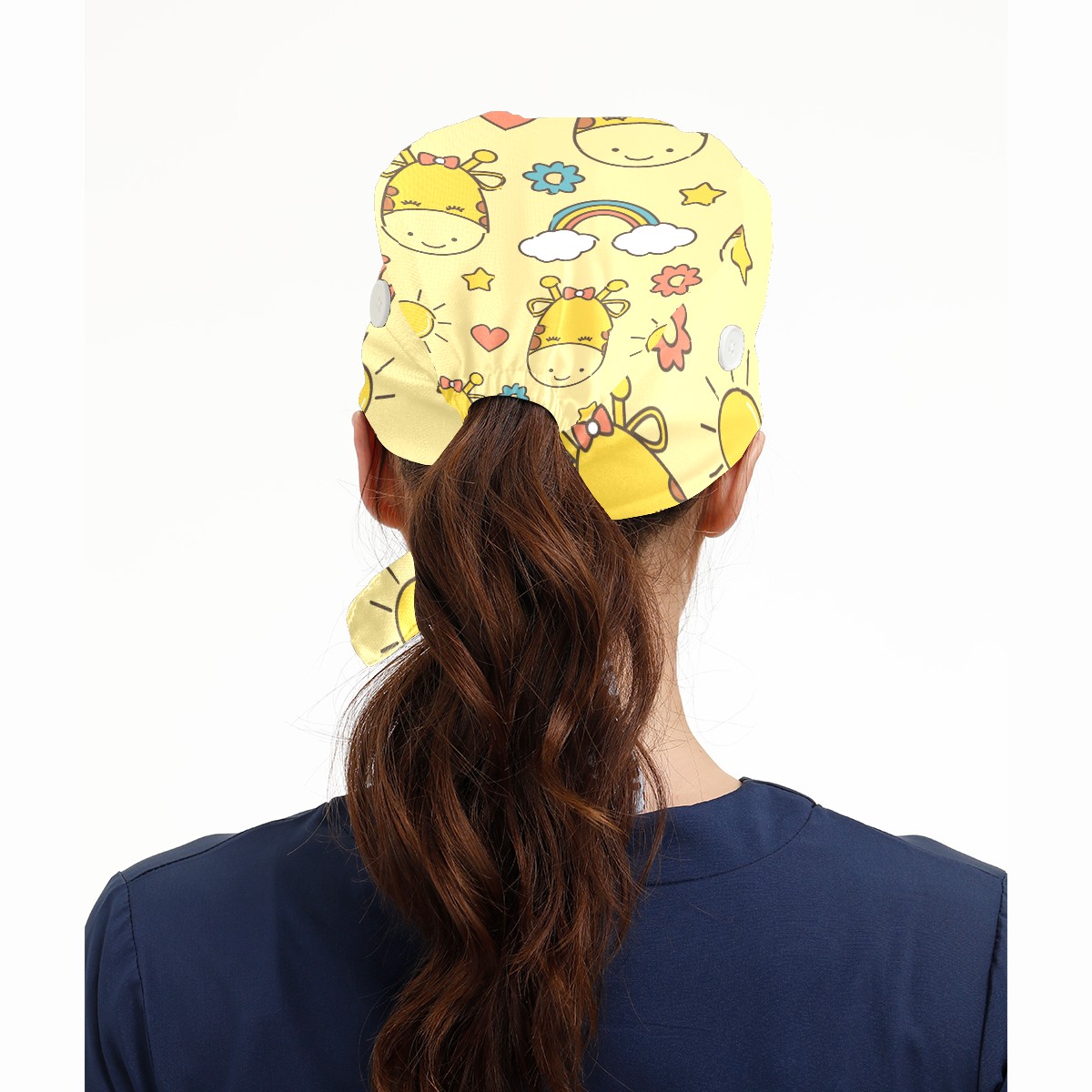 Working Caps with Button & Sweatband Satin Lined Cotton Adjustable Nurse Hats Elastic Band Scrub Cap Surgeon Hat Cute Lovely Giraffe Rainbow Star Flower