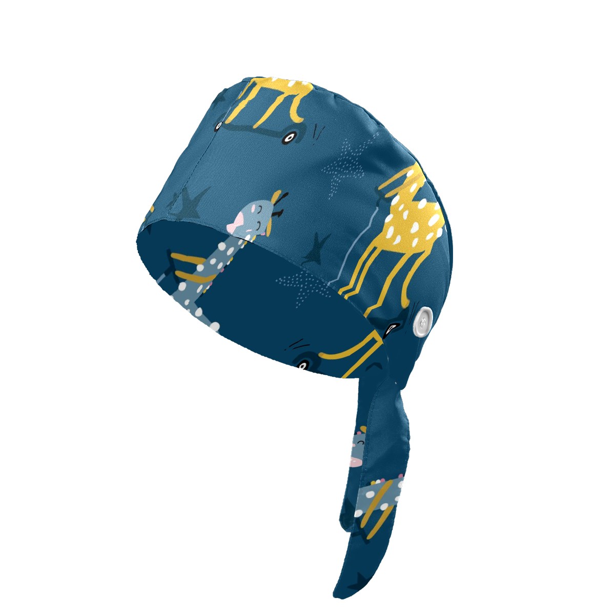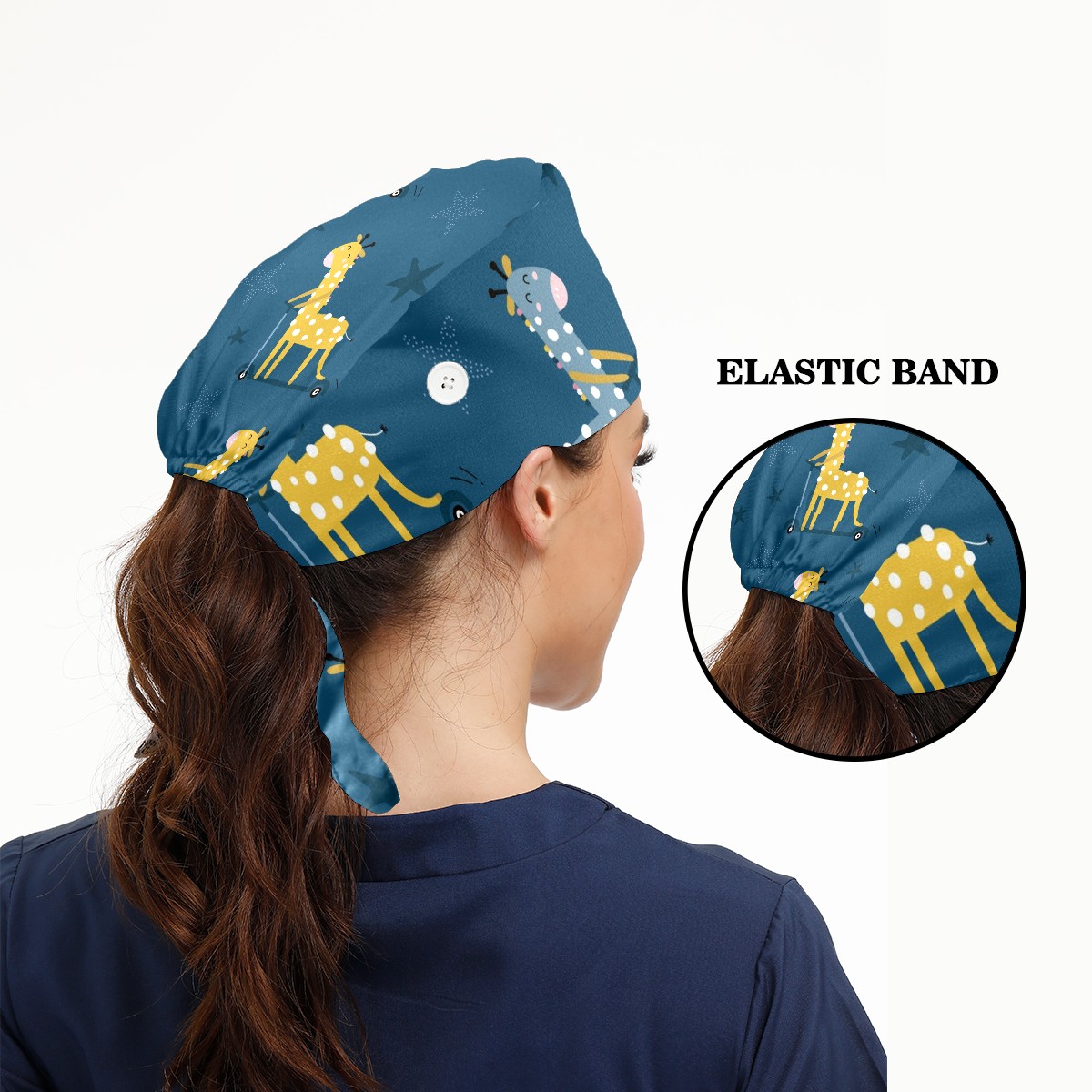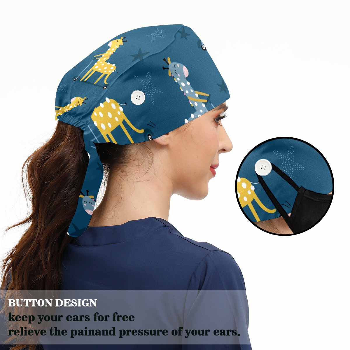 Working Caps with Button & Sweatband Satin Lined Cotton Adjustable Nurse Hats Elastic Band Scrub Cap Surgeon Hat Cute Giraffe On Scooter