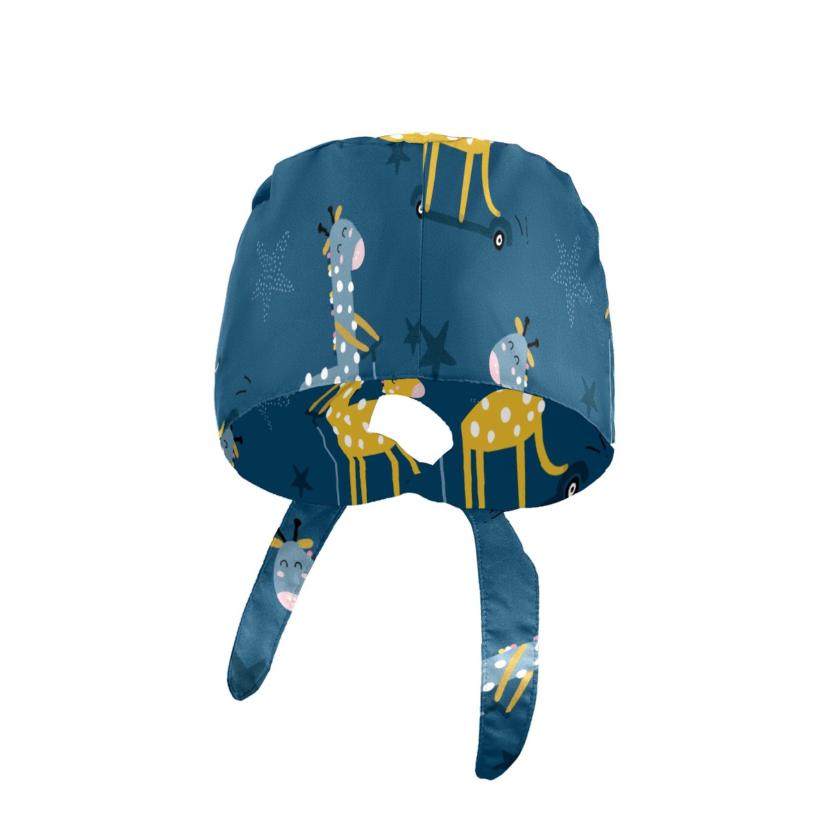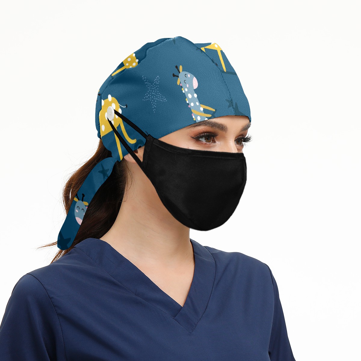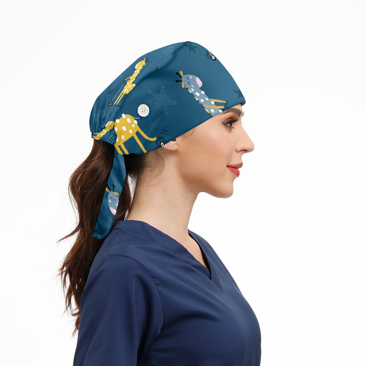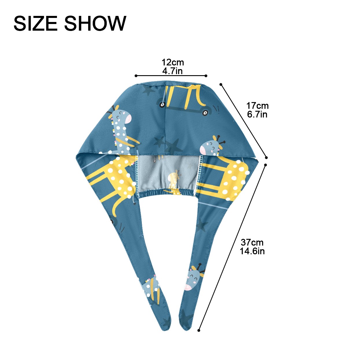 Working Caps with Button & Sweatband Satin Lined Cotton Adjustable Nurse Hats Elastic Band Scrub Cap Surgeon Hat Cute Giraffe On Scooter