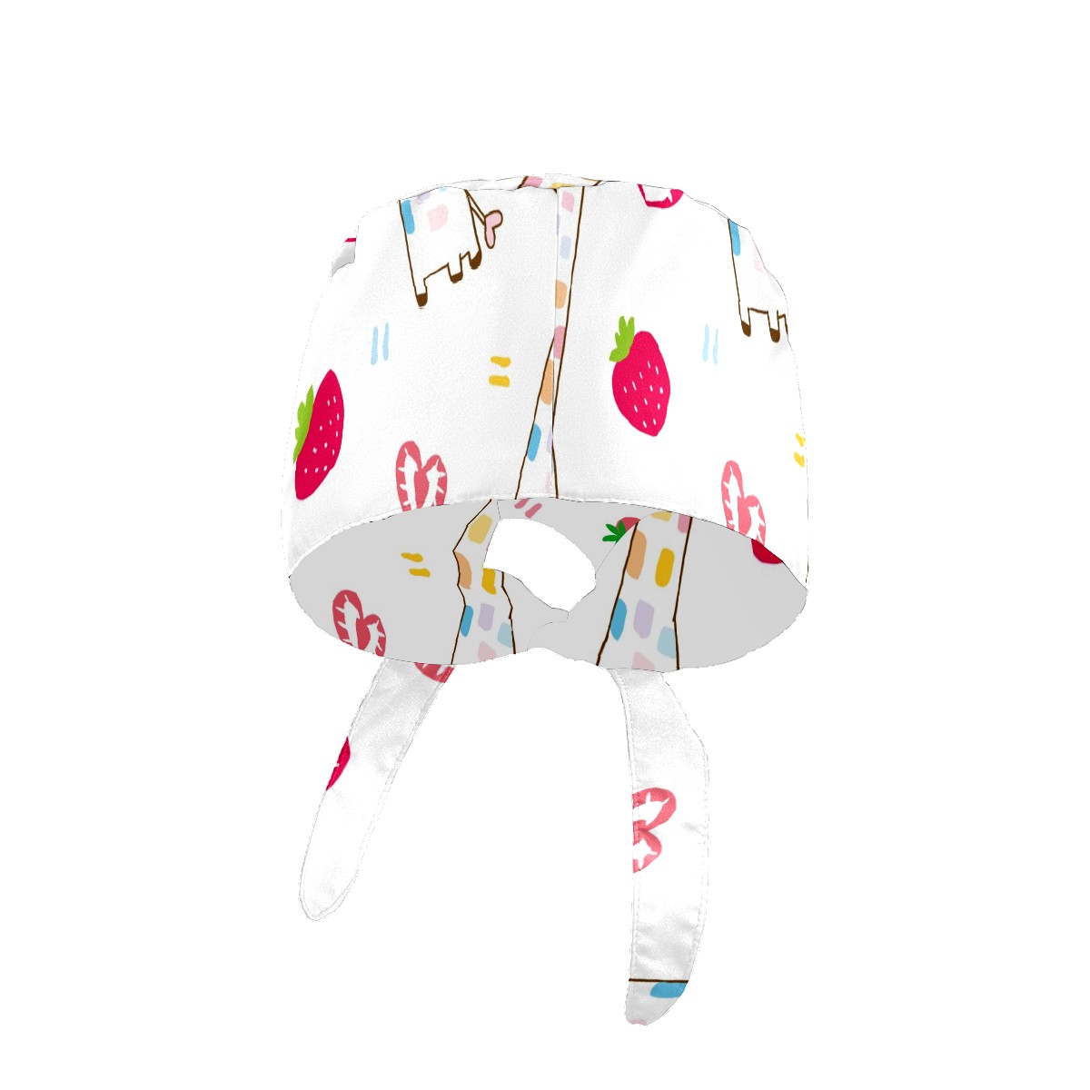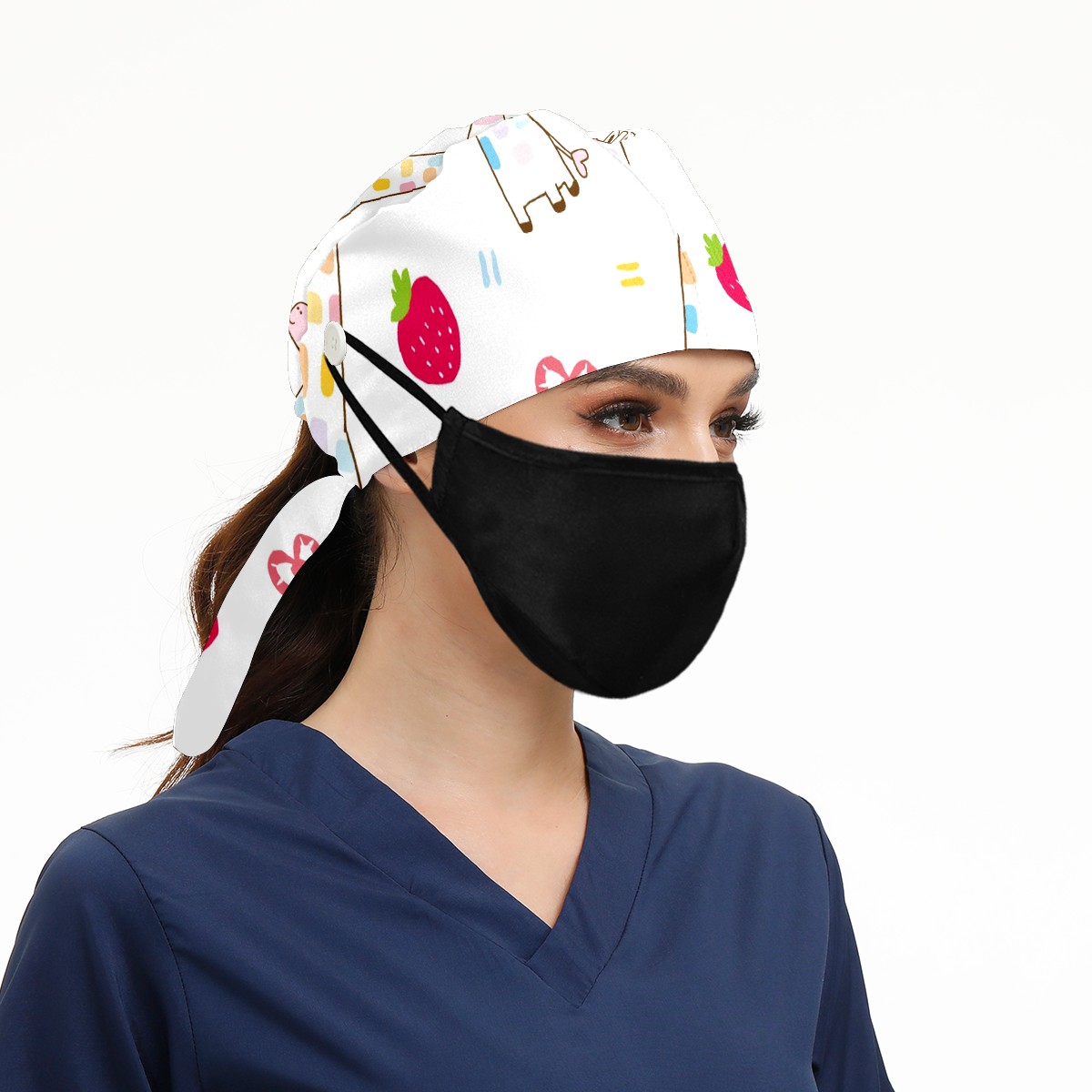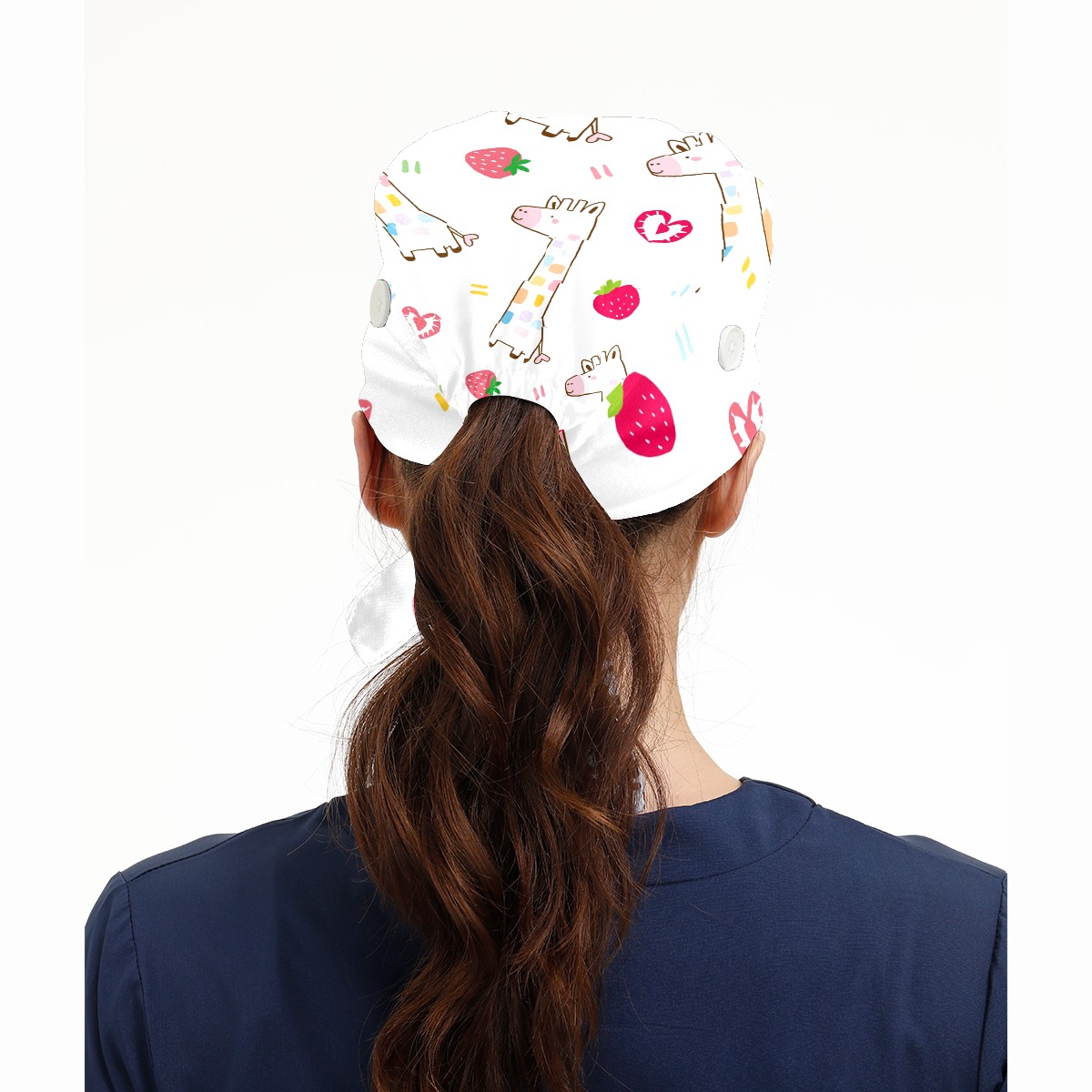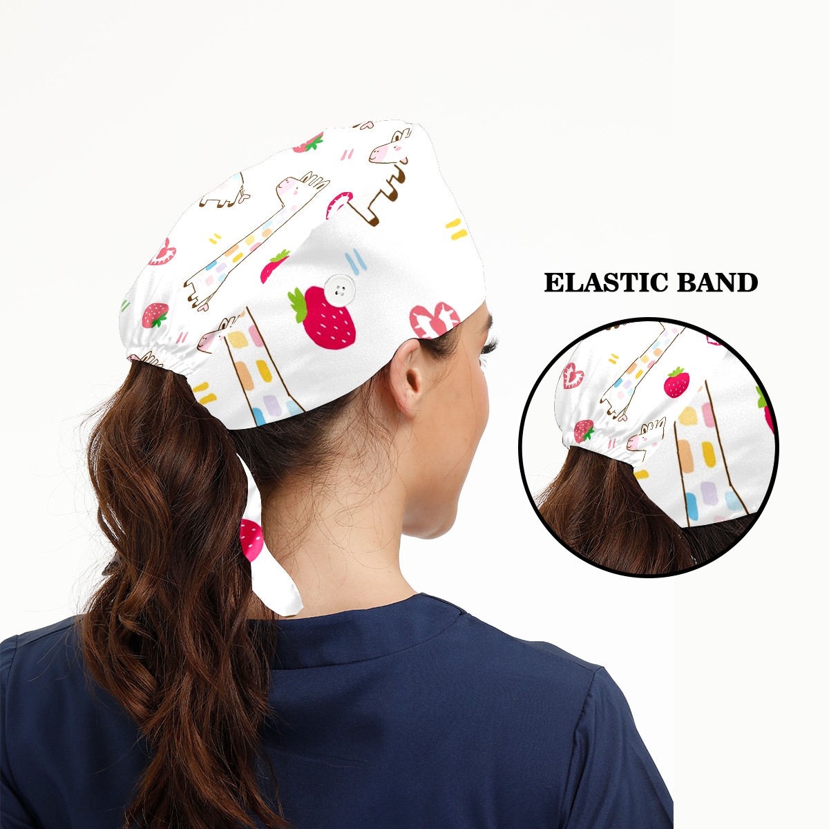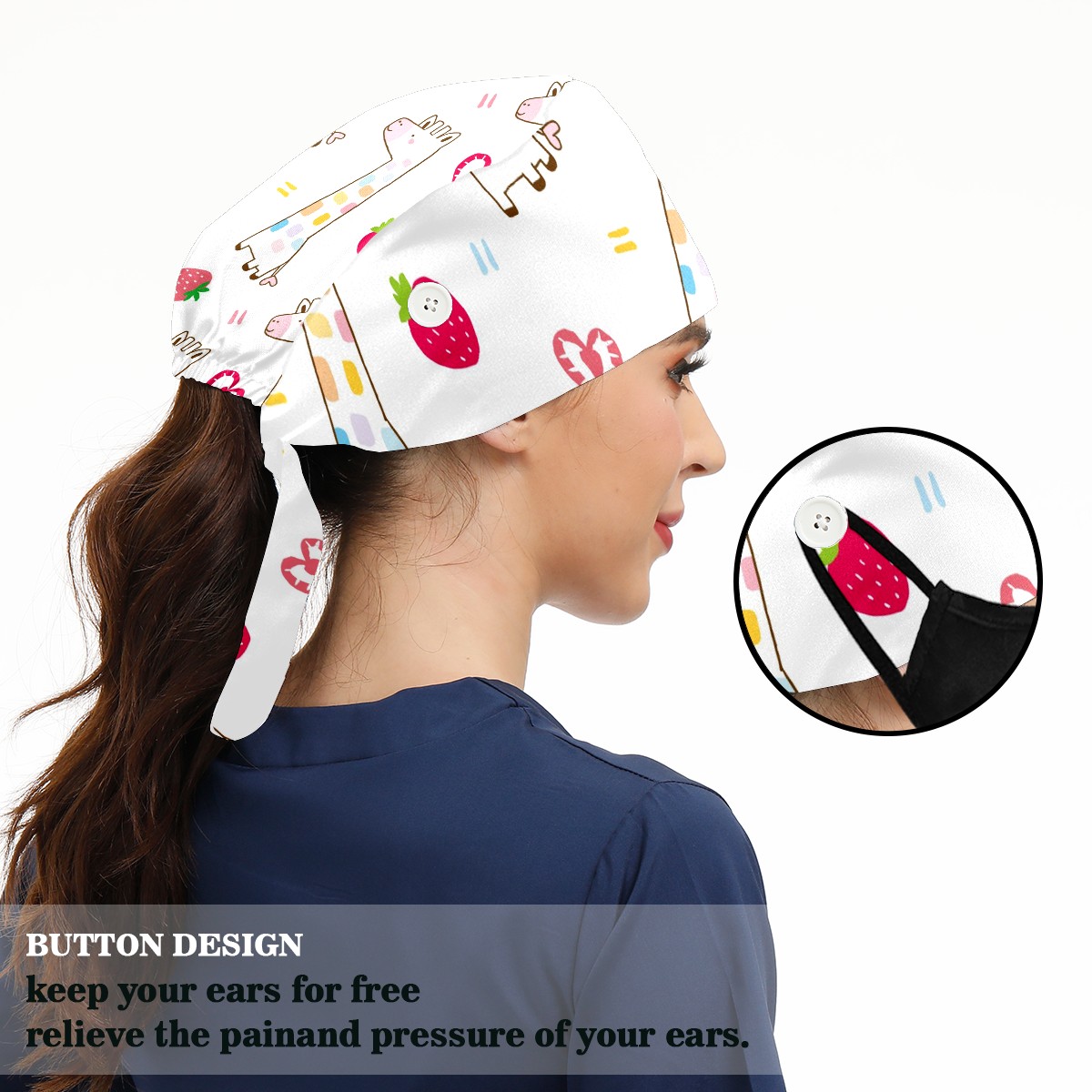 Working Caps with Button & Sweatband Satin Lined Cotton Adjustable Nurse Hats Elastic Band Scrub Cap Surgeon Hat Cute Giraffe And Strawberry