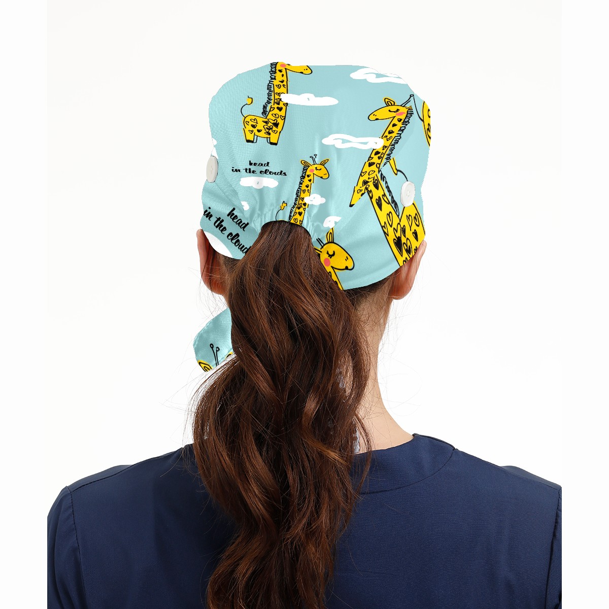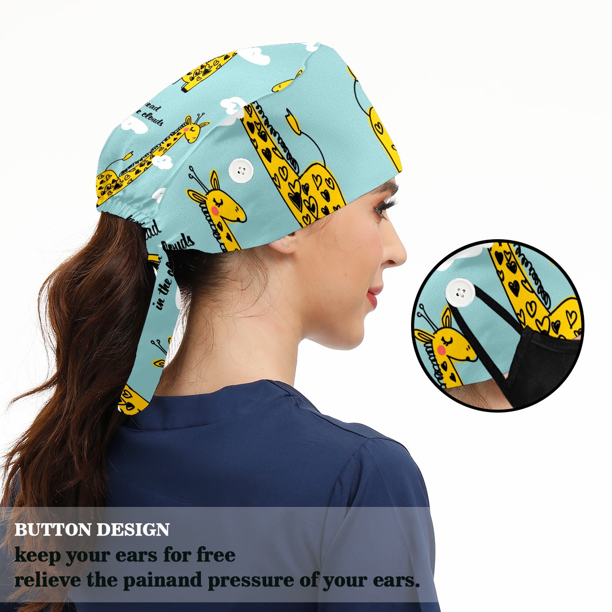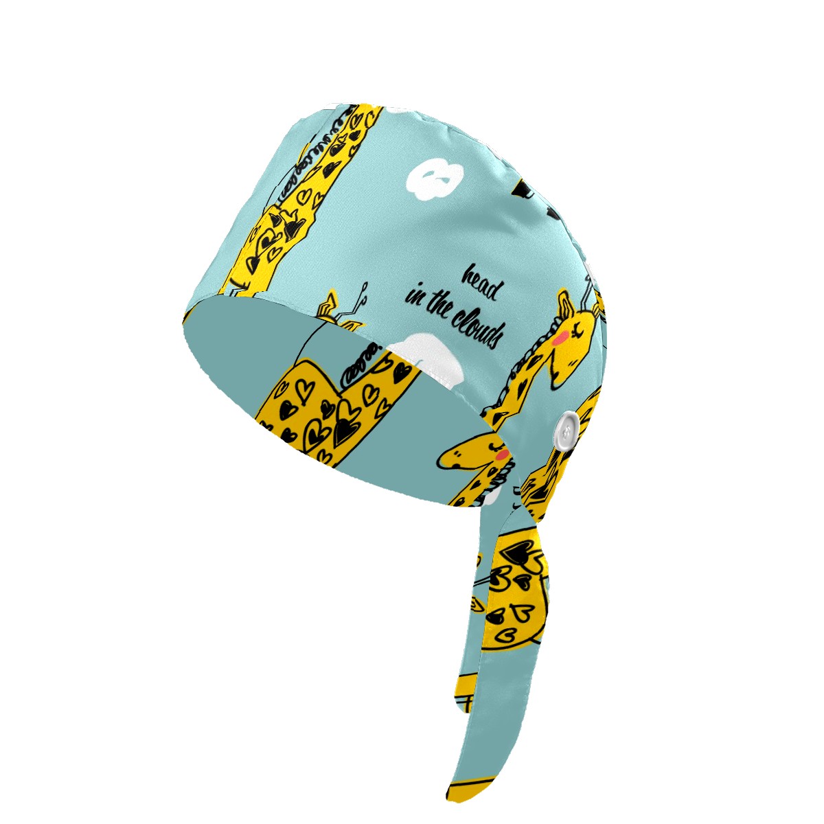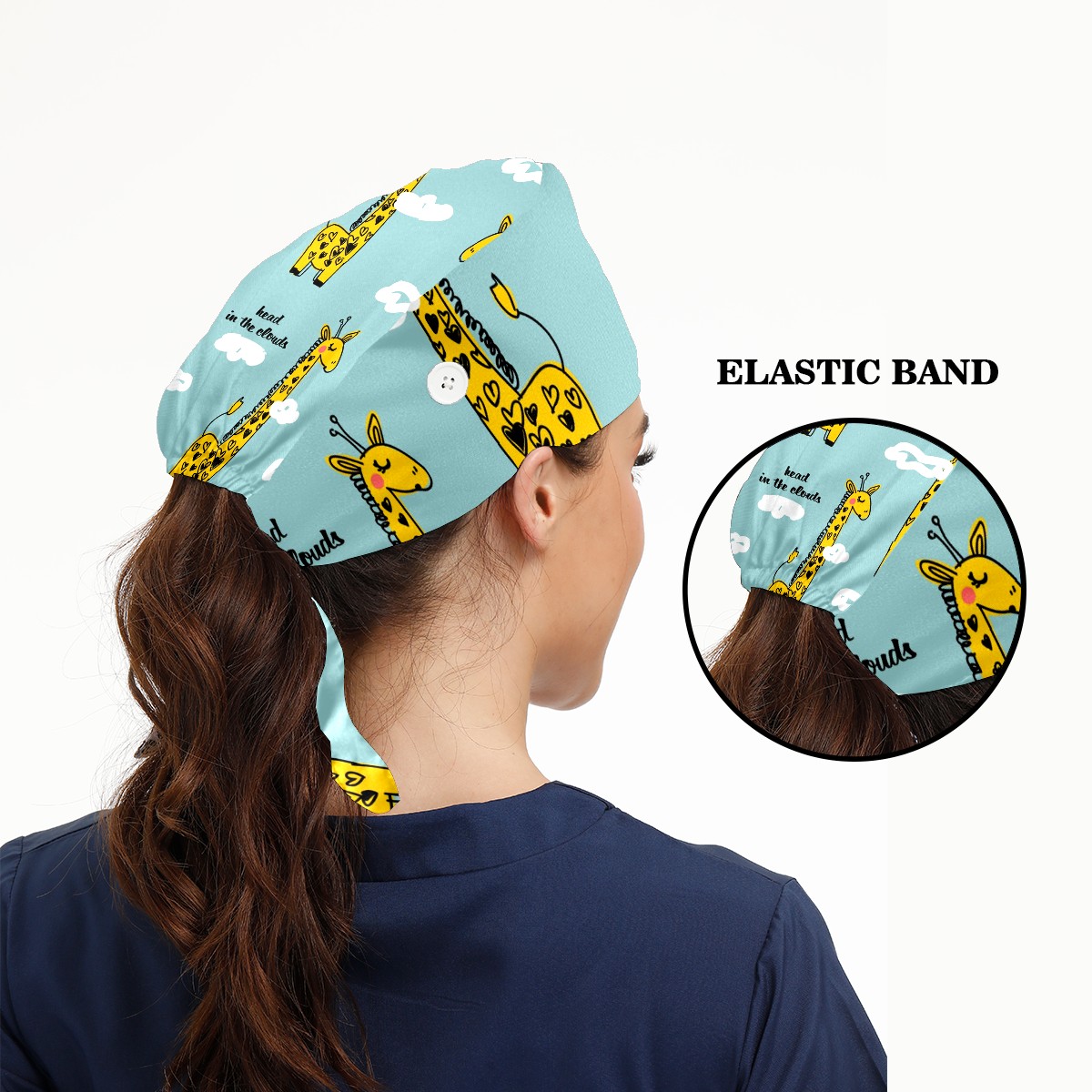 Working Caps with Button & Sweatband Satin Lined Cotton Adjustable Nurse Hats Elastic Band Scrub Cap Surgeon Hat Cute Giraffe And Cloud