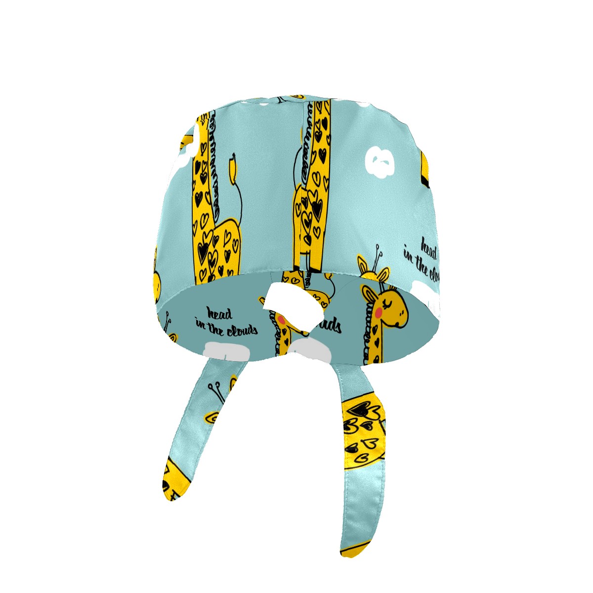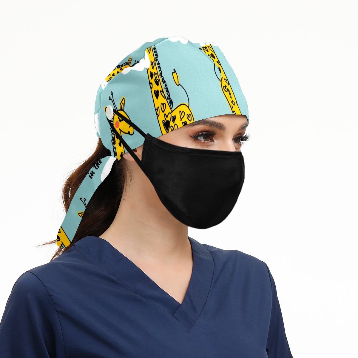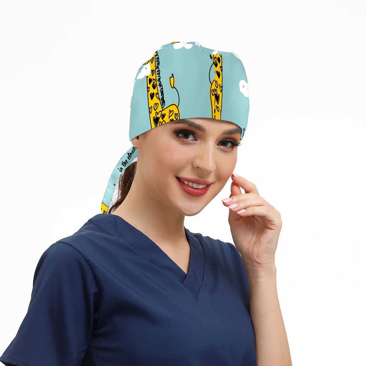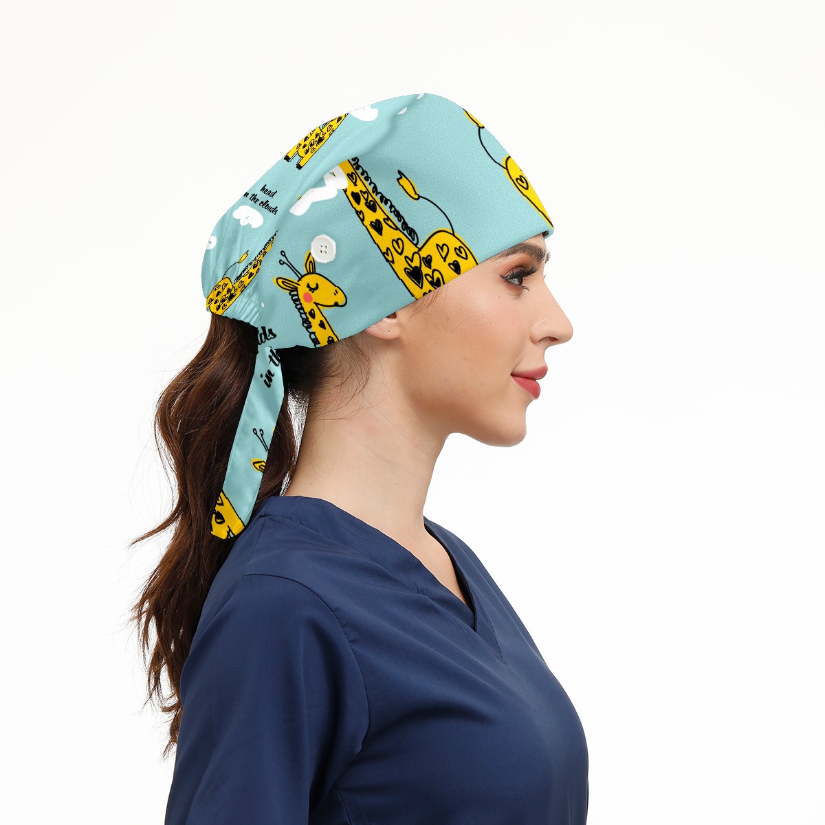 Working Caps with Button & Sweatband Satin Lined Cotton Adjustable Nurse Hats Elastic Band Scrub Cap Surgeon Hat Cute Giraffe And Cloud