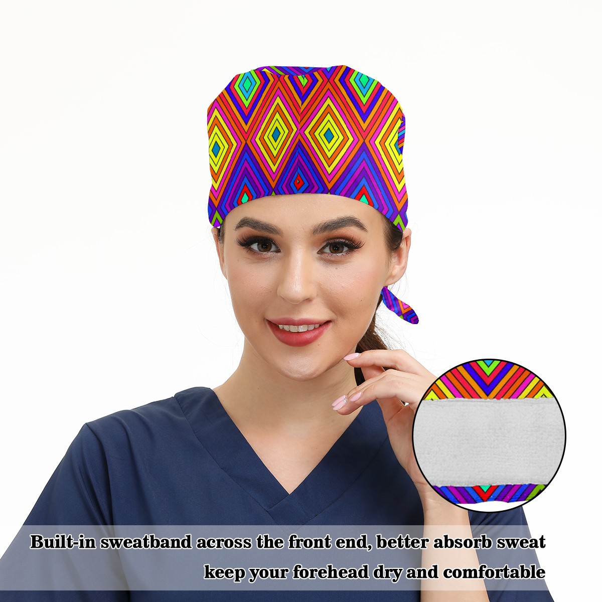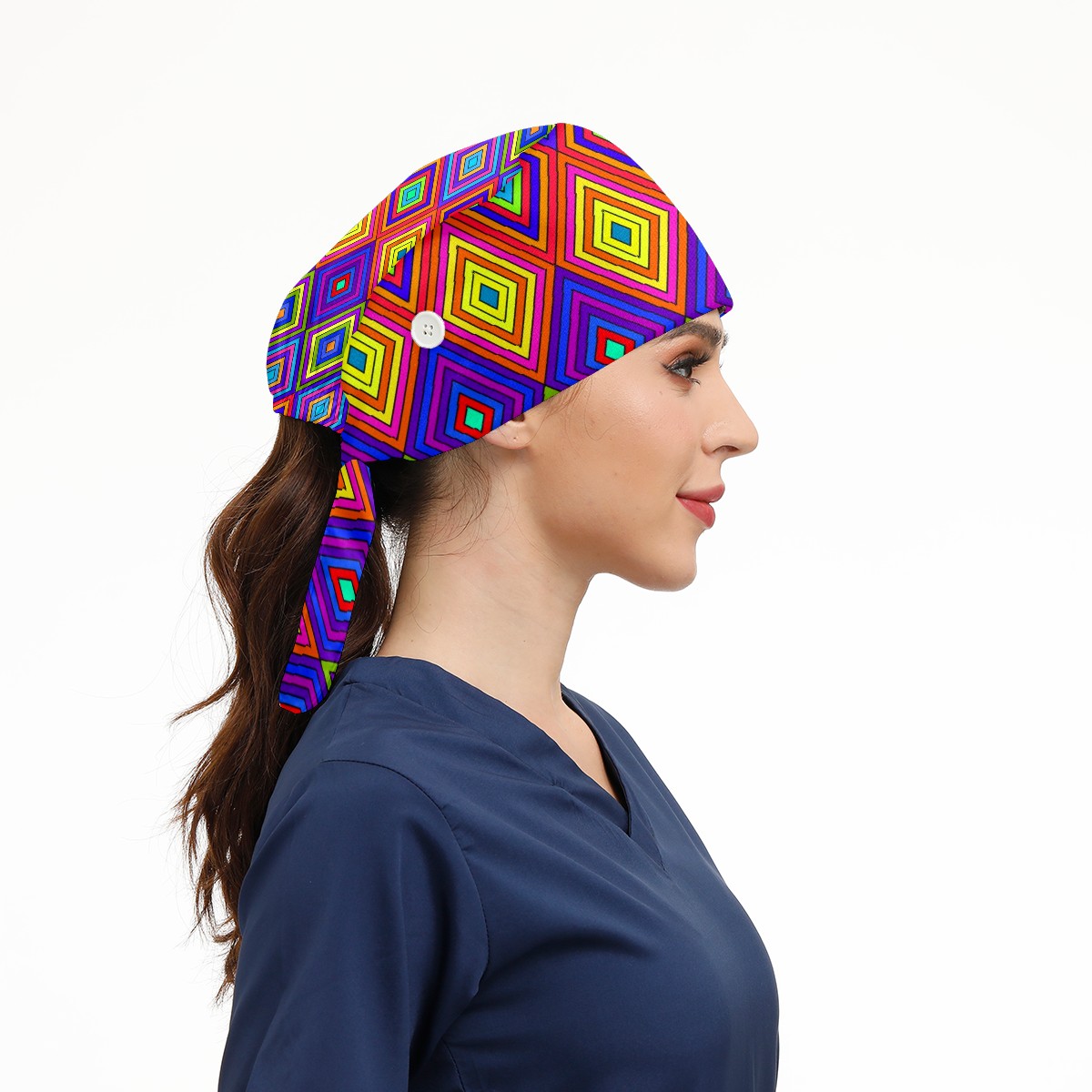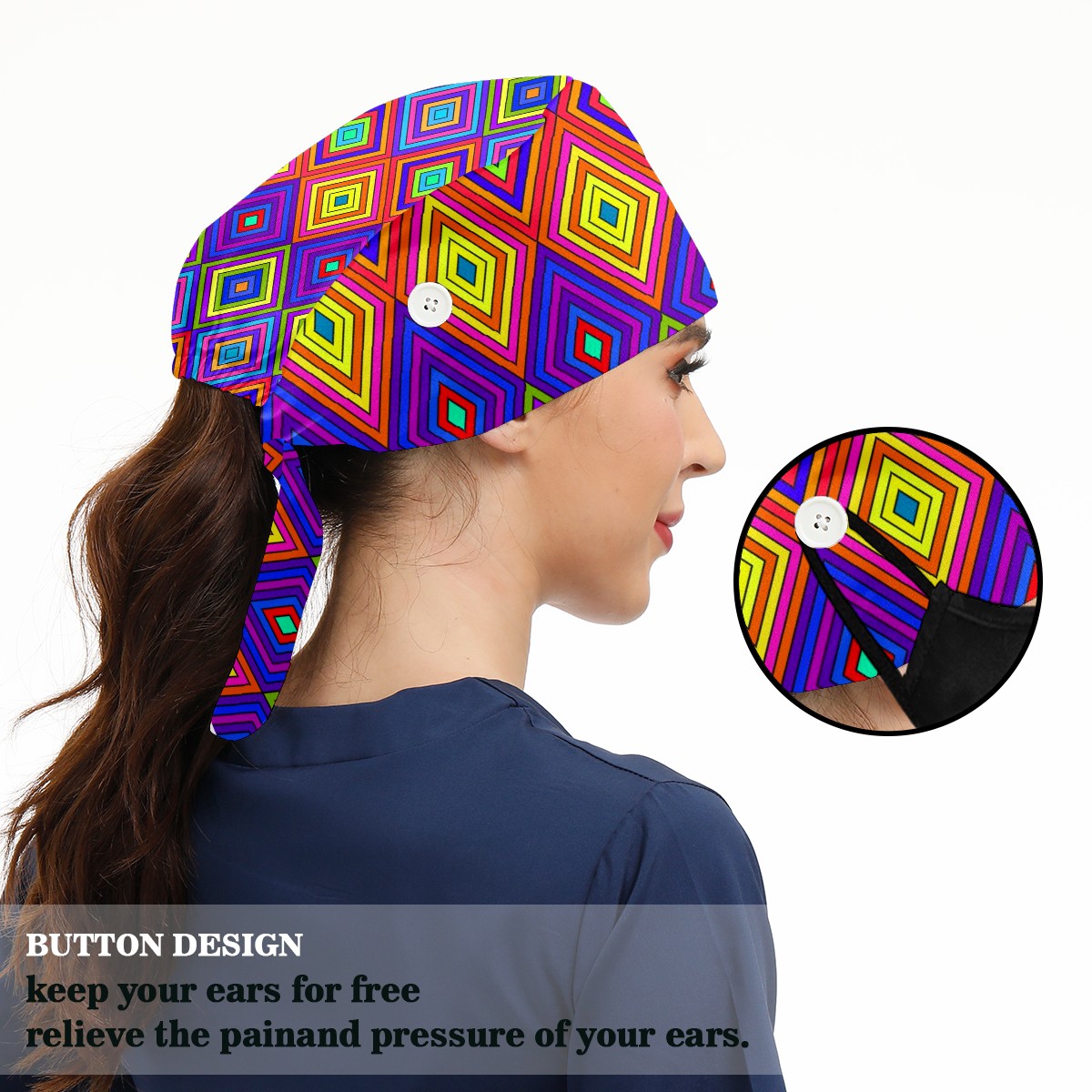 Working Caps with Button & Sweatband Satin Lined Cotton Adjustable Nurse Hats Elastic Band Scrub Cap Surgeon Hat Colorful Psychedelic Squares Pattern