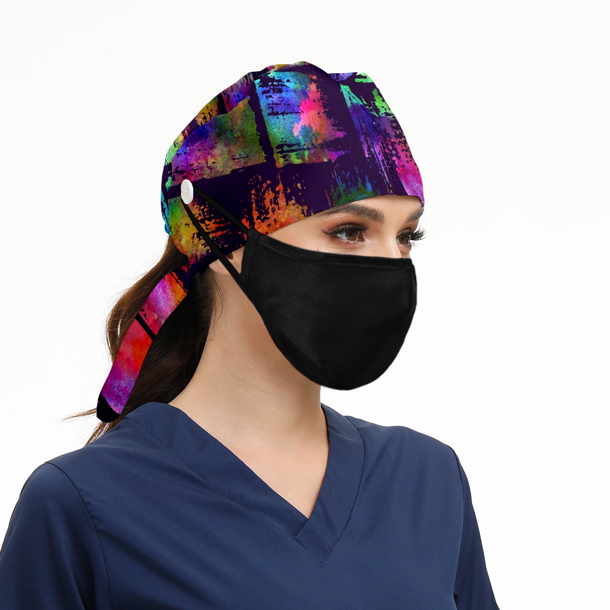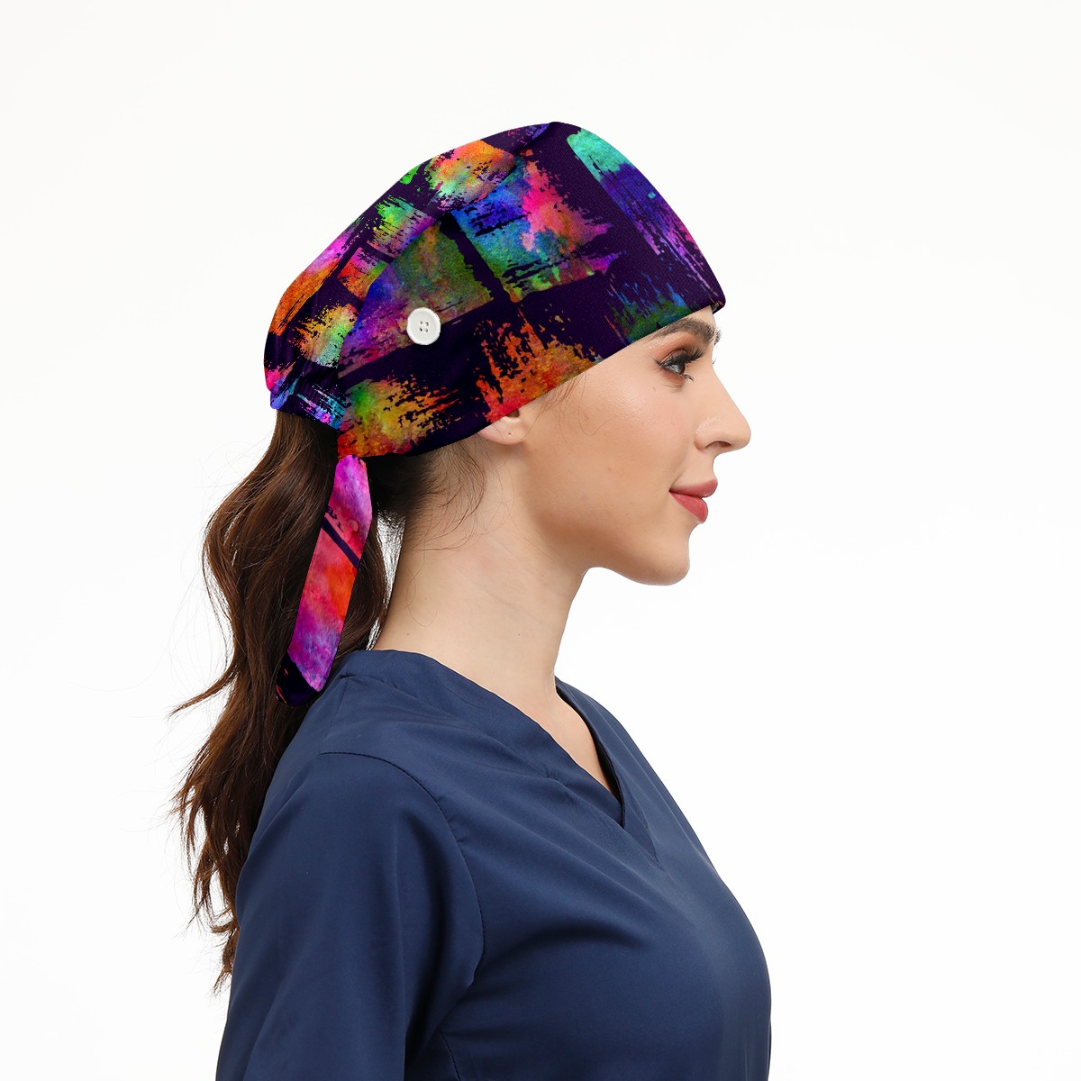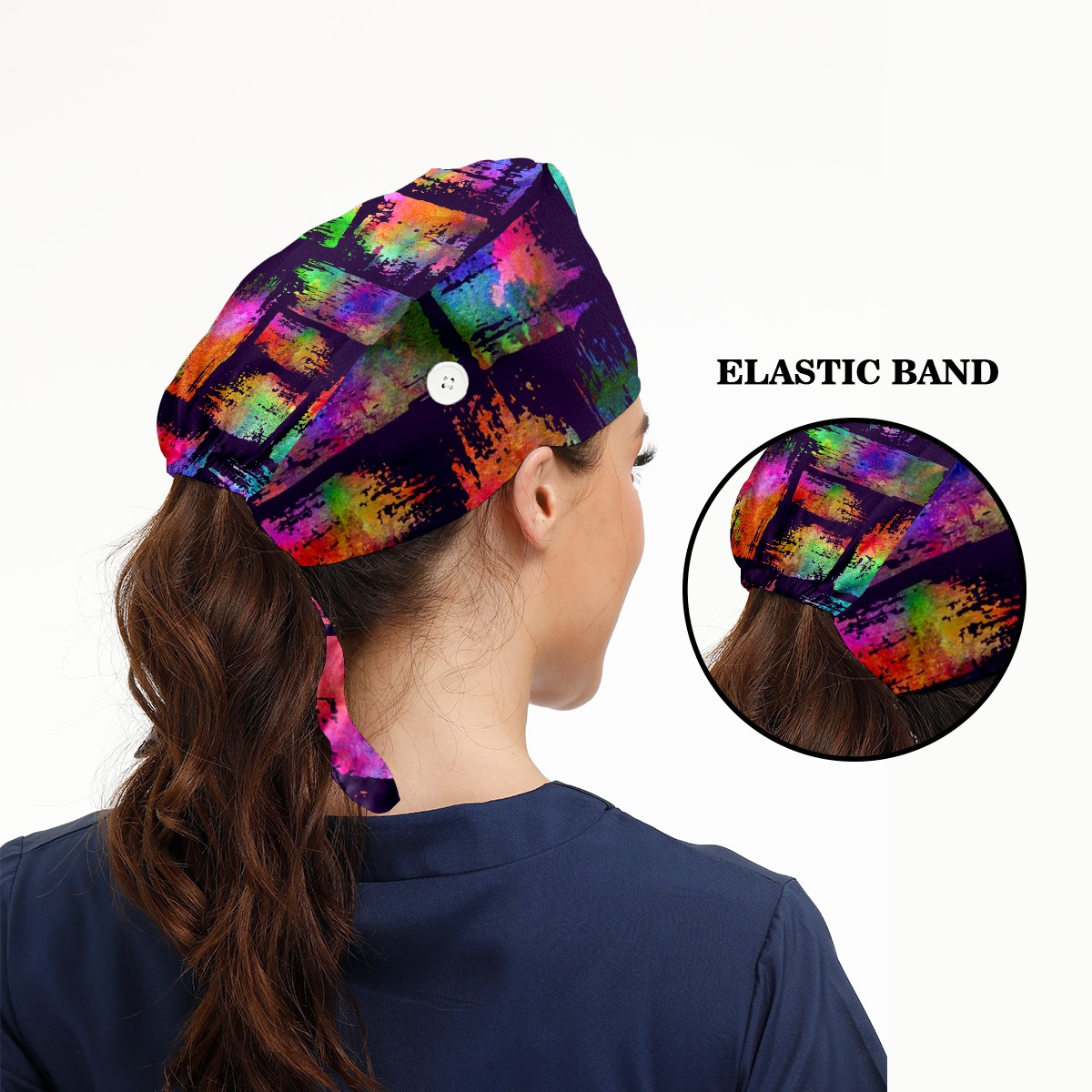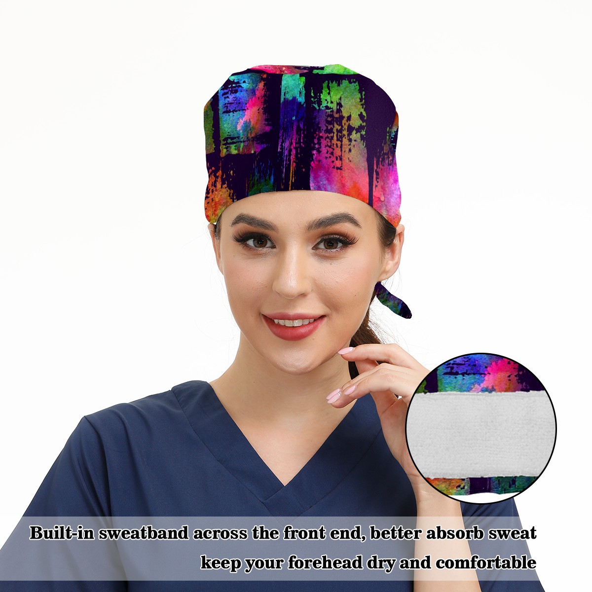 Working Caps with Button & Sweatband Satin Lined Cotton Adjustable Nurse Hats Elastic Band Scrub Cap Surgeon Hat Rainbow Watercolor Color On Violet Background